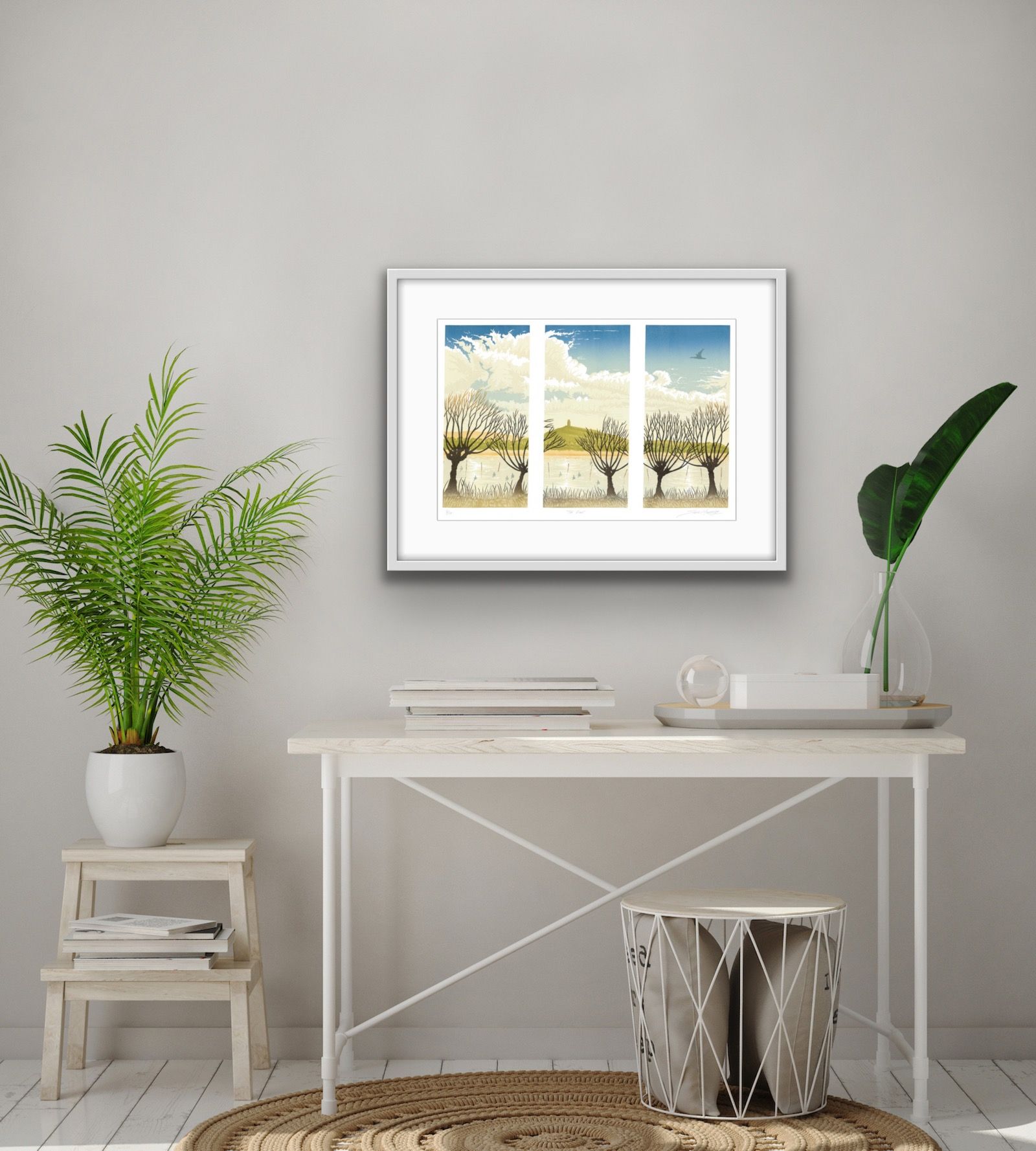 Steve Manning 'Tor View' Limited edition linocut print on Somerset Satin 250gsm paper Edition: 10 Image size: H 30cm x W 47cm Paper size: H 38cm x W 56 cm Unframed. Please note in situ image is purely an indication of how a piece may look. This triptych was inspired by the open landscape of the Somerset Levels.