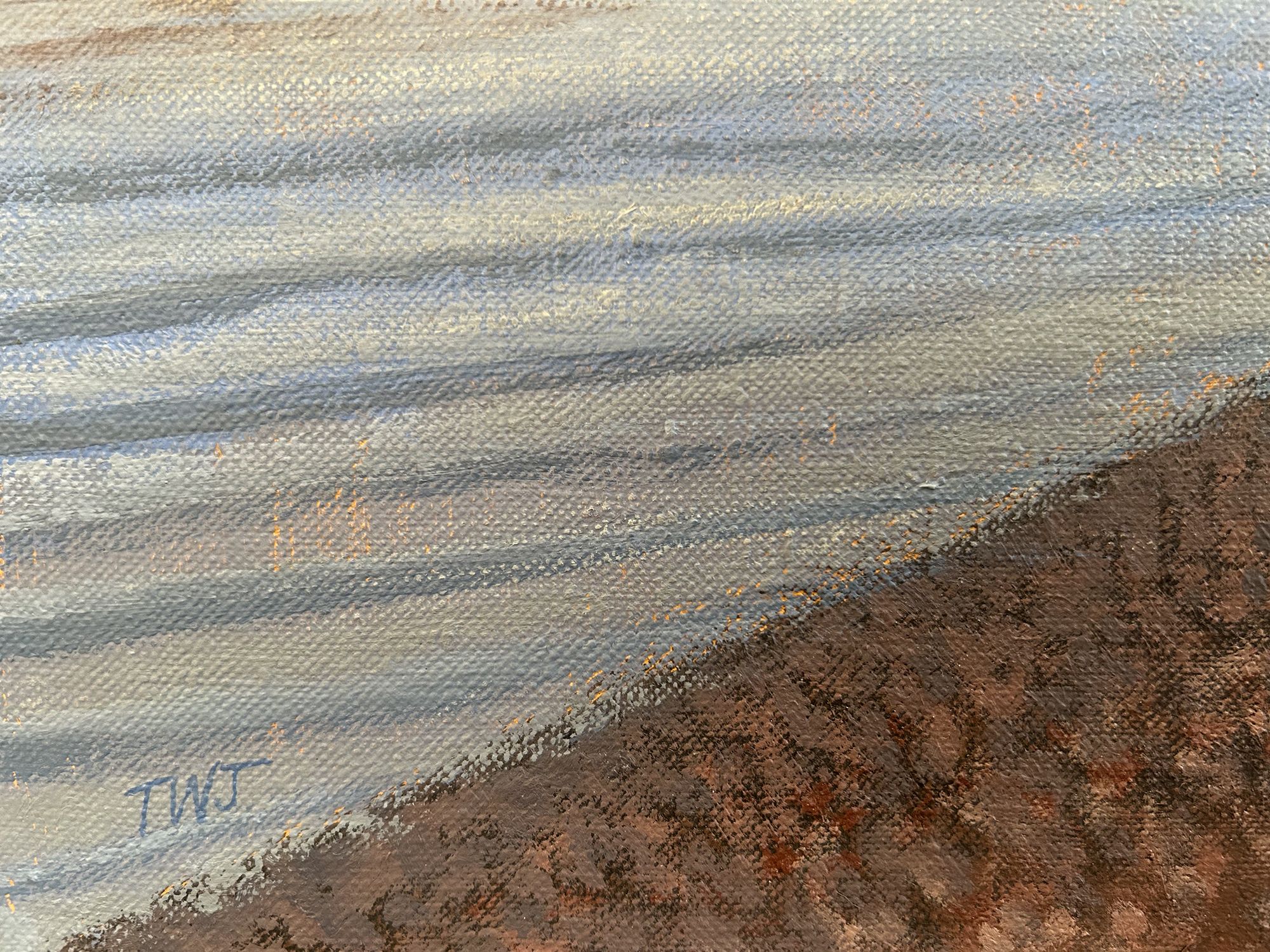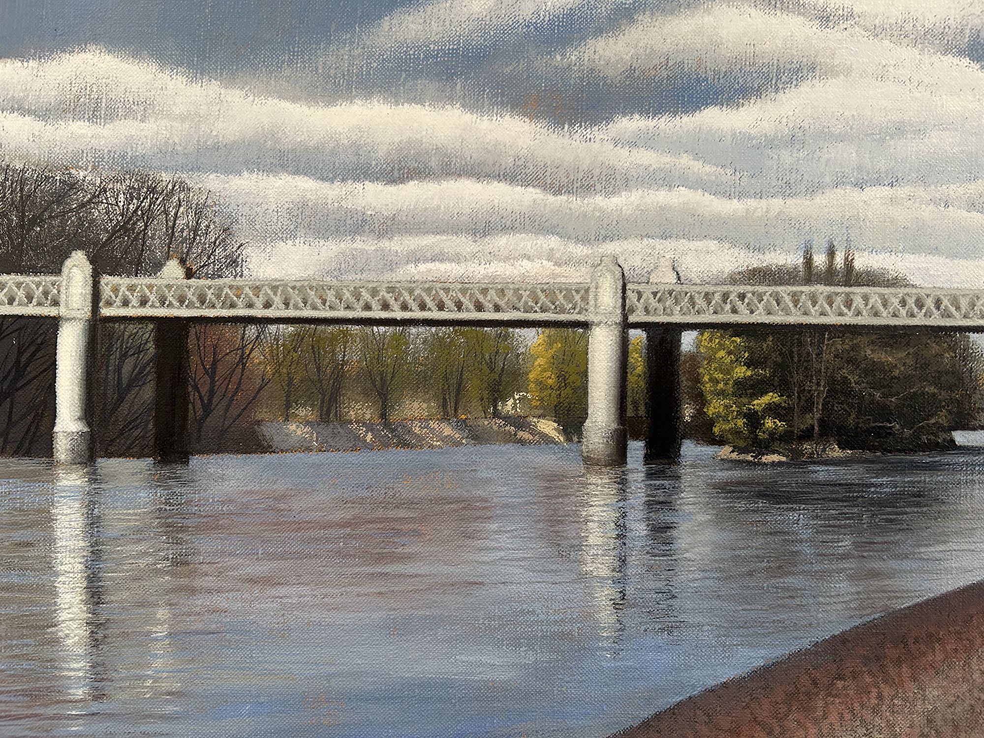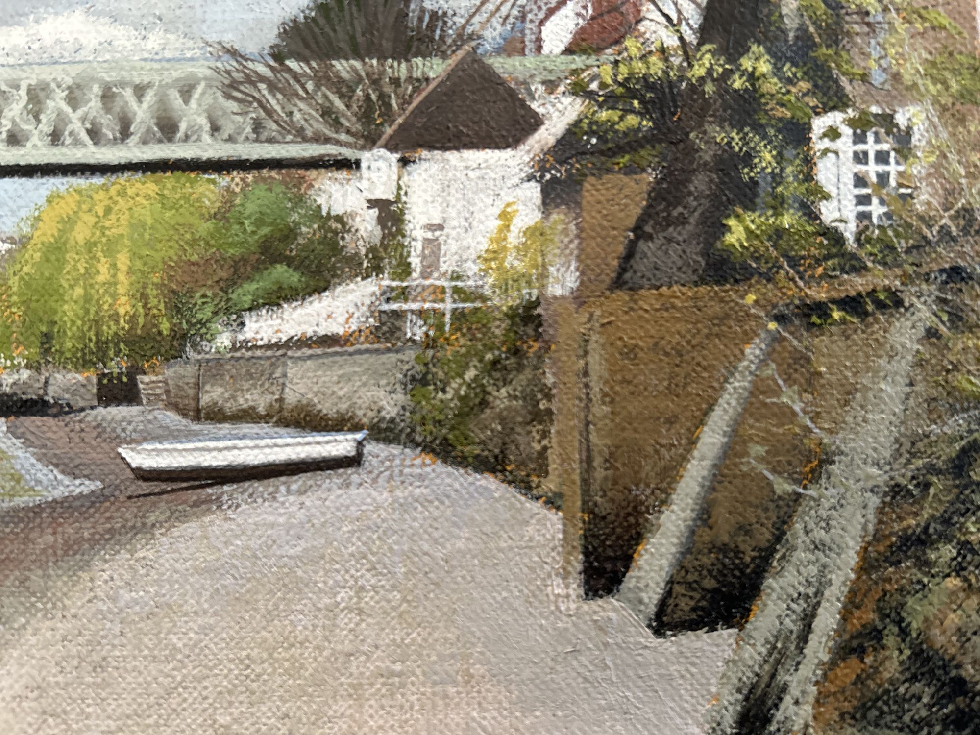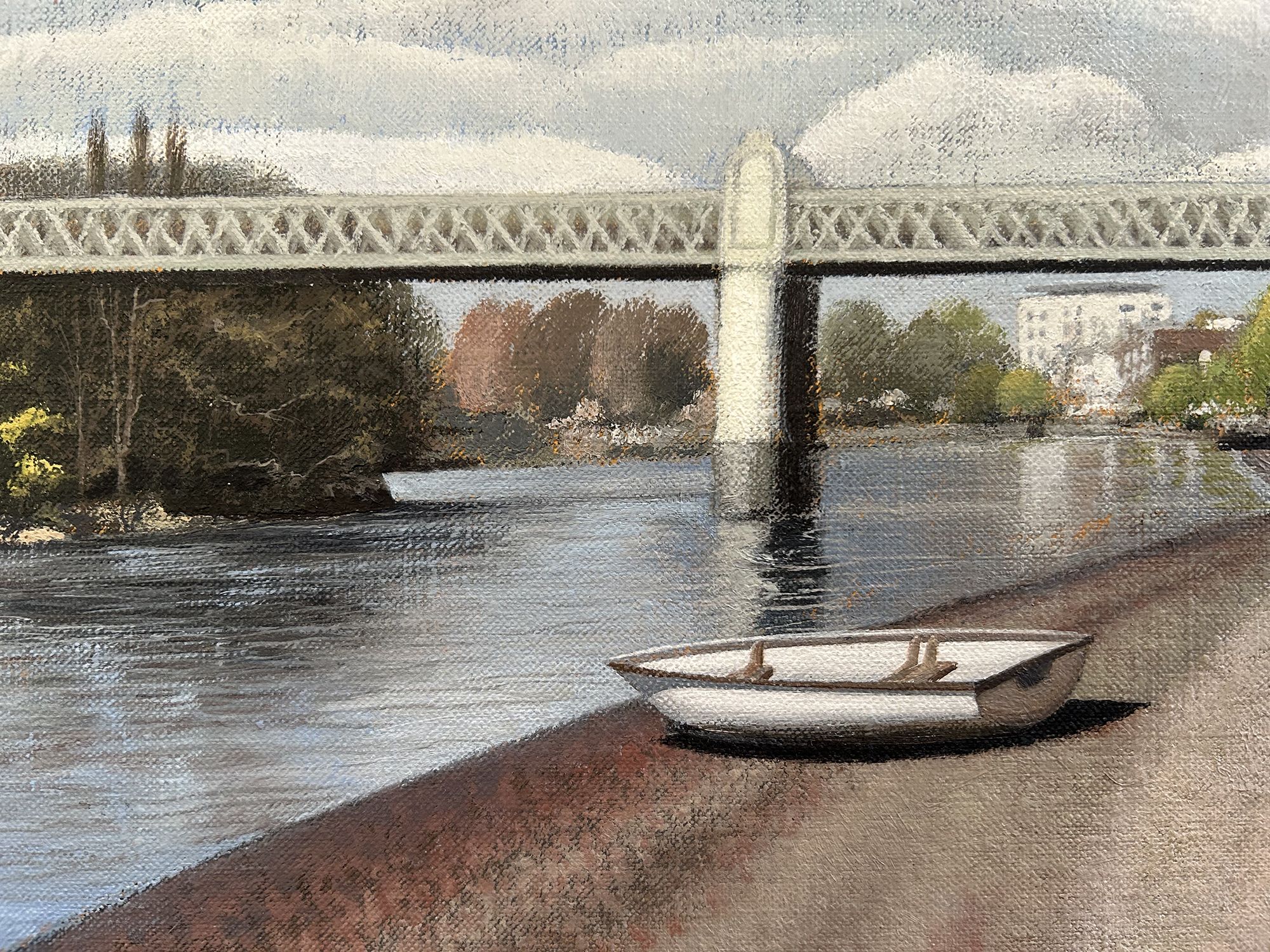 A view of Strand-on-the-Green in Chiswick with Kew railway bridge in the foreground. Low tide in mid April. Additional information:Oil on Canvas79 H x 48.5 W x 3 D cm (31.10 x 19.09 x 1.18 in)Sold framedImage size: Height: 45.5cm (17.91 in) Width: 76cm (29.92 in) Complete size of unframed painting Height: 45.5cm (17.91 in) Width:
