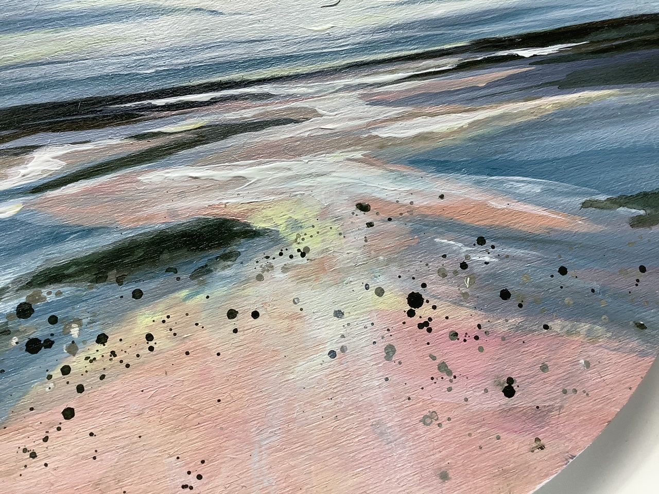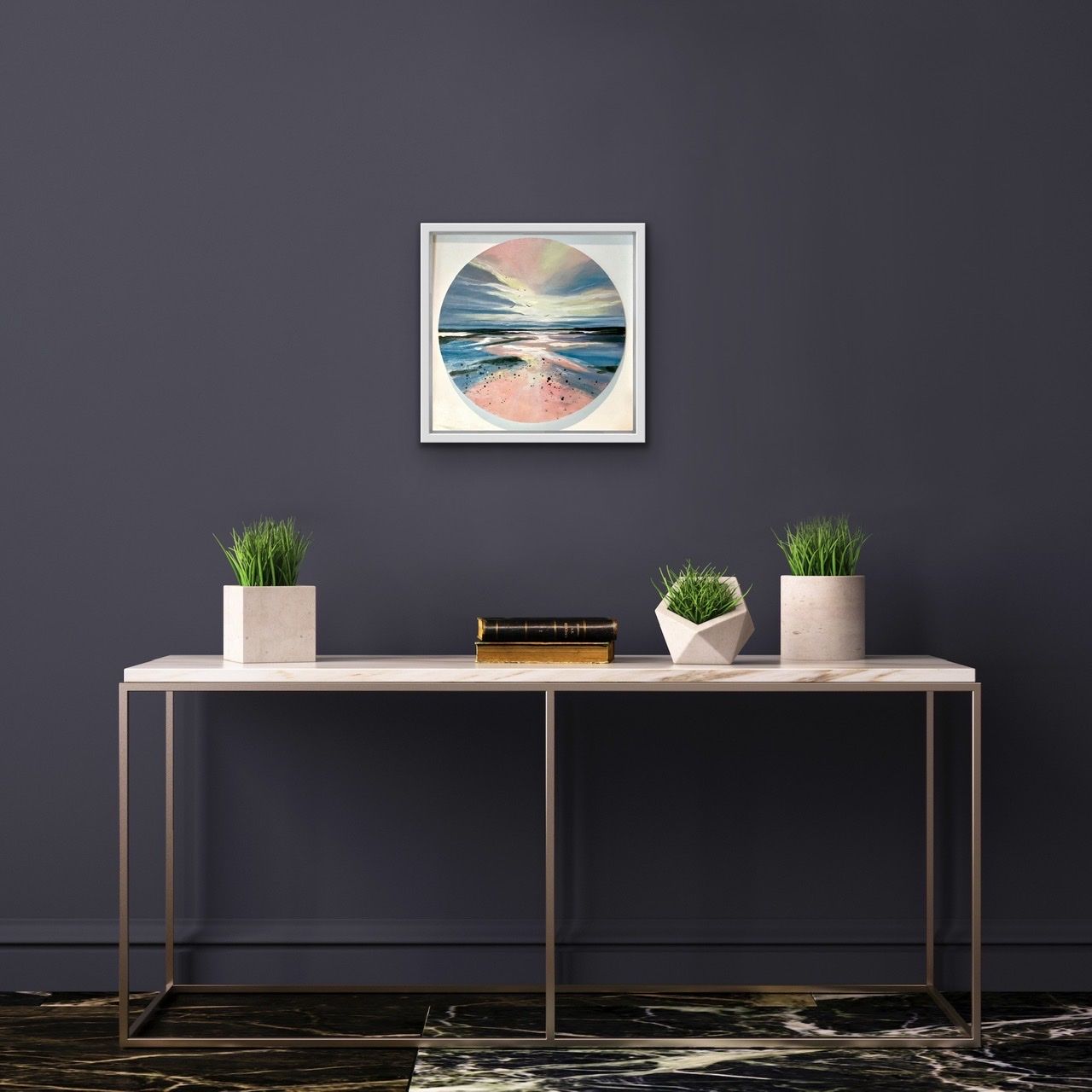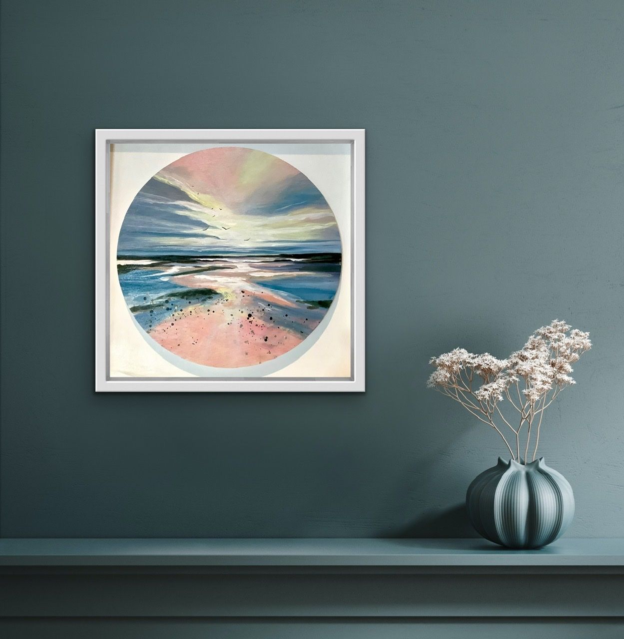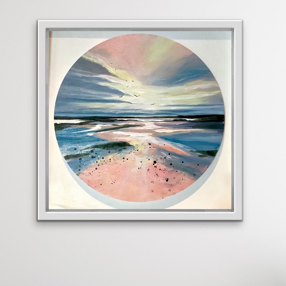 Summer Breeze is an original acrylic and acrylic ink seascape by contemporary artist Adele Riley. This semi abstract expressive seascape is rich in colour and mood. With a soft and calming palette of pinks and yellows, the warmth of the sunset radiates from this strong expressive tondo. Summer Breeze is