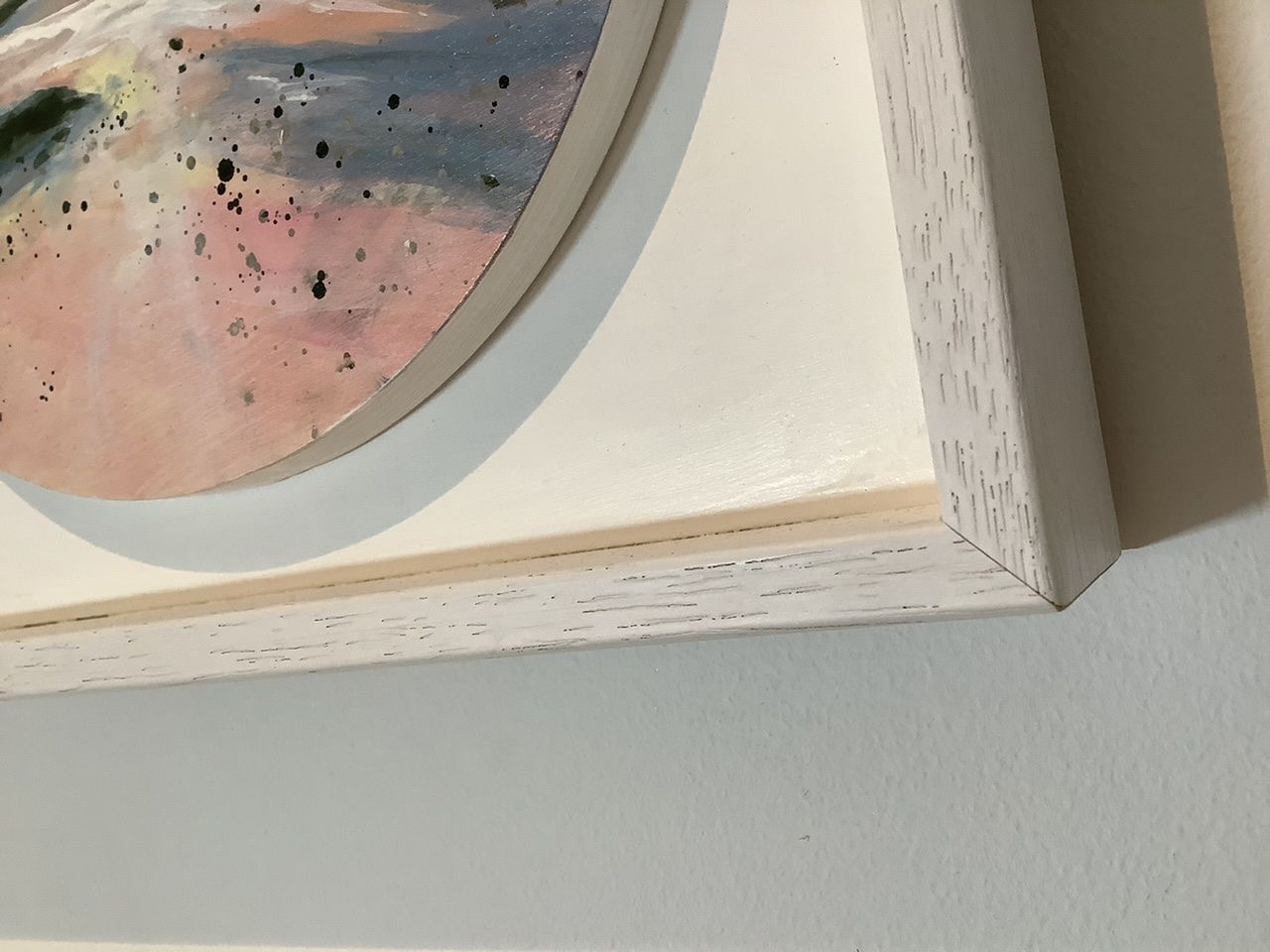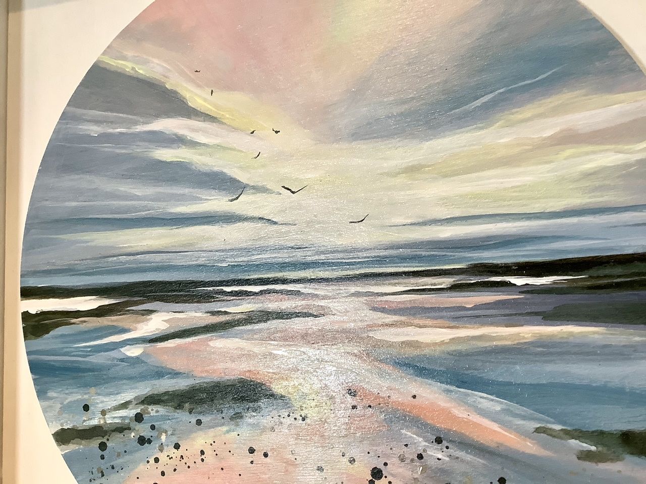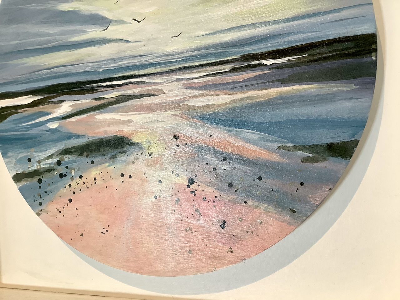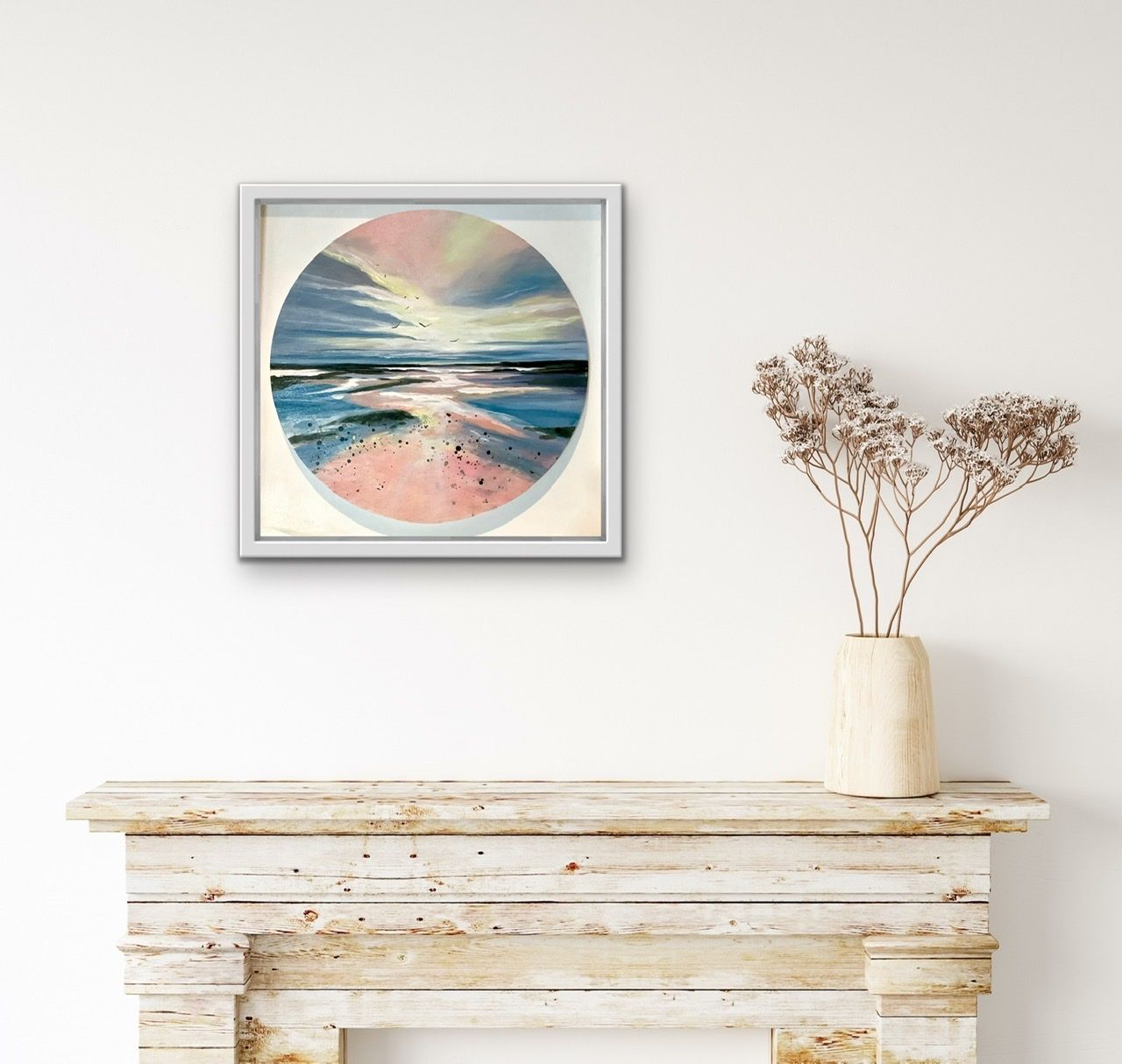 Summer Breeze is an original acrylic and acrylic ink seascape by contemporary artist Adele Riley. This semi abstract expressive seascape is rich in colour and mood. With a soft and calming palette of pinks and yellows, the warmth of the sunset radiates from this strong expressive tondo. Summer Breeze is