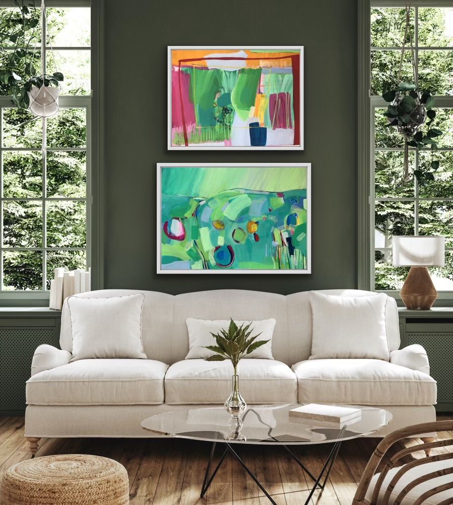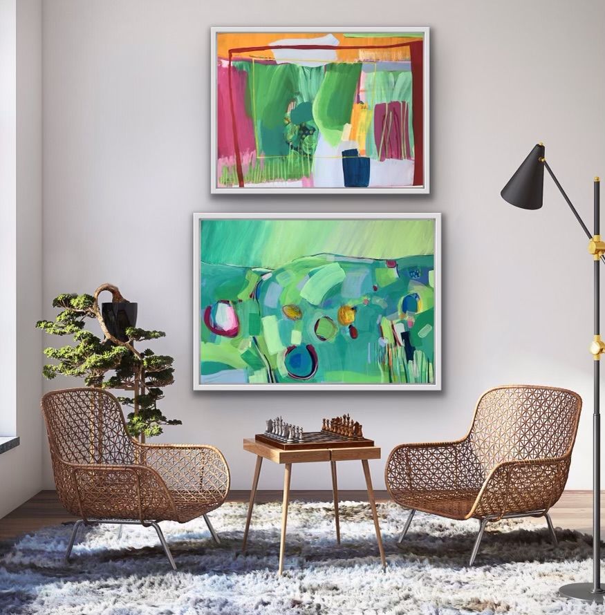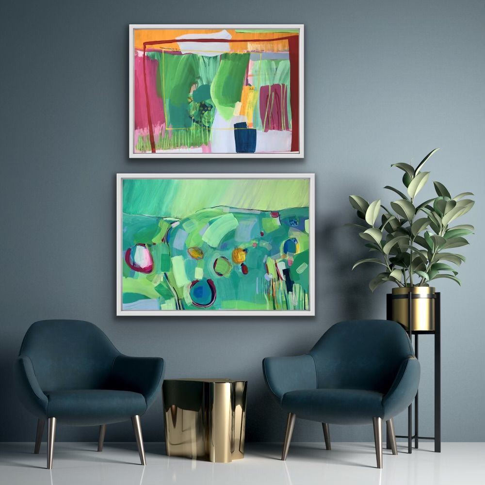 Complete size of diptych: H:136 x W:186cm x D:6 Please note Summer Evening is sold unframed. Original diptych by Rosie Shorrock featuring her signature abstract style inspired by the Wiltshire Downs and the feeling of being surrounded by beautiful countryside.