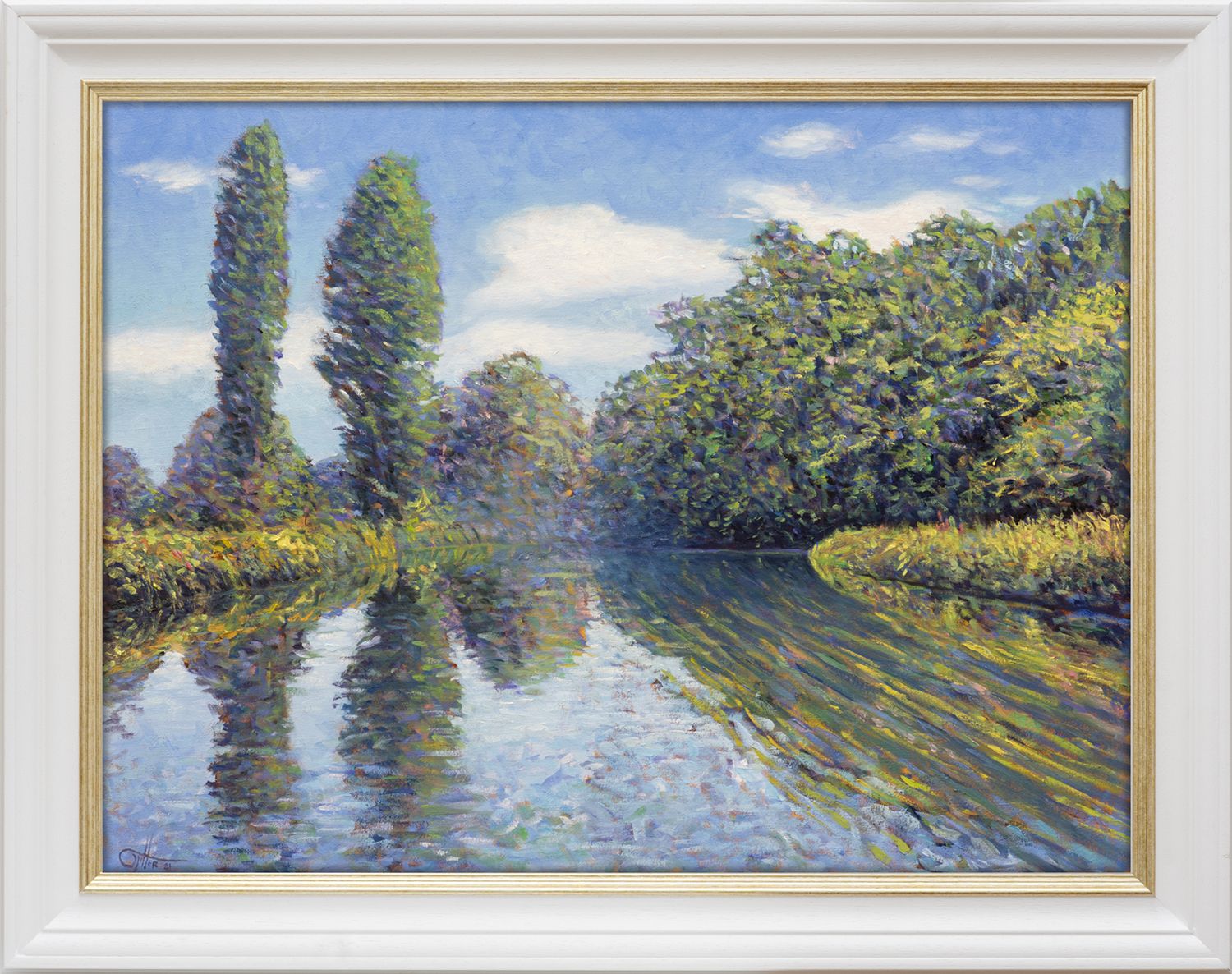 Please note that insitu images are purely an indication of how a piece may look. In ‘Summer on the River (evocation)’ Lee Tiller has used a summery palette of colour, ranging from dusky violets to euphoric golds and lustrous greens. He paints in the same tradition as the original impressionists, painting
