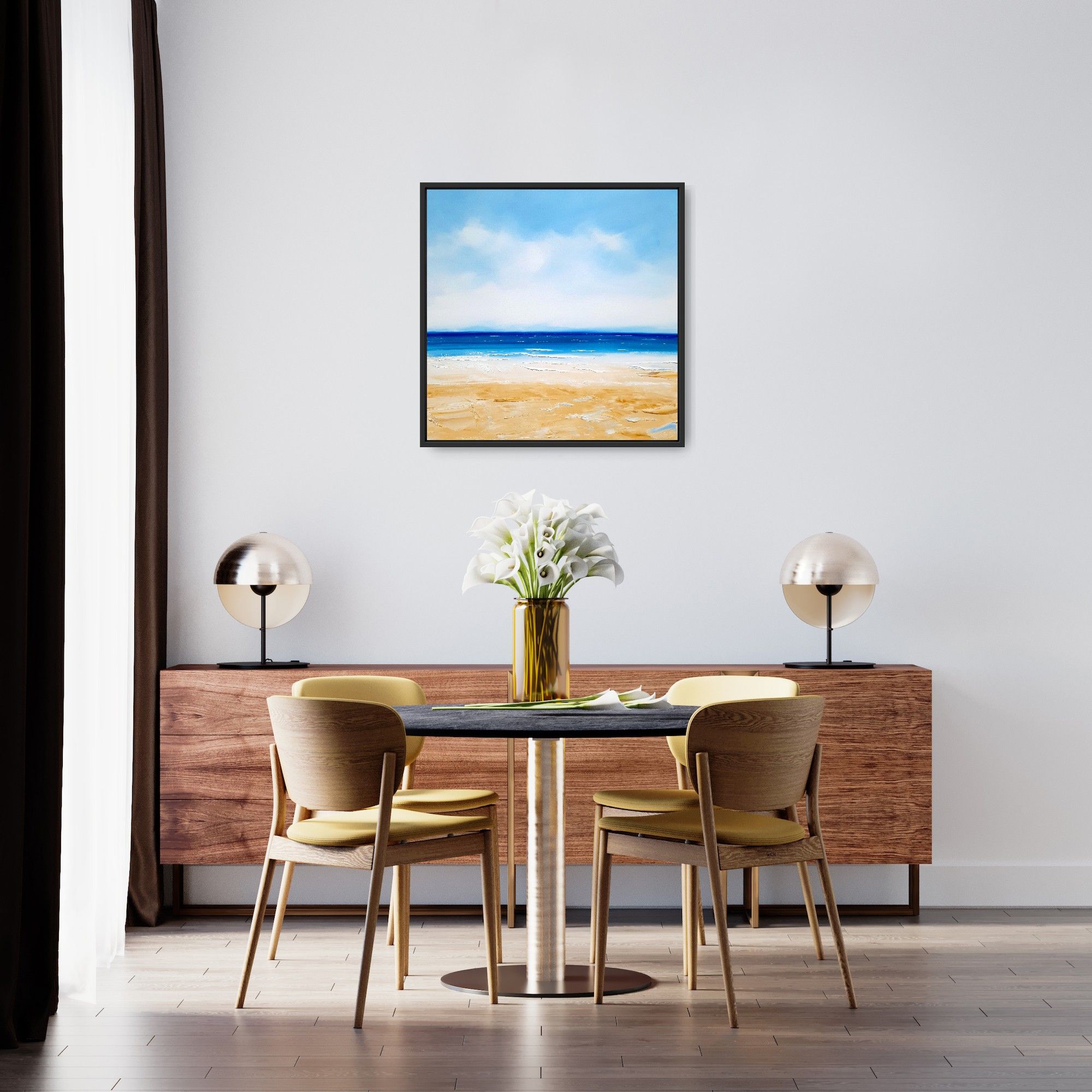 An original oil painting on fine cotton canvas portraying a beautiful summers day on the beach. The distant sea sparkles under the bright sky of the day while gentle waves make their way through the sea and over the sand into the foreground. The vivid blues and greens in the