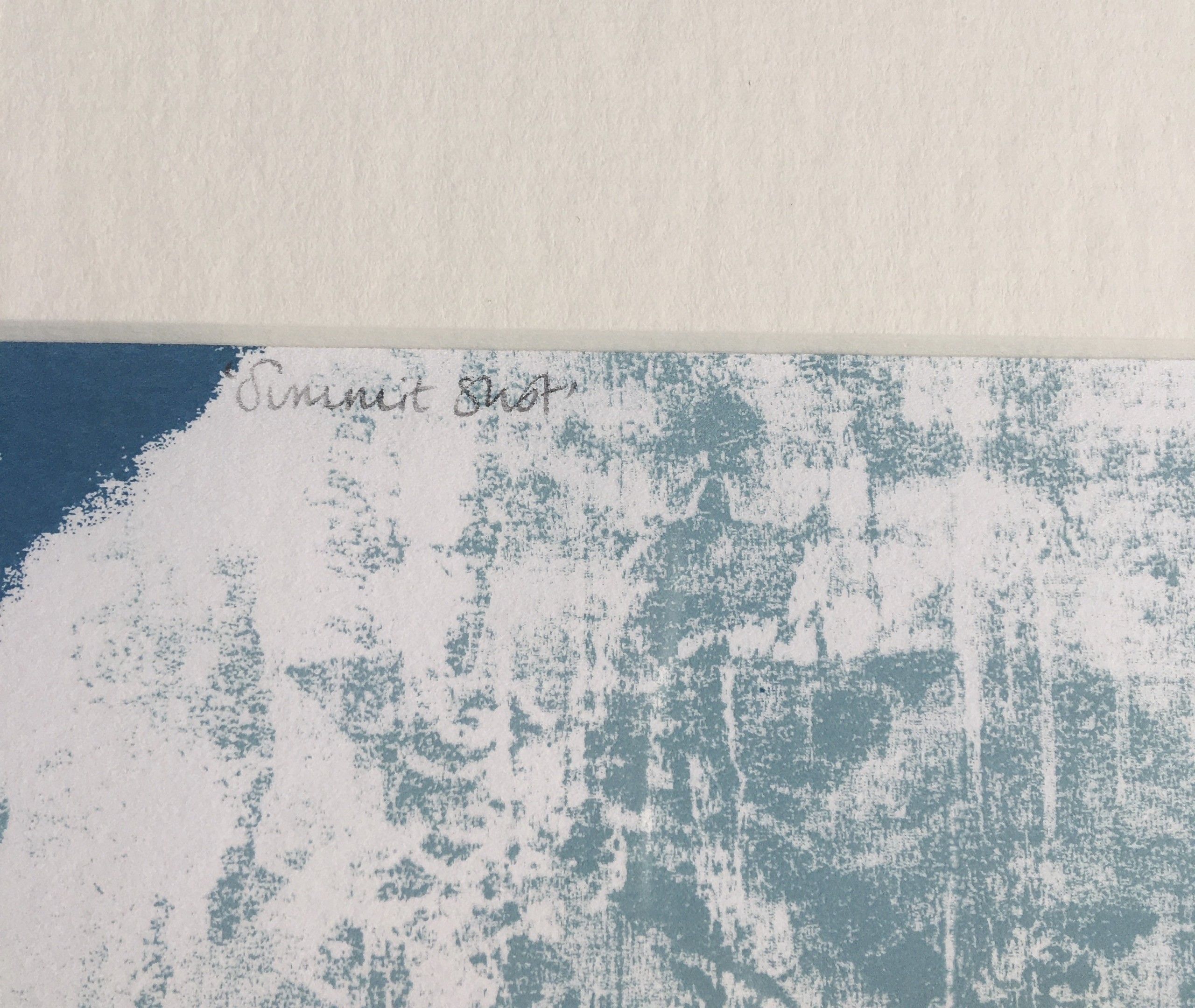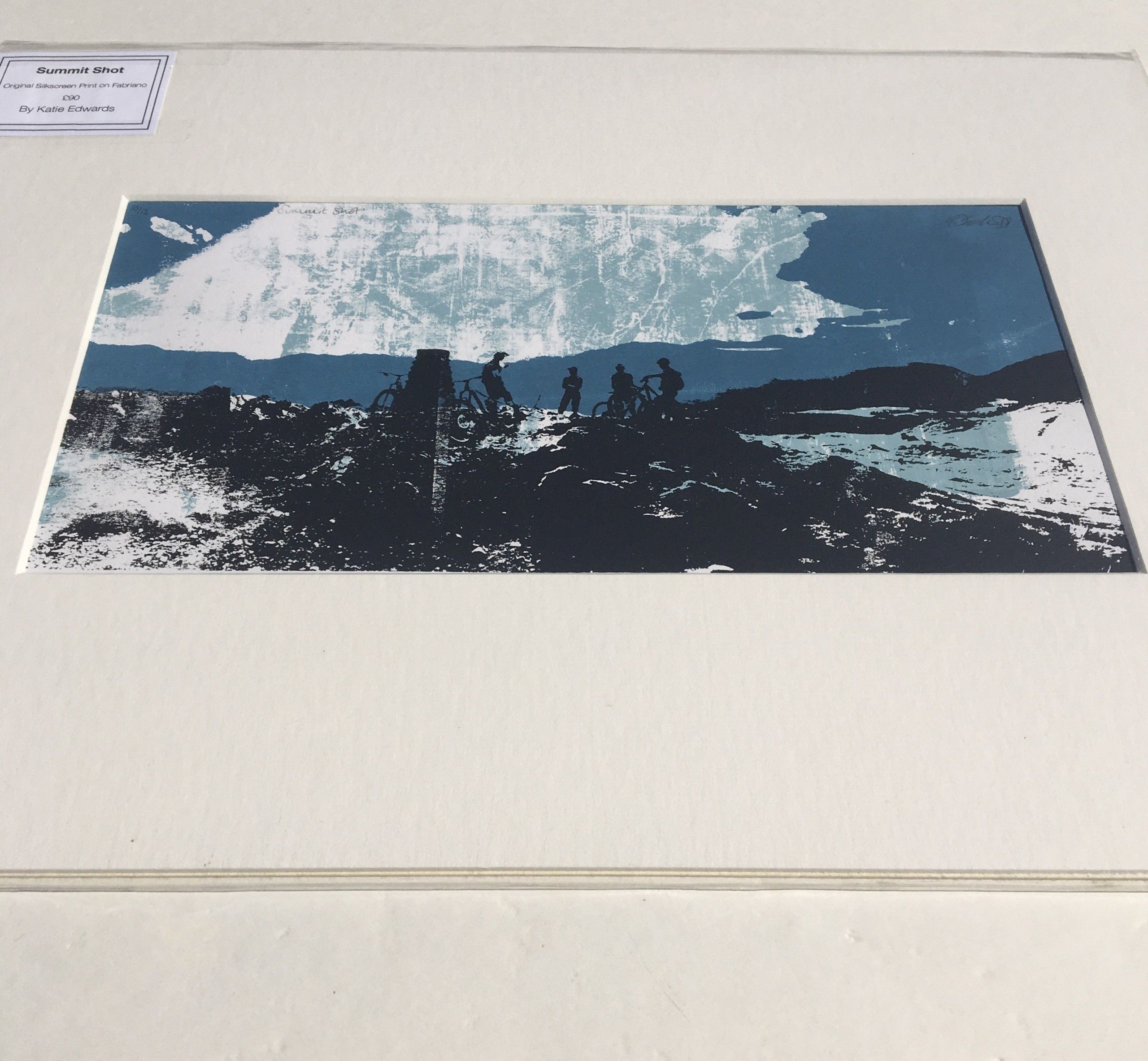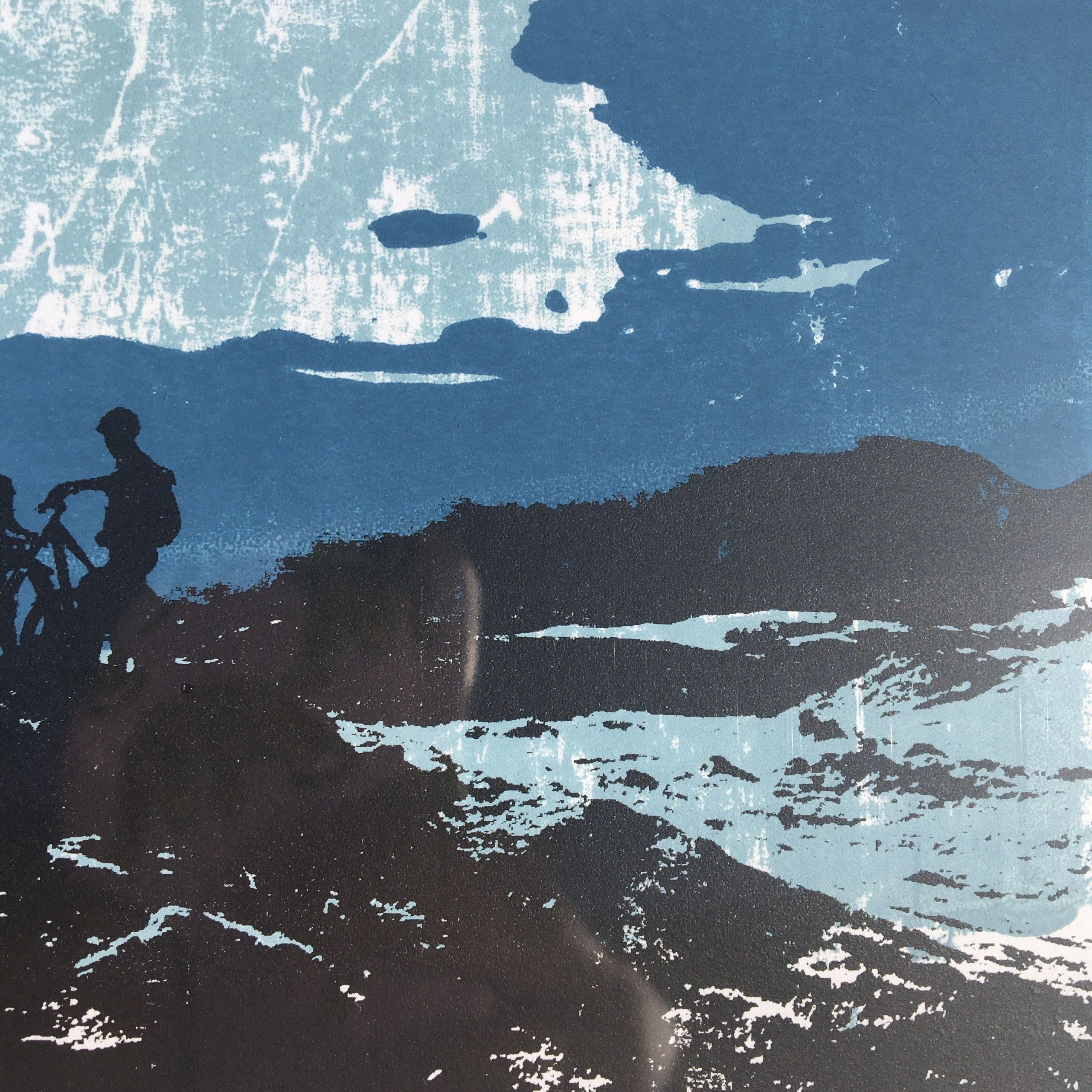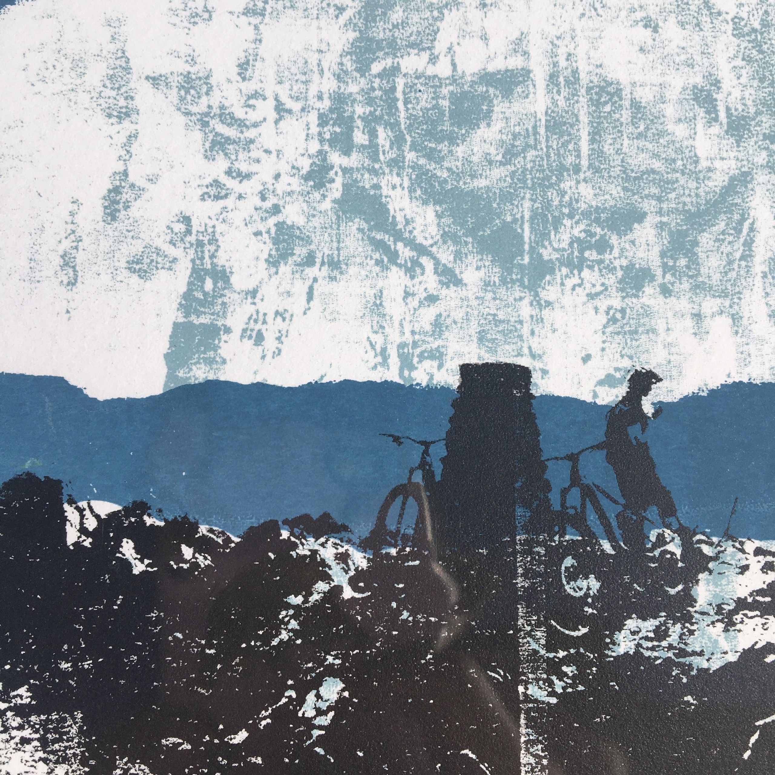 Summit Shot' Original Silkscreen Print by Katie Edwards. This piece is part of a collection of Mountain Bike themed silkscreen prints that came about from a collective project called One More Brew, a group of Lake District mountain biking creatives to get motivated to get creative with their hobby. 'Summit Shot'