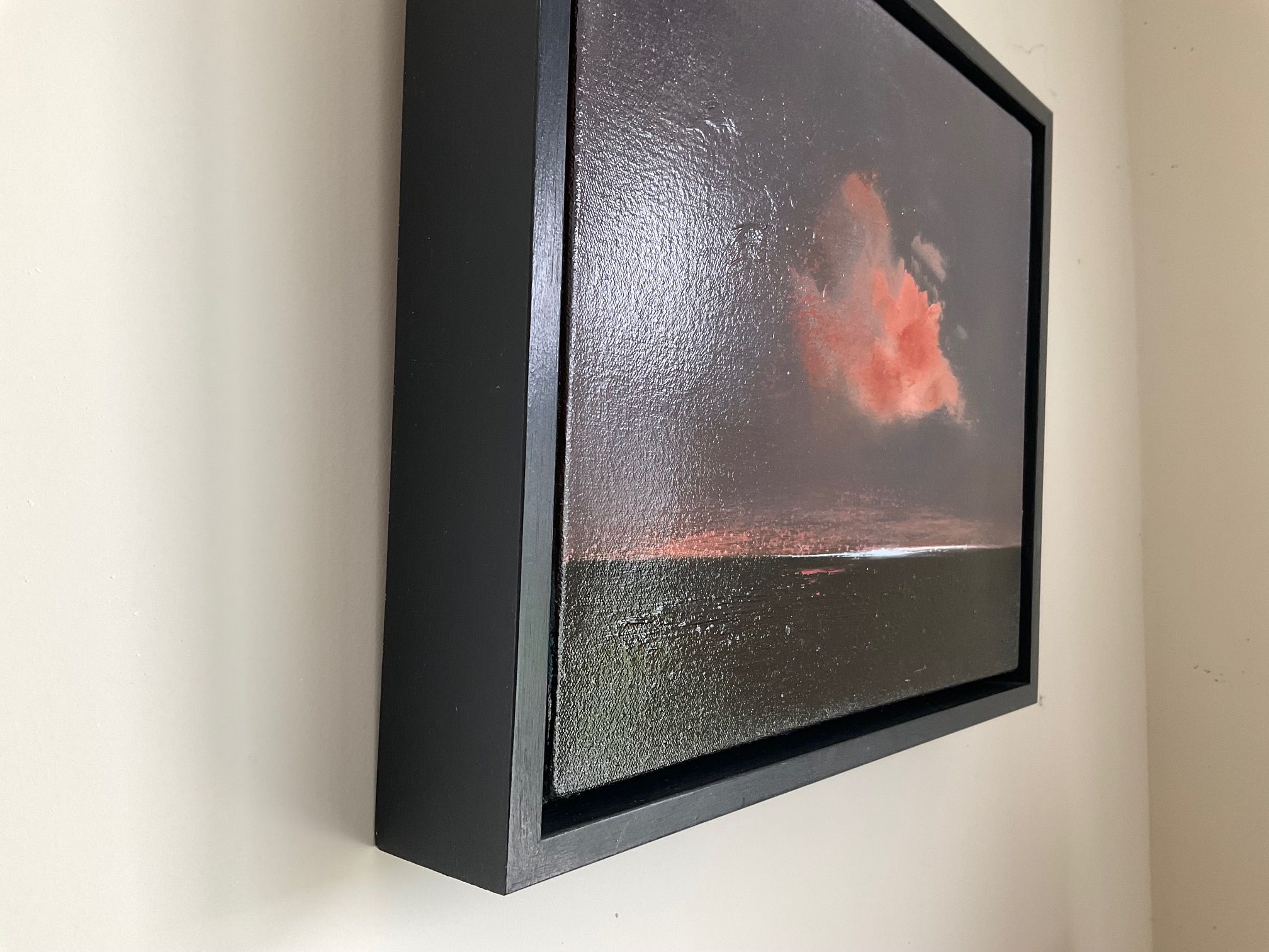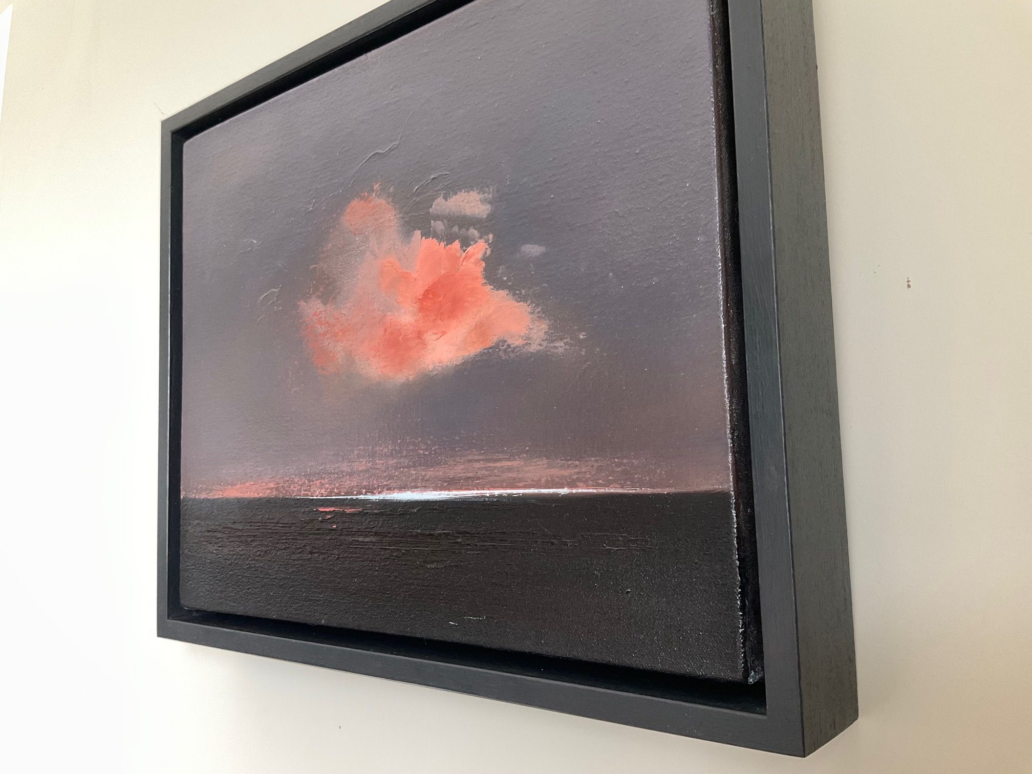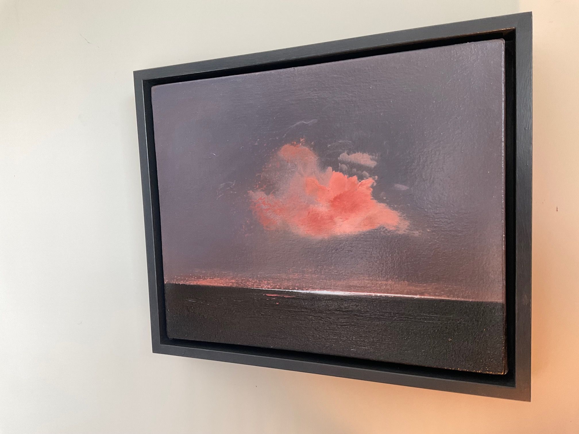 Coastal seascape painting of clouds in the fading sunlight inspired by the colours of sunset. The vibrant colours are of pale blush pinks, pale reds and peach.