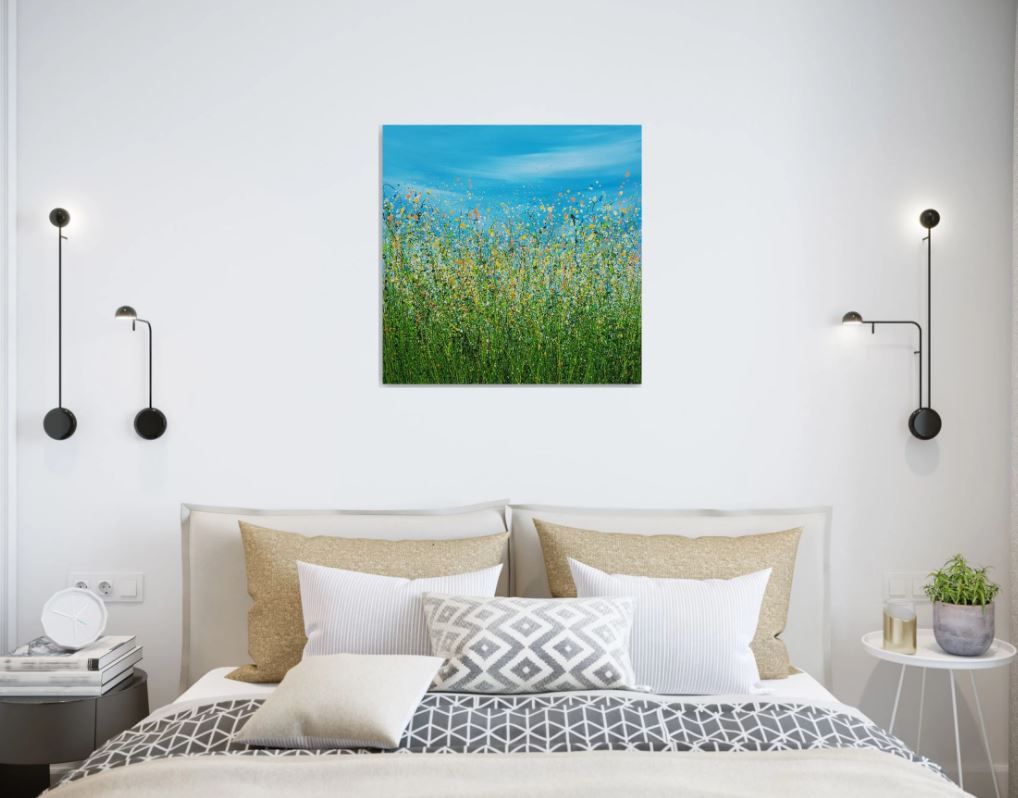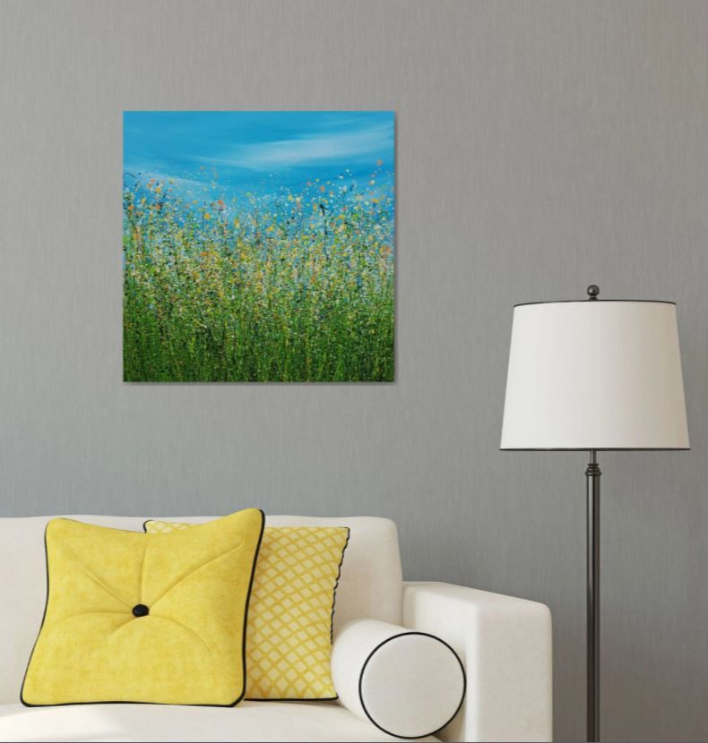 Sunny Side Up #2 - Exclusive to Wychwood. Nothing says spring is here like a popping up of daffodils. An Original semi-abstract painting by Lucy Moore. Using her signature string grass technique Lucy has created a semi-abstract twist to her classic meadow paintings. Colourful yellow flowers beneath a sunlit skyline.