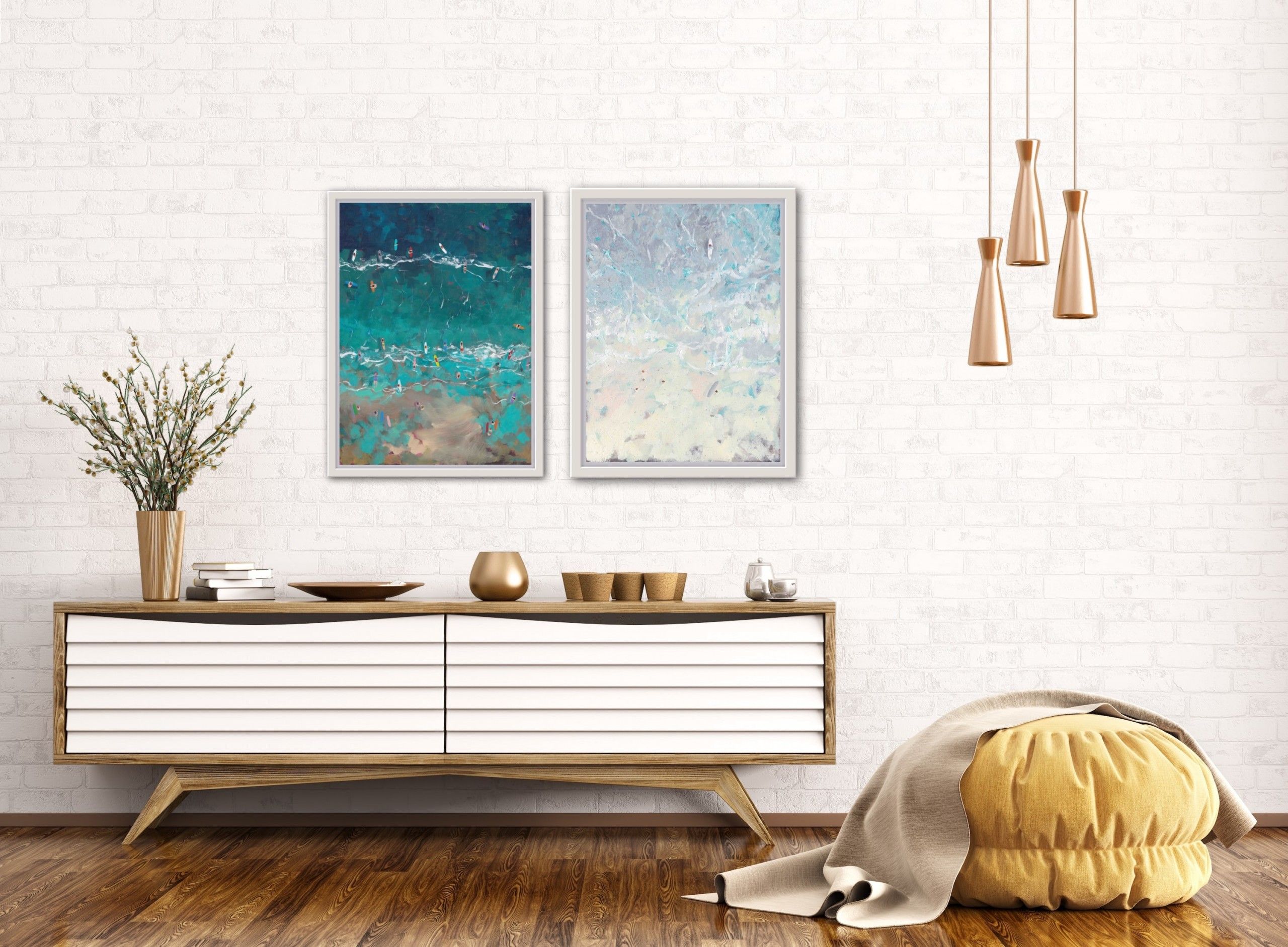 Surfing Layers by Lenny Cornforth [2021] Inspired by the northern coast of Cornwall and in particular Polzeath, Surfing Layers reflects the deep blue colours of the cornish ocean. The use of oil paint allows the layers to convey a sense of movement and depth whilst the aerial perspective creates an usual