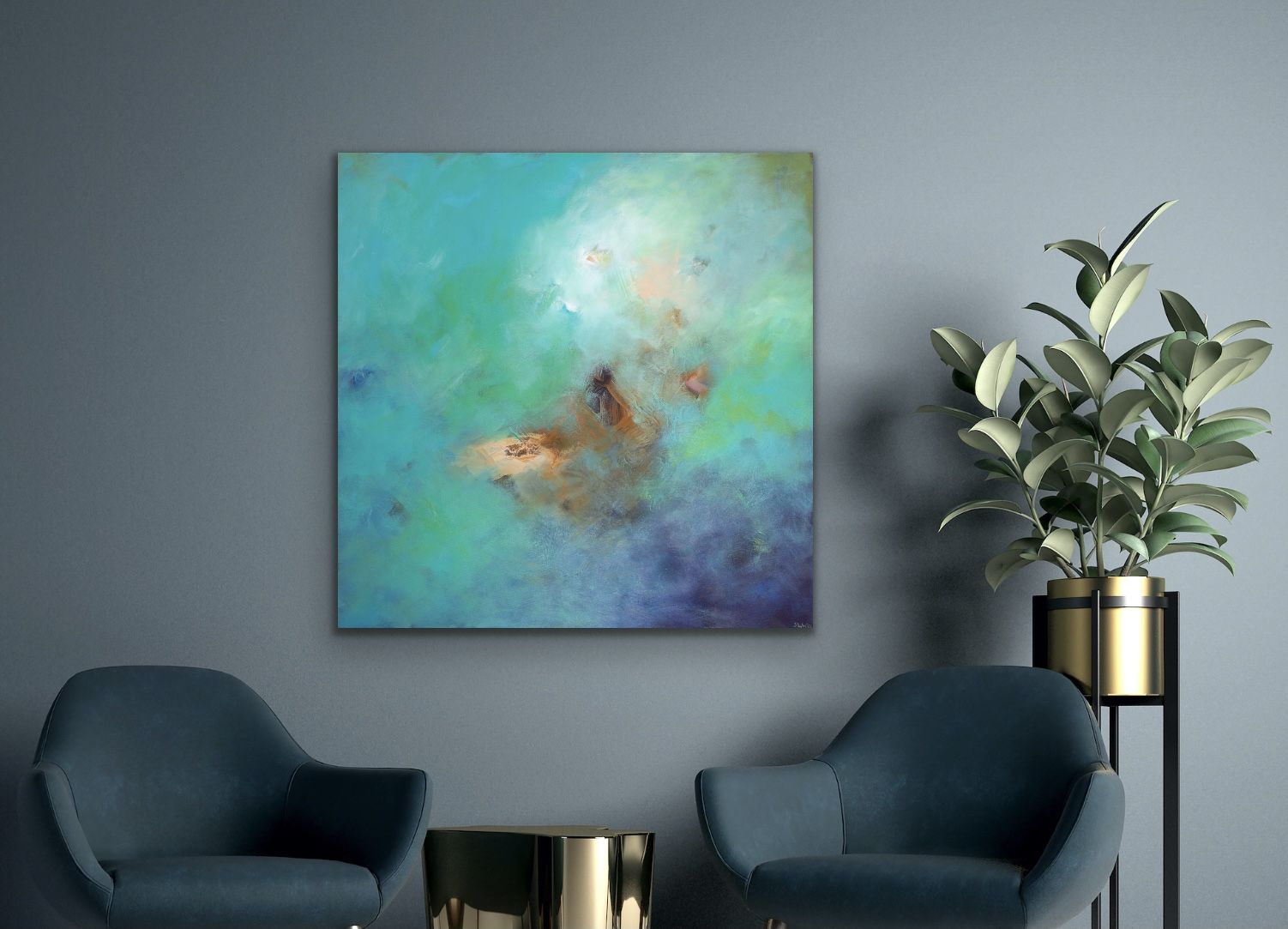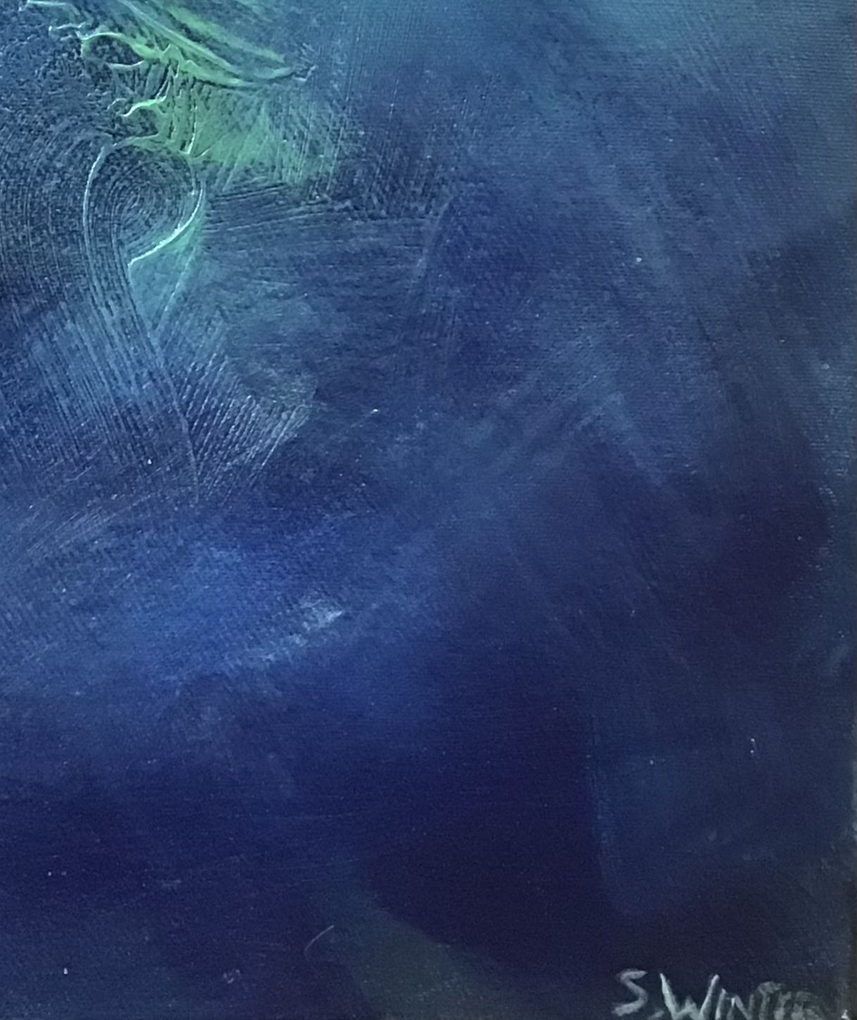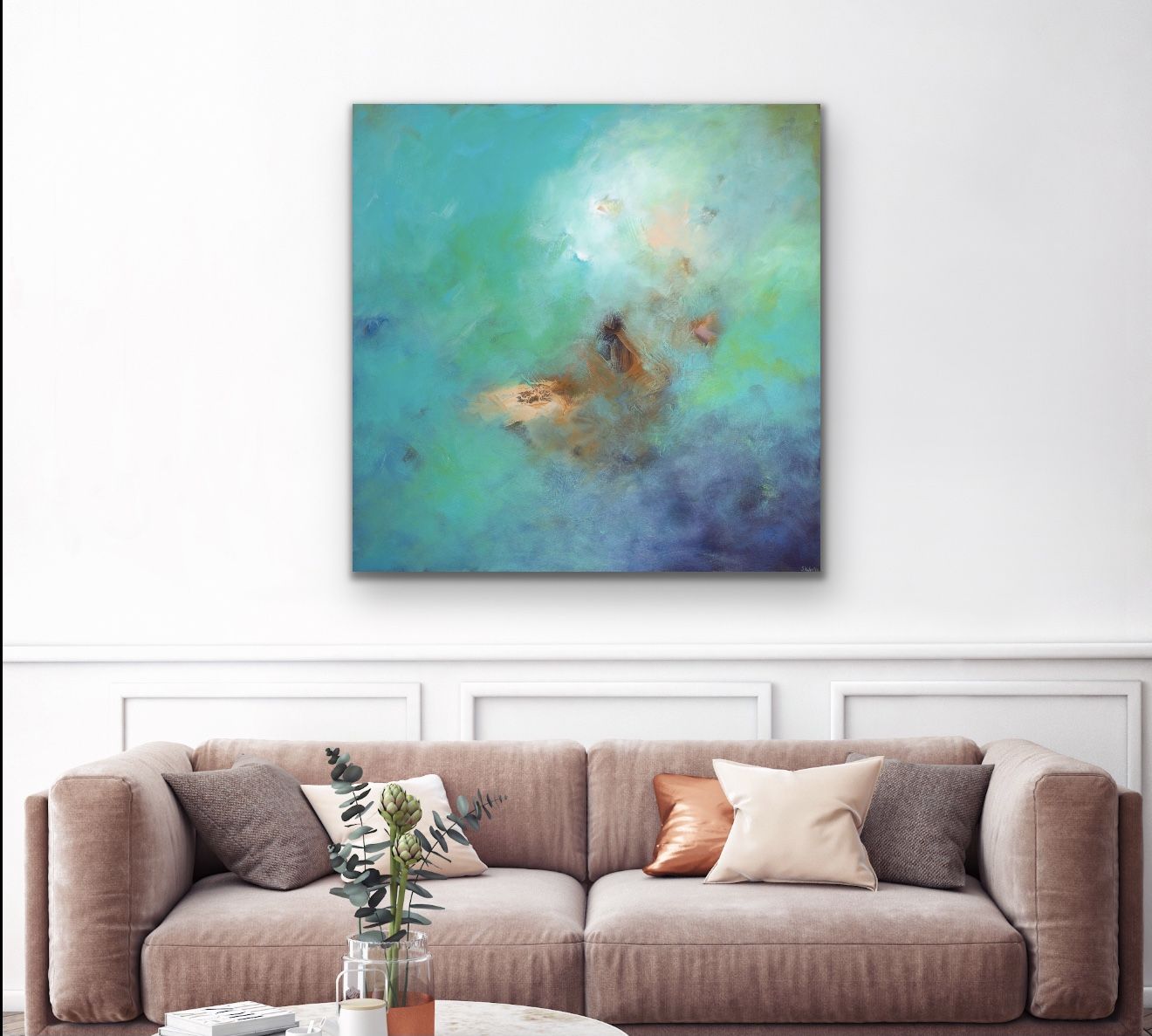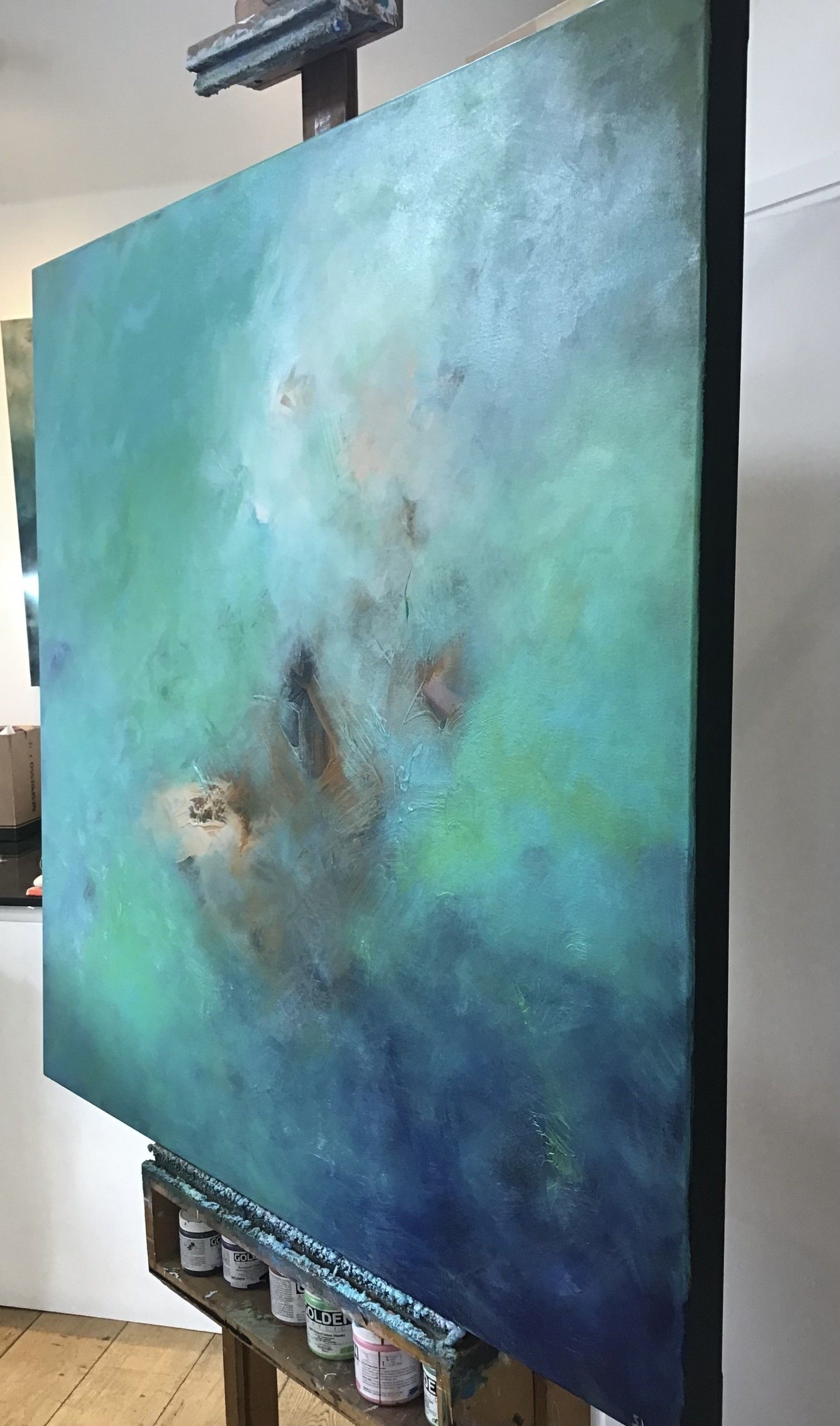 Swirling Turquoise evolved from many colours sketches of the sea and whirl pools, water hitting rocks and the shadows underneath the water. Painted in my studio it was spontaneous and fresh.