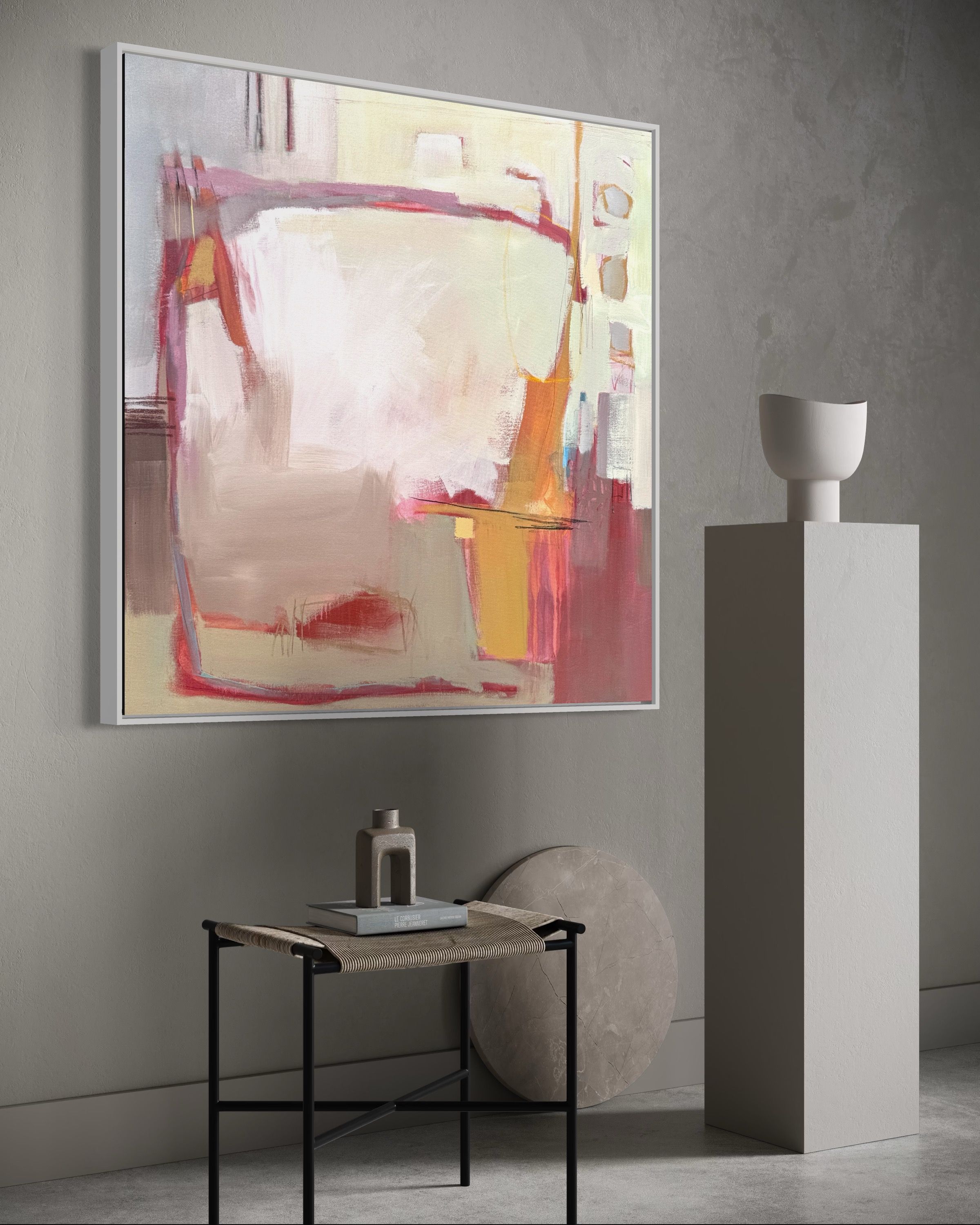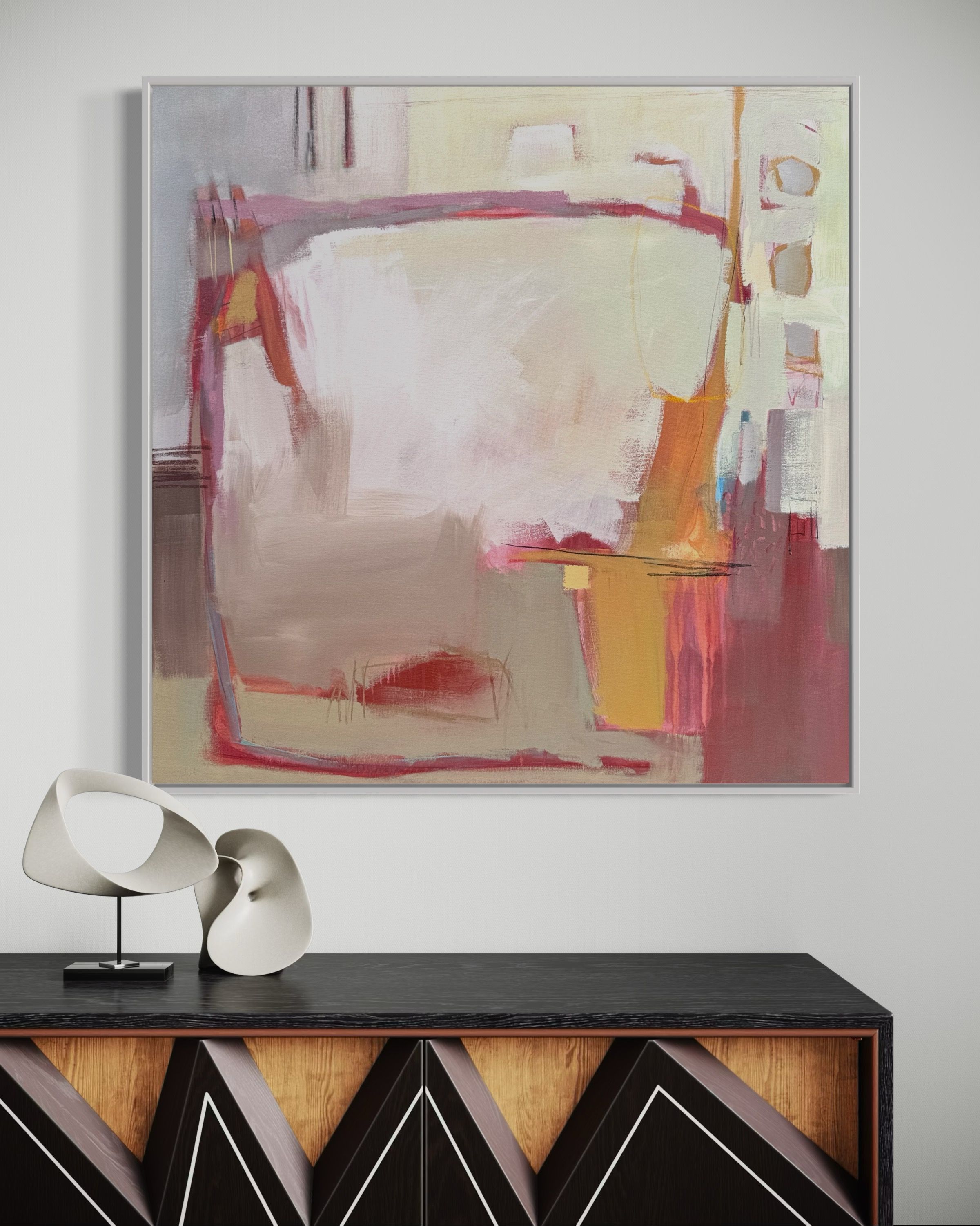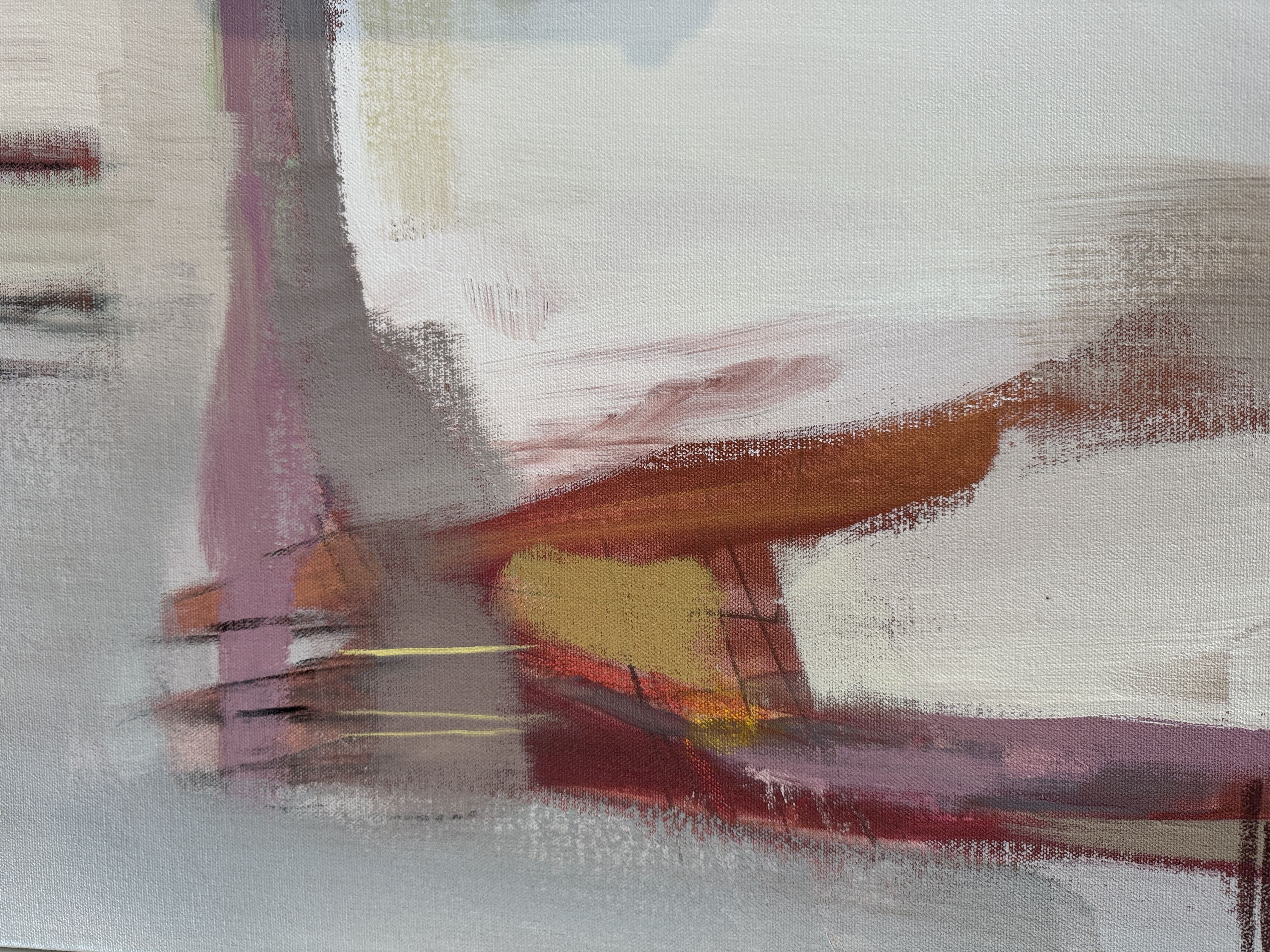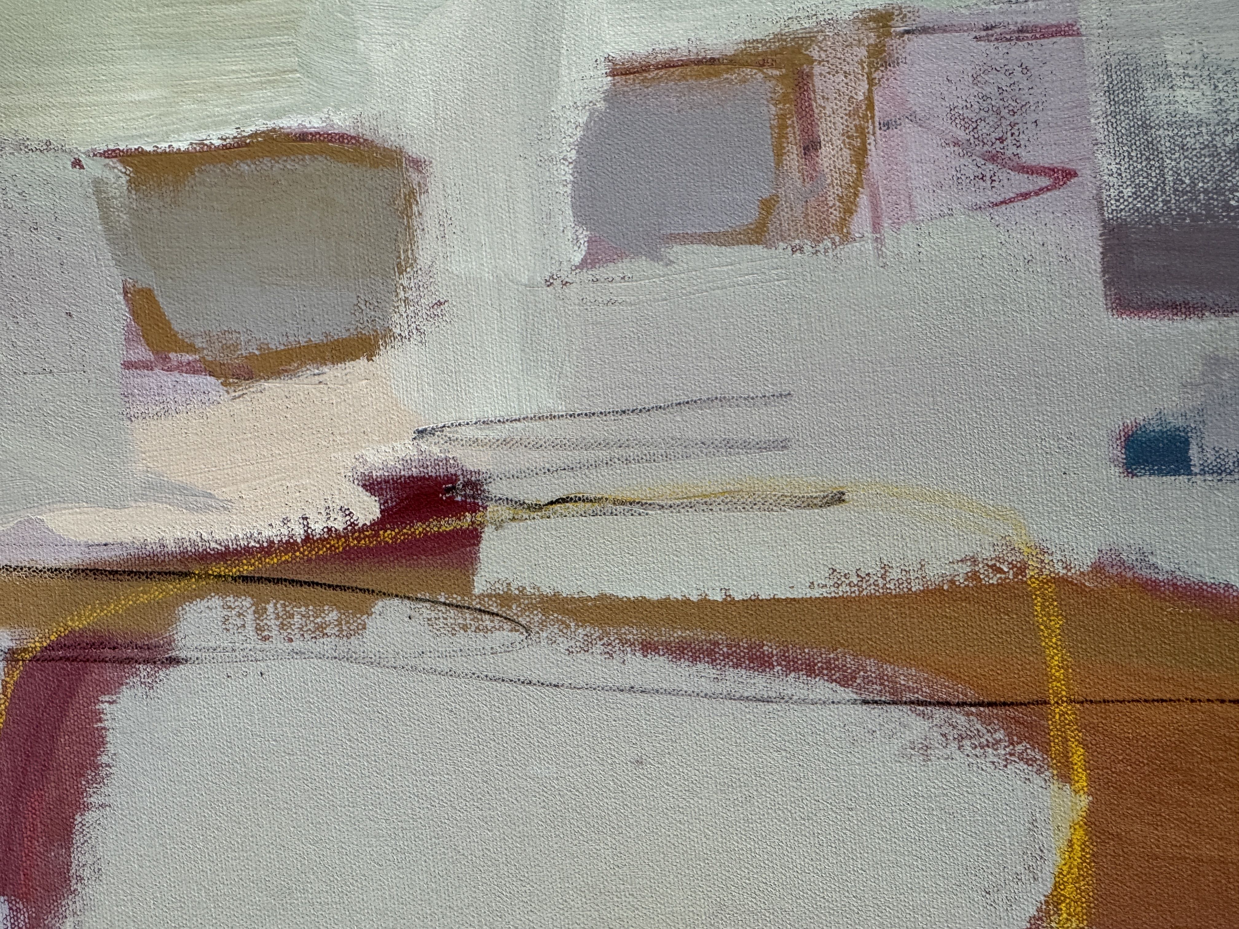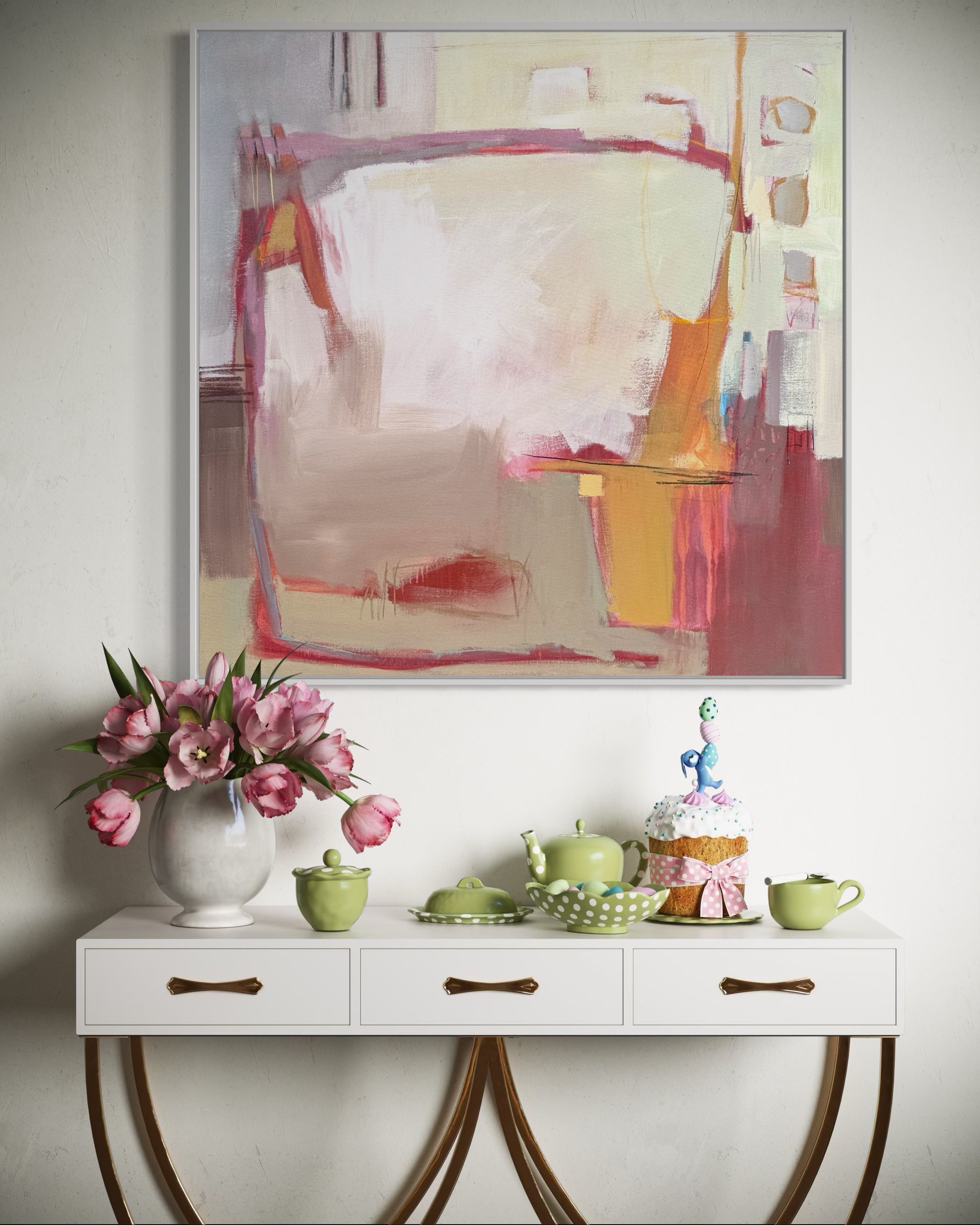 CAMILLA CLARK - My abstract paintings are often an expression of a feeling or an emotion and using the paint to describe on the canvas. This painting was in response to a walk around my garden seeing all the small pink, cream and orange blossom colours on my cherry and
