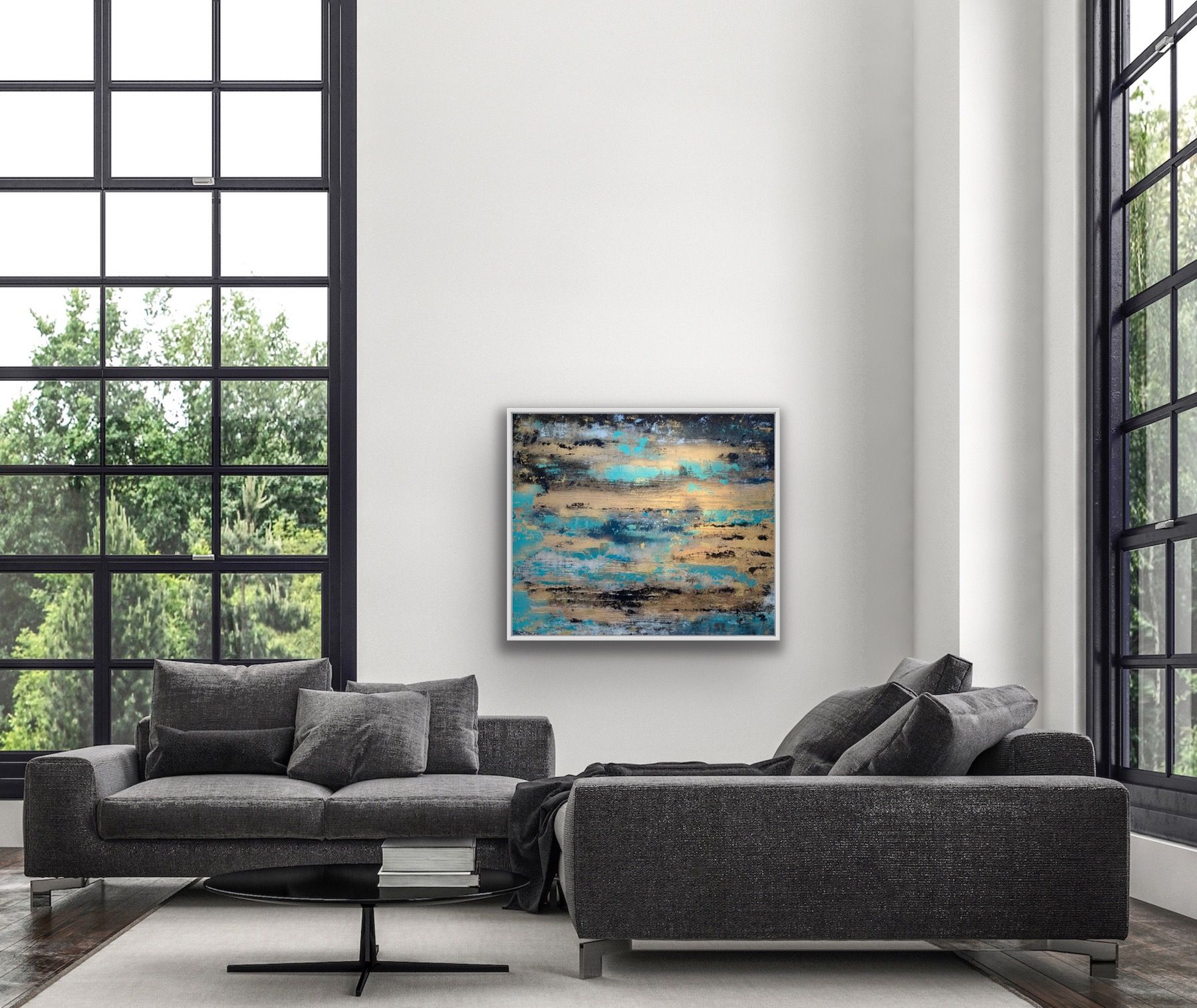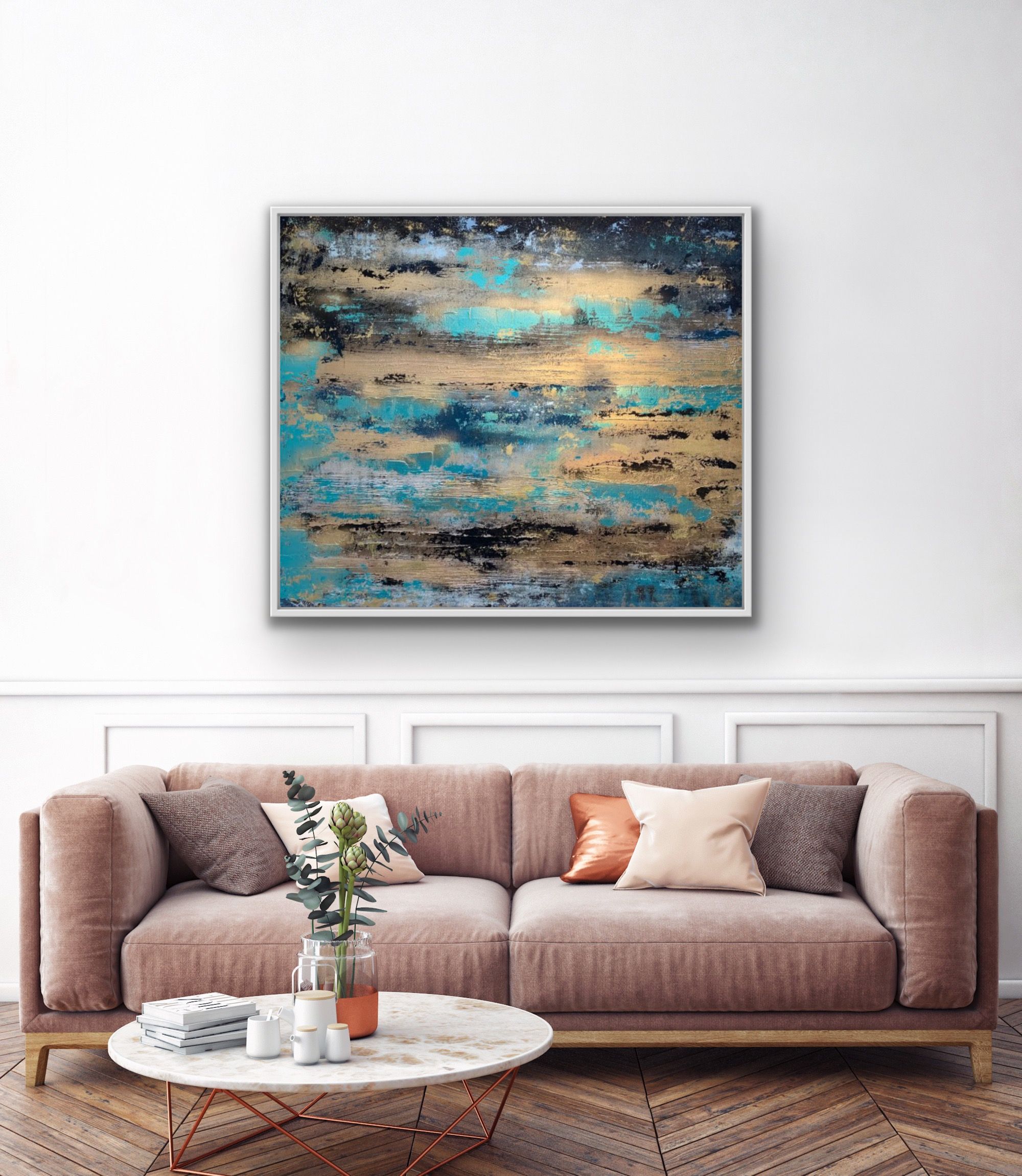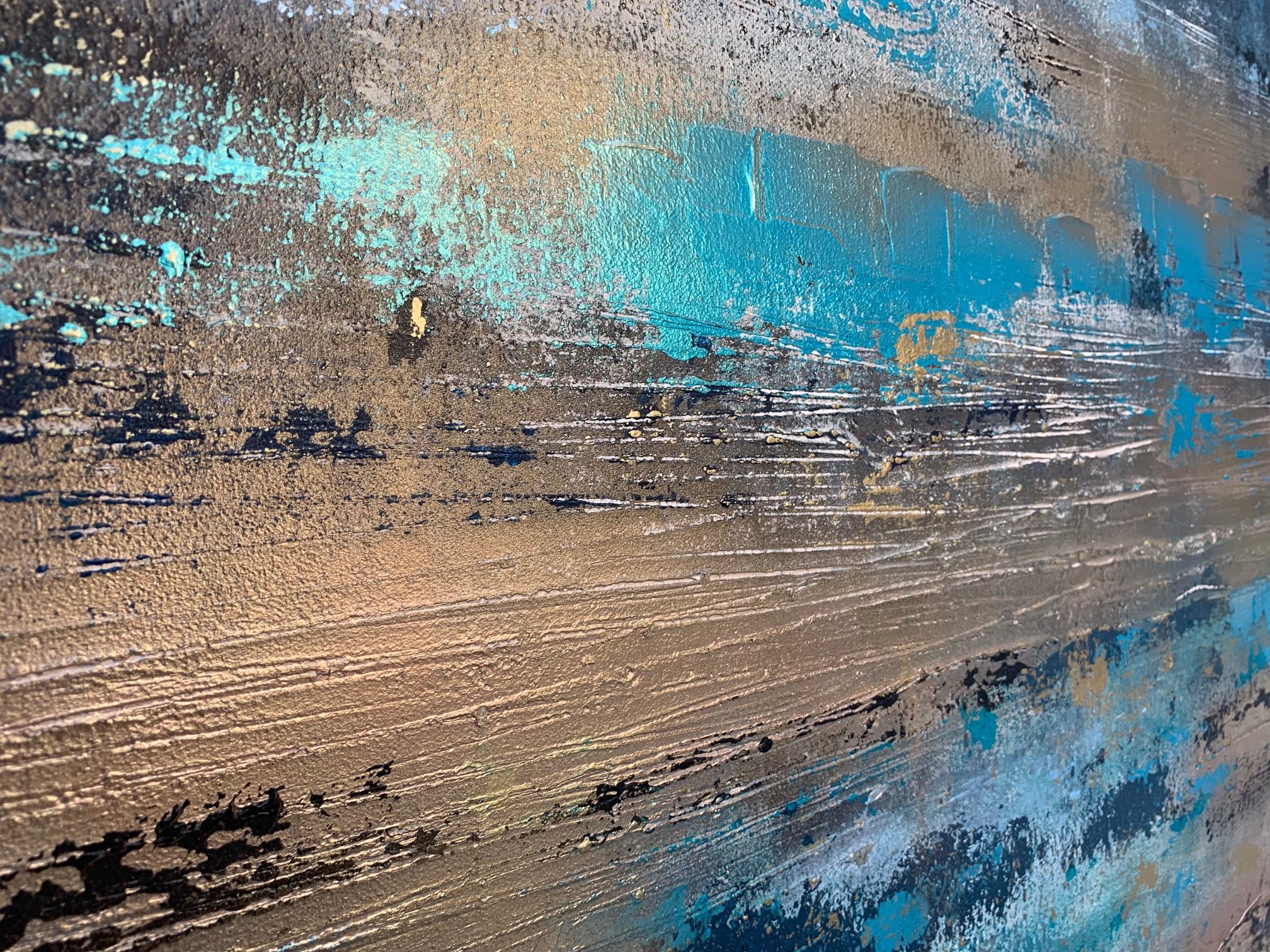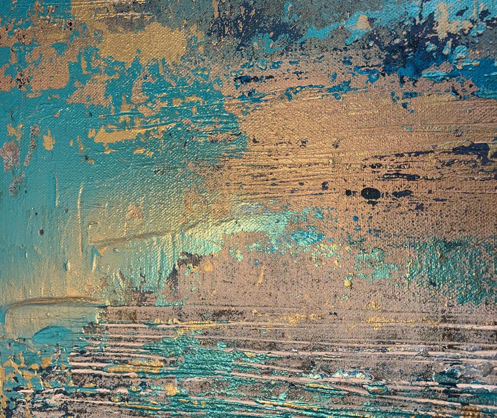 "Take Me To The Ocean" was inspired by the beautiful pristine turquoise waters and golden sunshine off the coast of Menorca on holiday this summer. Gorgeous turquoises mixed with golds and black. An original one of a kind artwork full of deep textures using artist clay, radiant with metallic gold