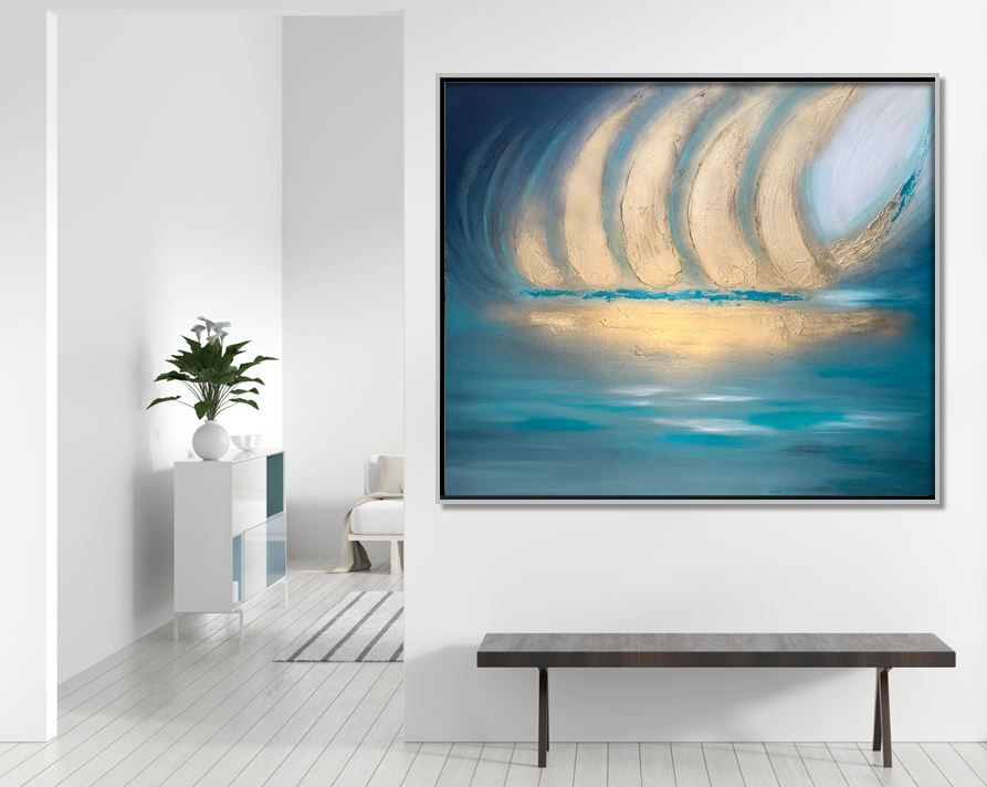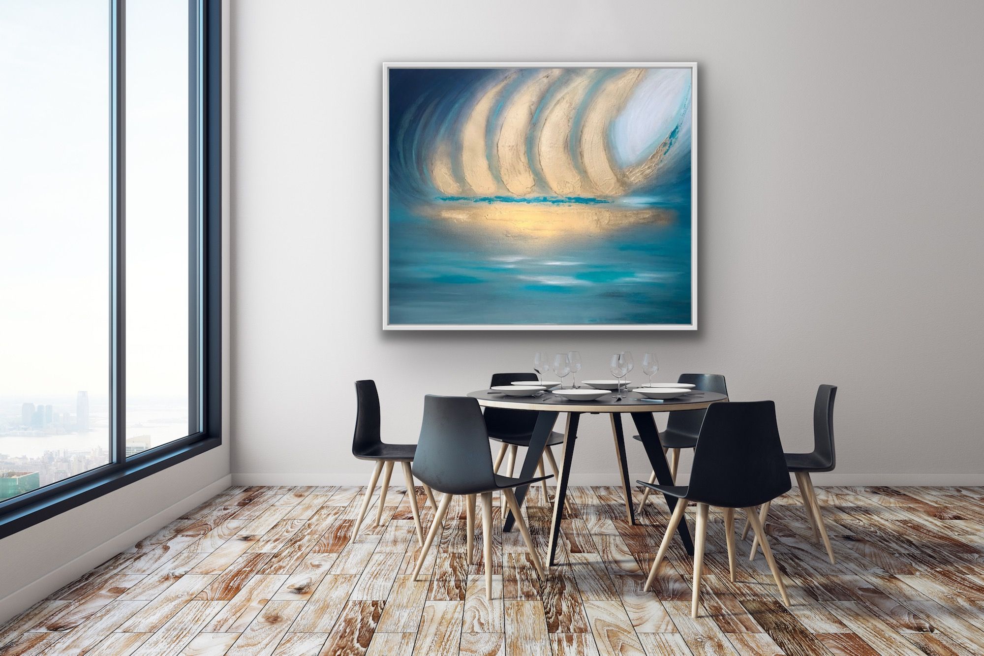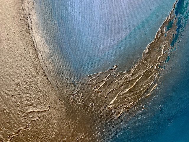 “Spectacular golden clouds on the horizon, glittering reflections on the deep teal seas”. Part of the "Spectacular" Collection, Teal Spectacular is an original painting by artist Sarah Berger. Original canvas painted in mixed media using artist modelling clay and vibrant teal and metallic gold acrylics, this piece really does glimmer