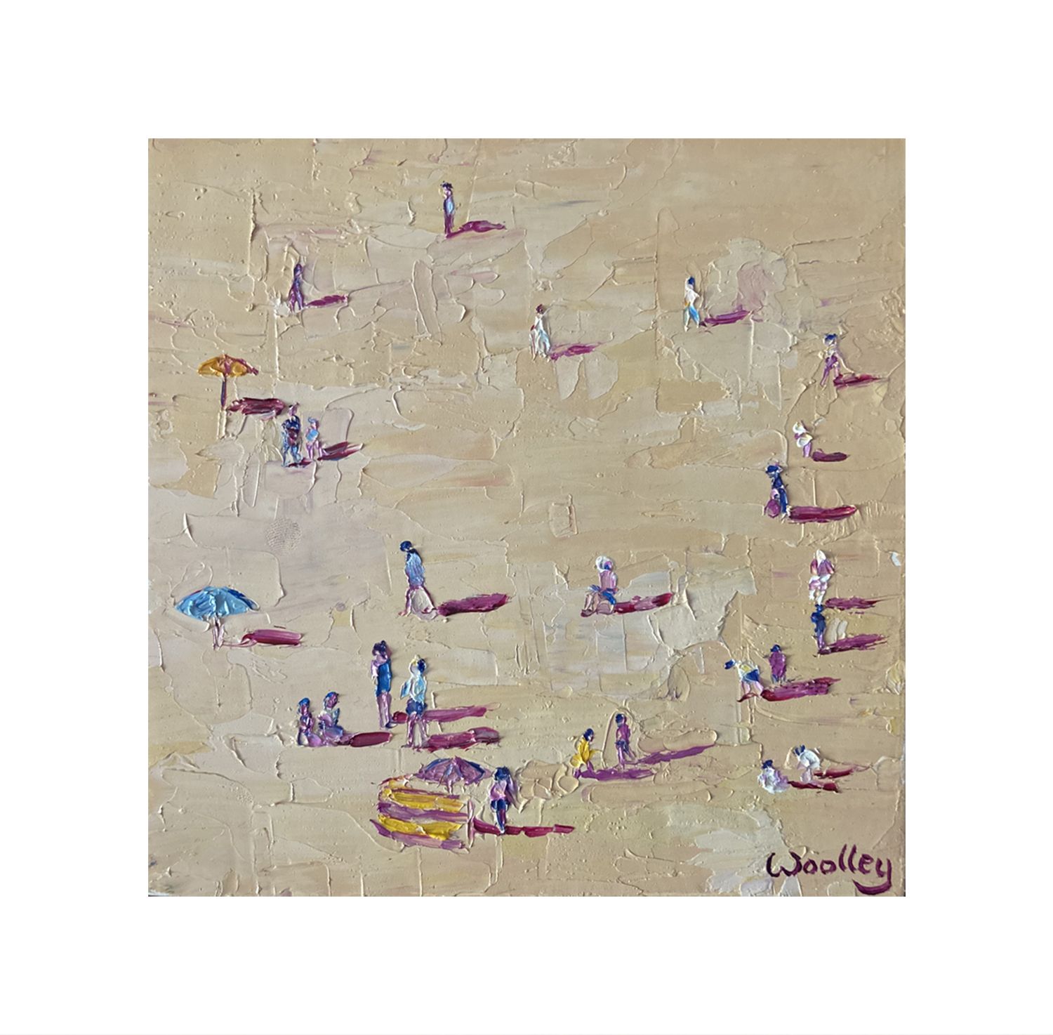Tenby Shadows is an Original Painting by Eleanor Woolley. Inspired by this Summer's visit to Tenby. Looking down onto the beach from the roadway above. The beach is dotted with bathers, their long shadows appear bigger than they are.