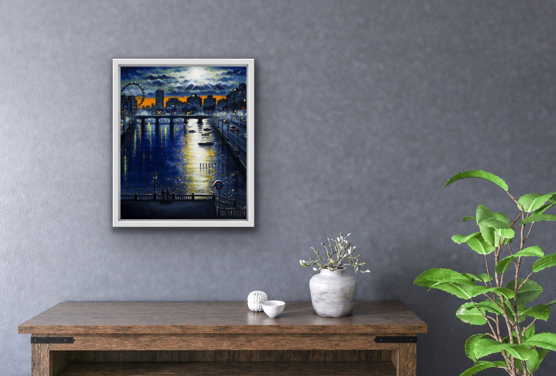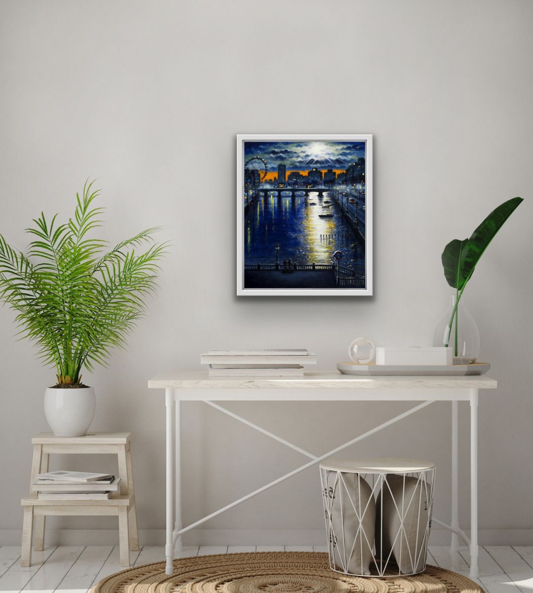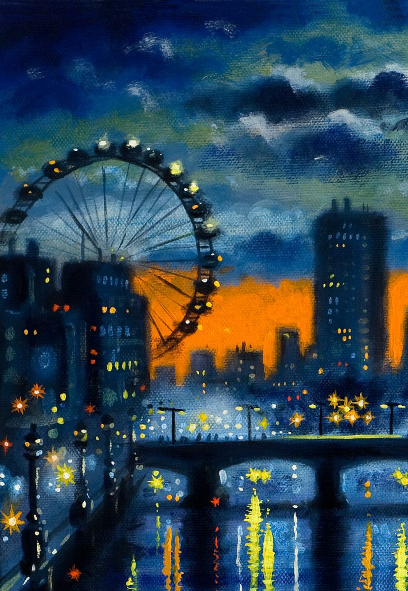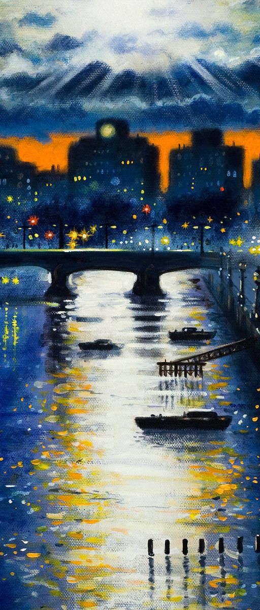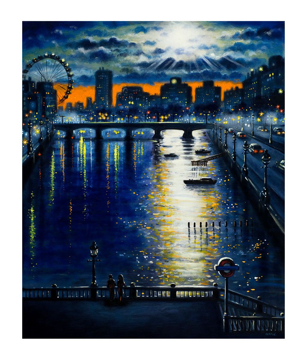 Thames Dusk showing Waterloo Bridge as seen from Blackfriars Bridge . Made from drawings done on site and then worked up into the finished painting in the studio. I know this view so well from endless times crossing Blackfriars Bridge, it is a place of wonder in the capital city.