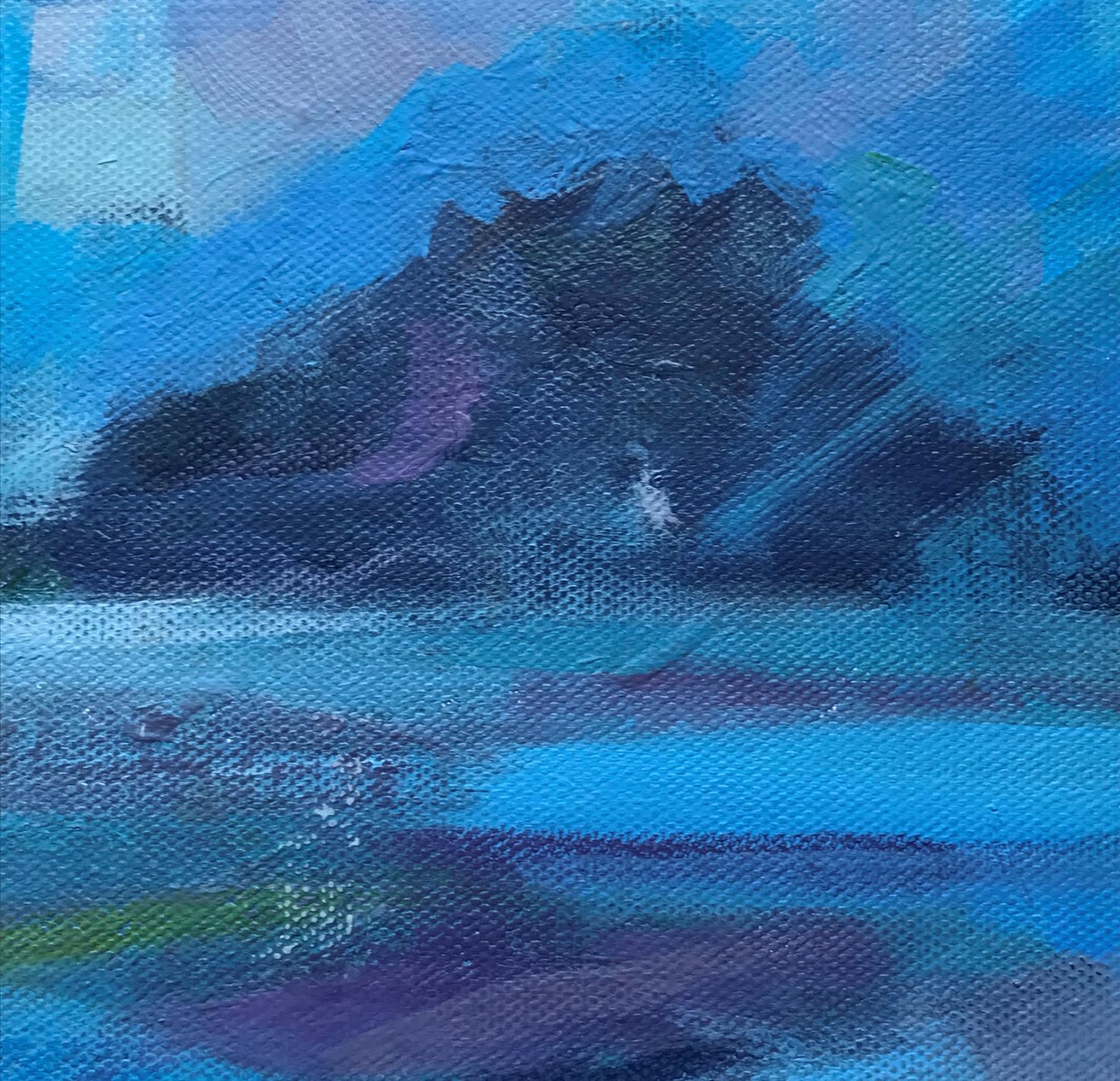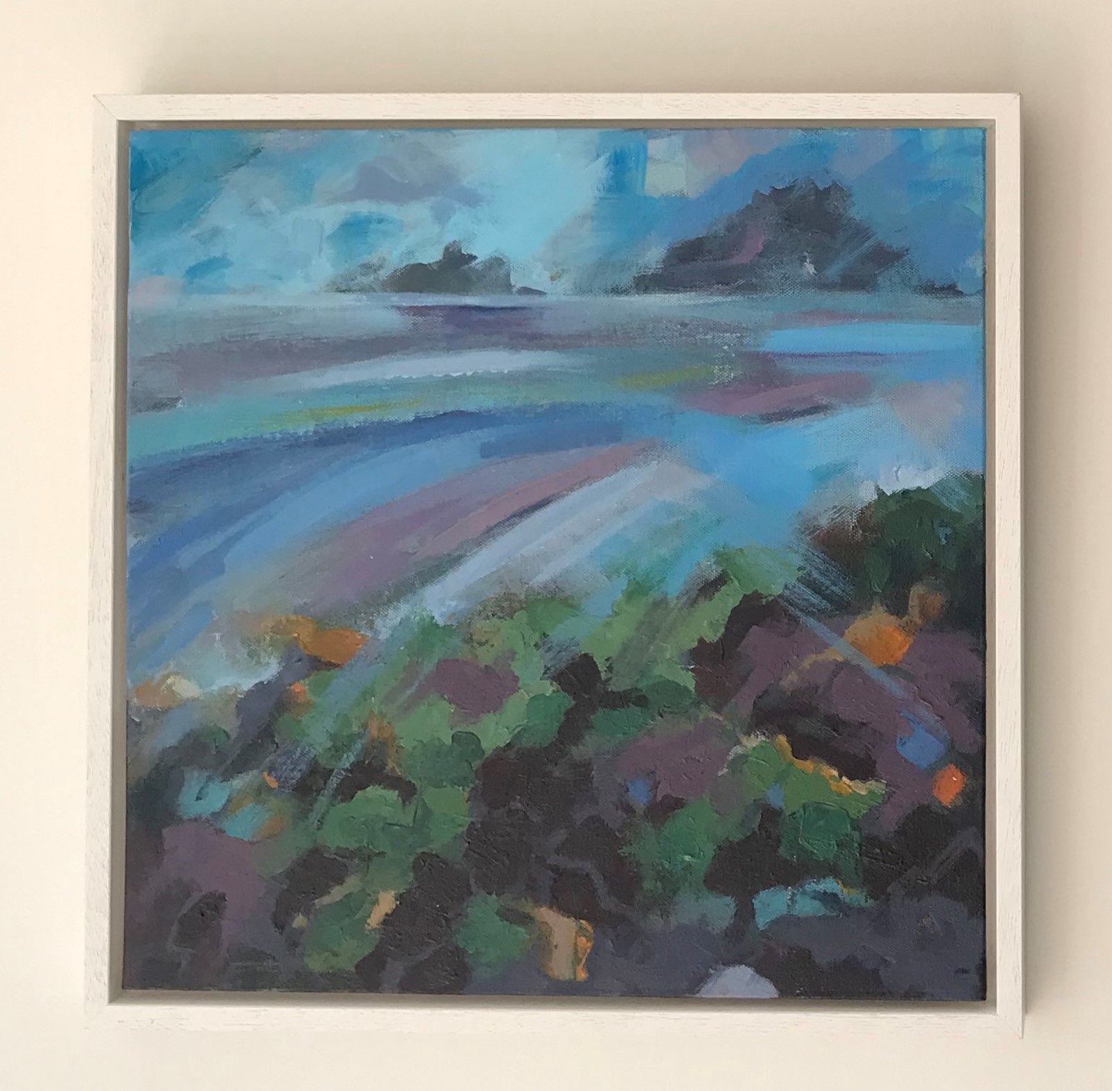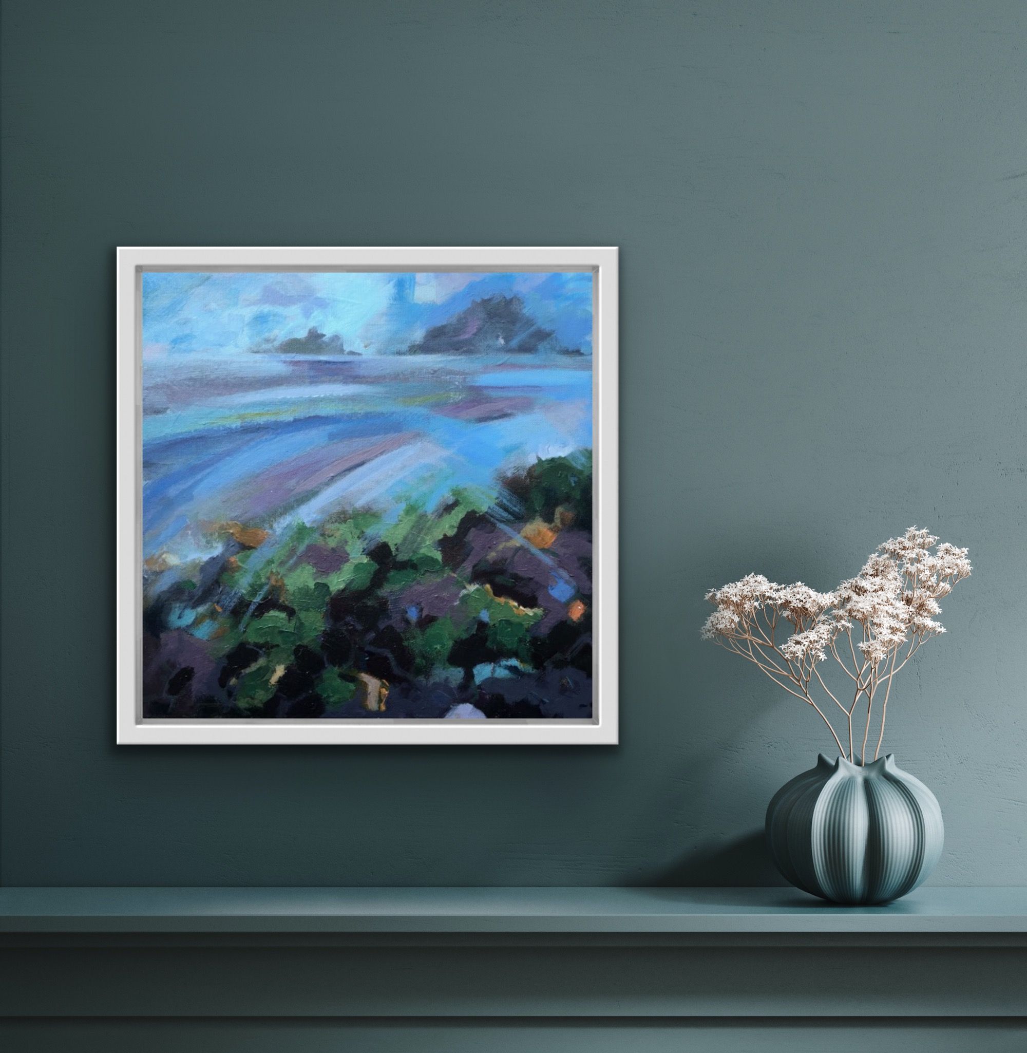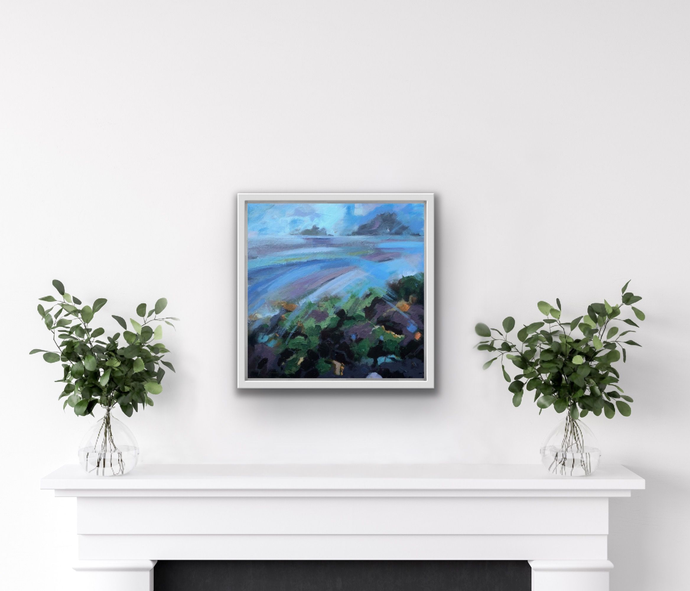 Bright colours and bold brushmarks in thick paint are used to recreate the iconic Brisons, two rocks off the coast at Cape Cornwall, on a clear breezy day. Sweeping, expressive marks mimic the inflow of wind and tide.