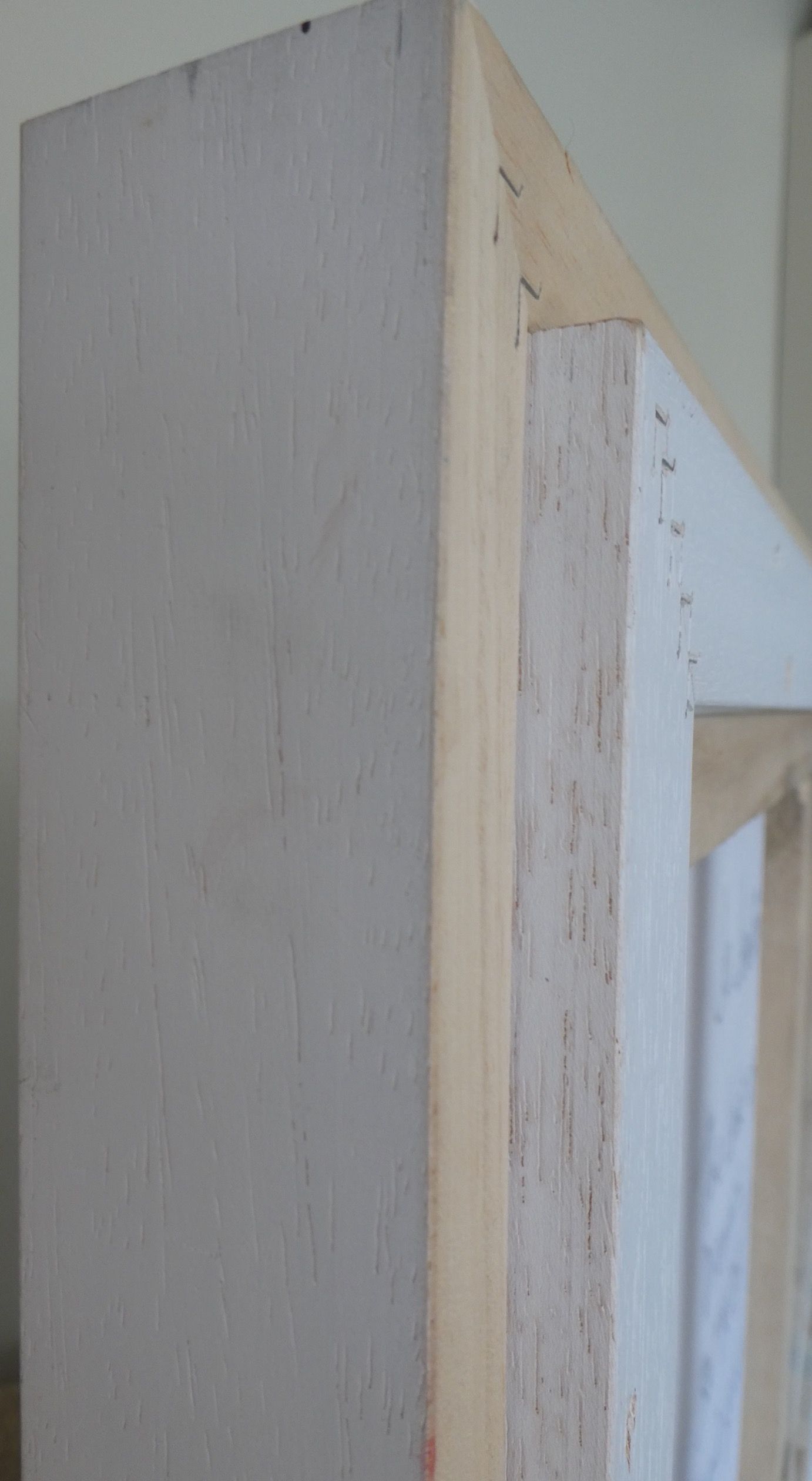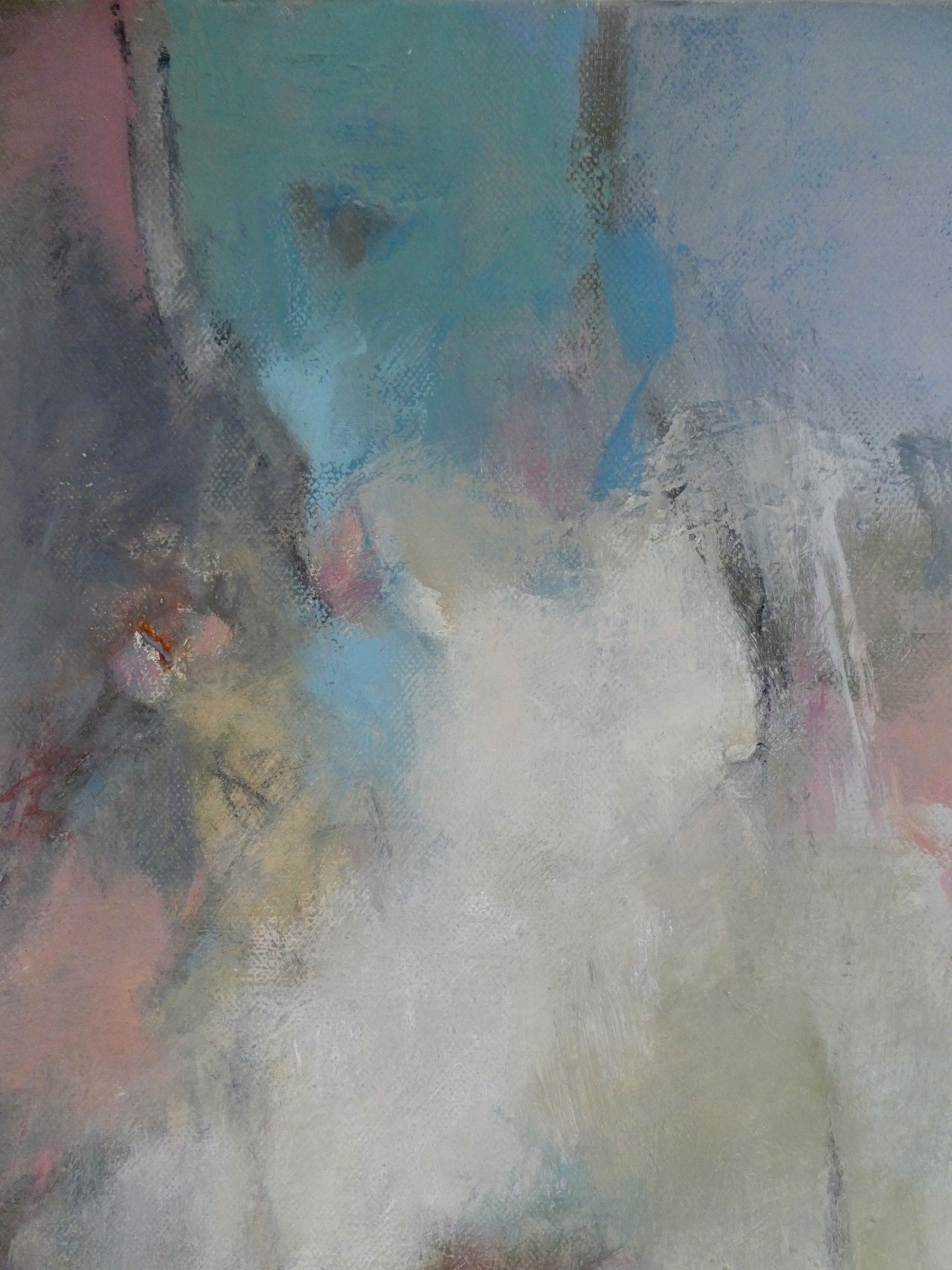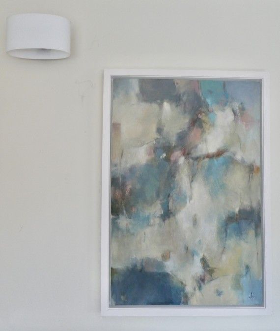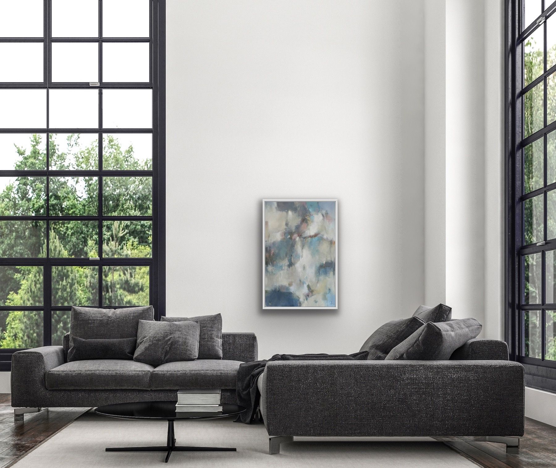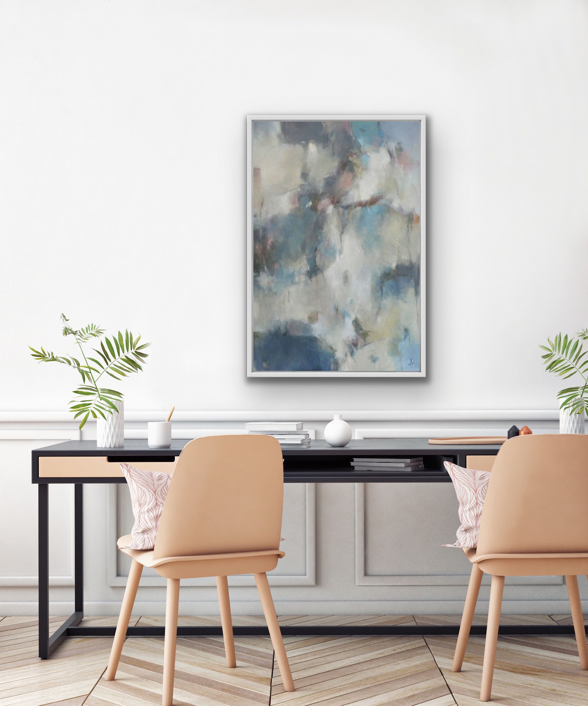 Original abstract painting with soft tonal qualities and a suggestion of floating images in space, which can be fragmented and reform. Framed in a white floating wooden frame.
