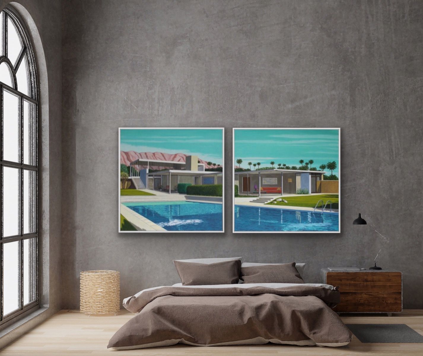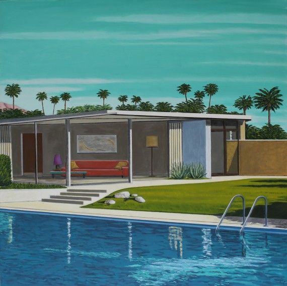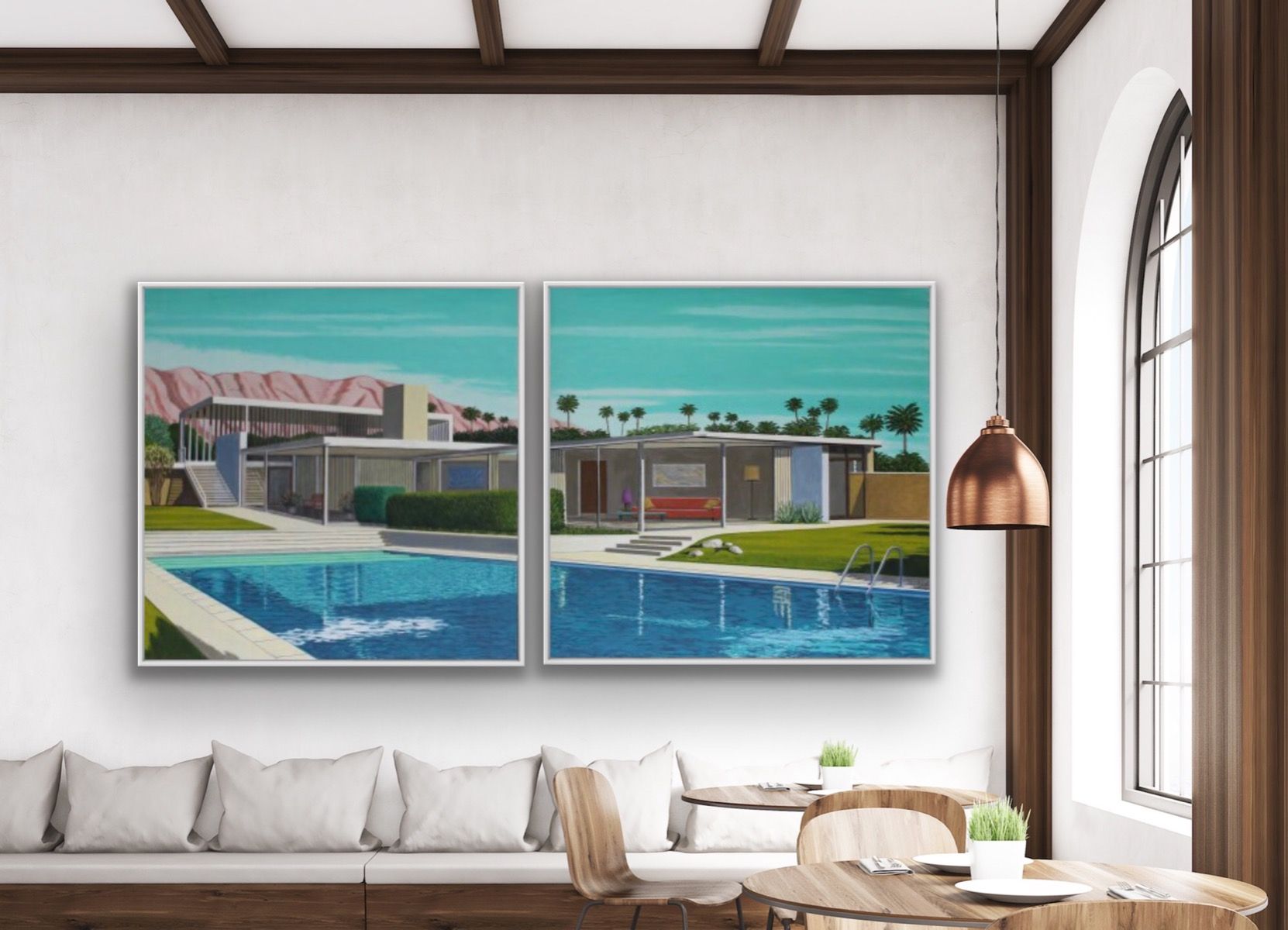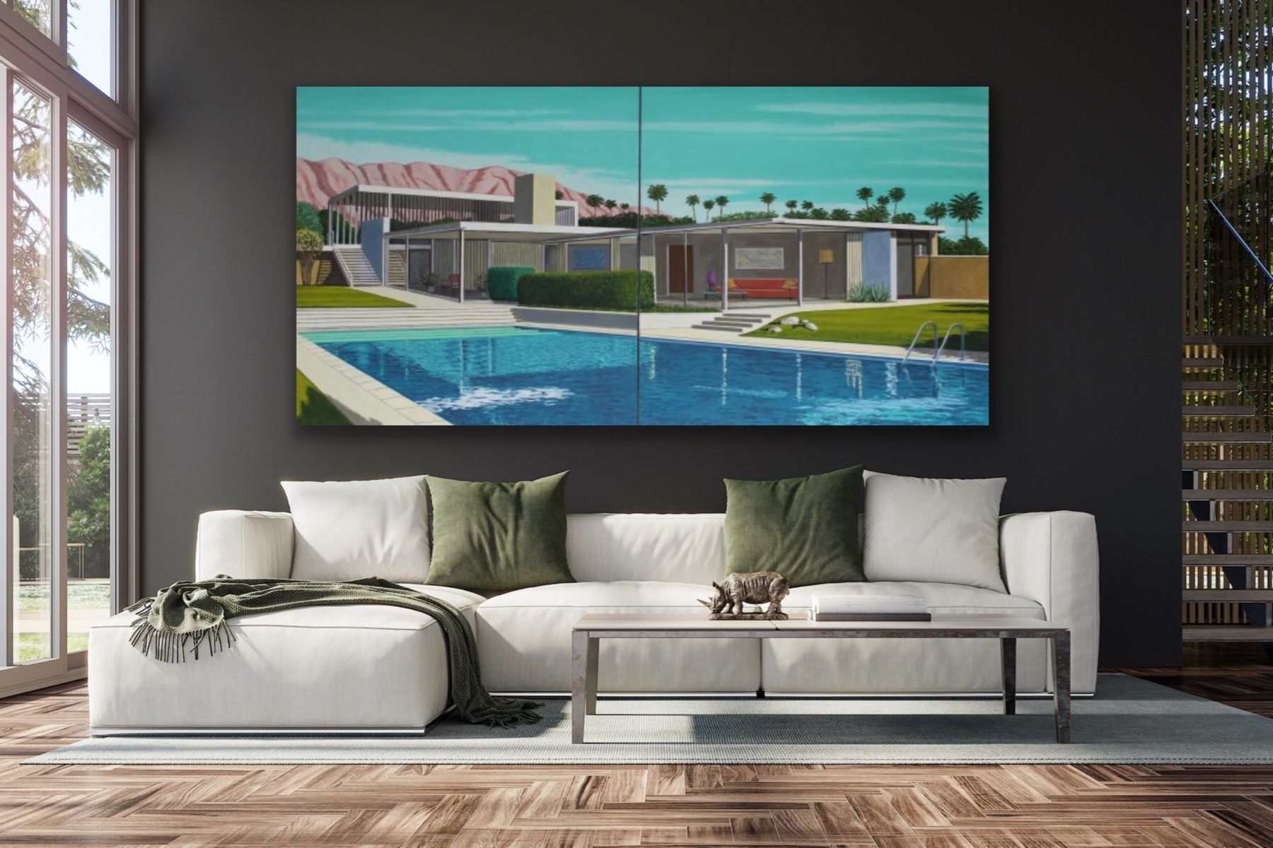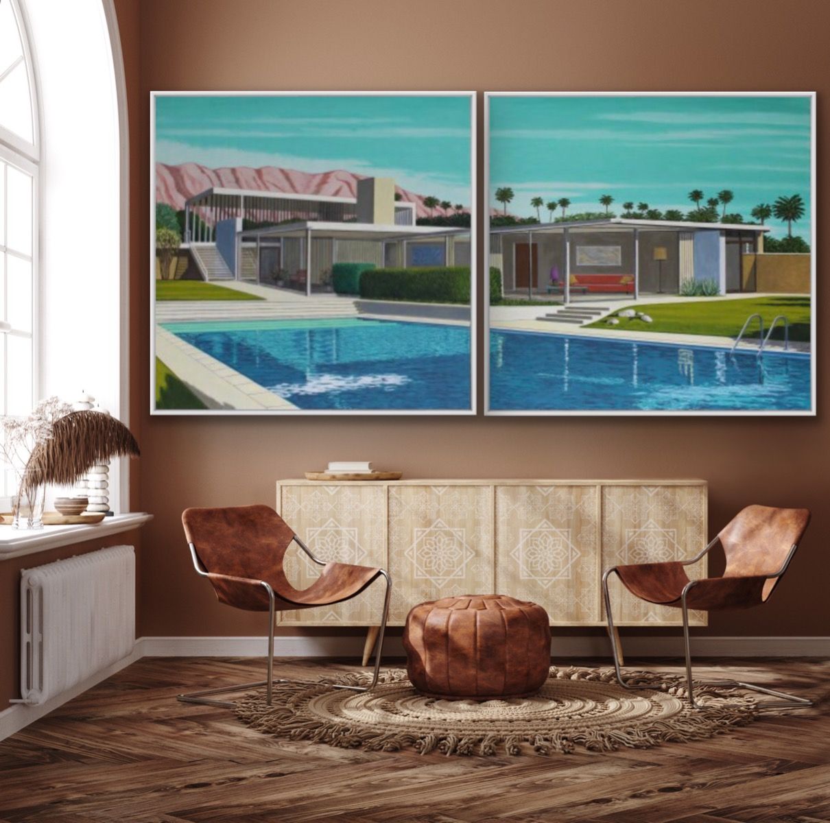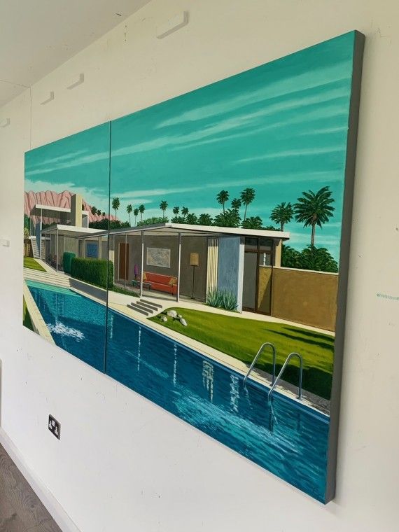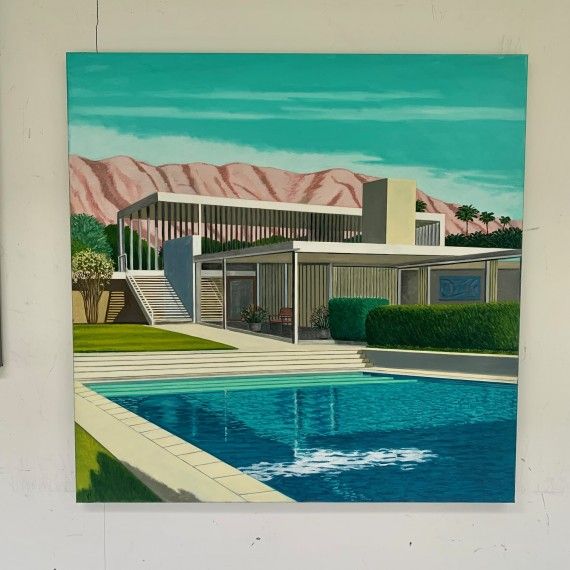 This is an oil painting of the iconic house in California designed by the famous architect Richard Neutra. I love to paint this house from many different angles and always focusing on the beautiful swimming pool and the impressive mountains behind the house. I can play with colours and add
