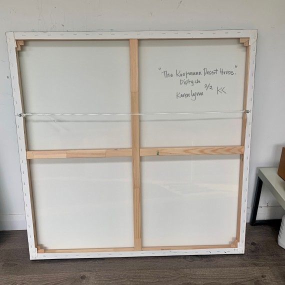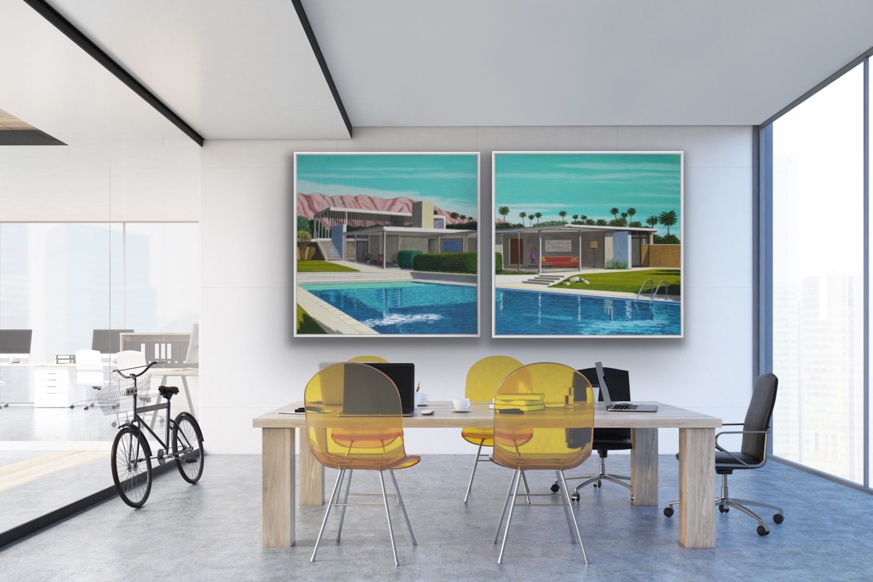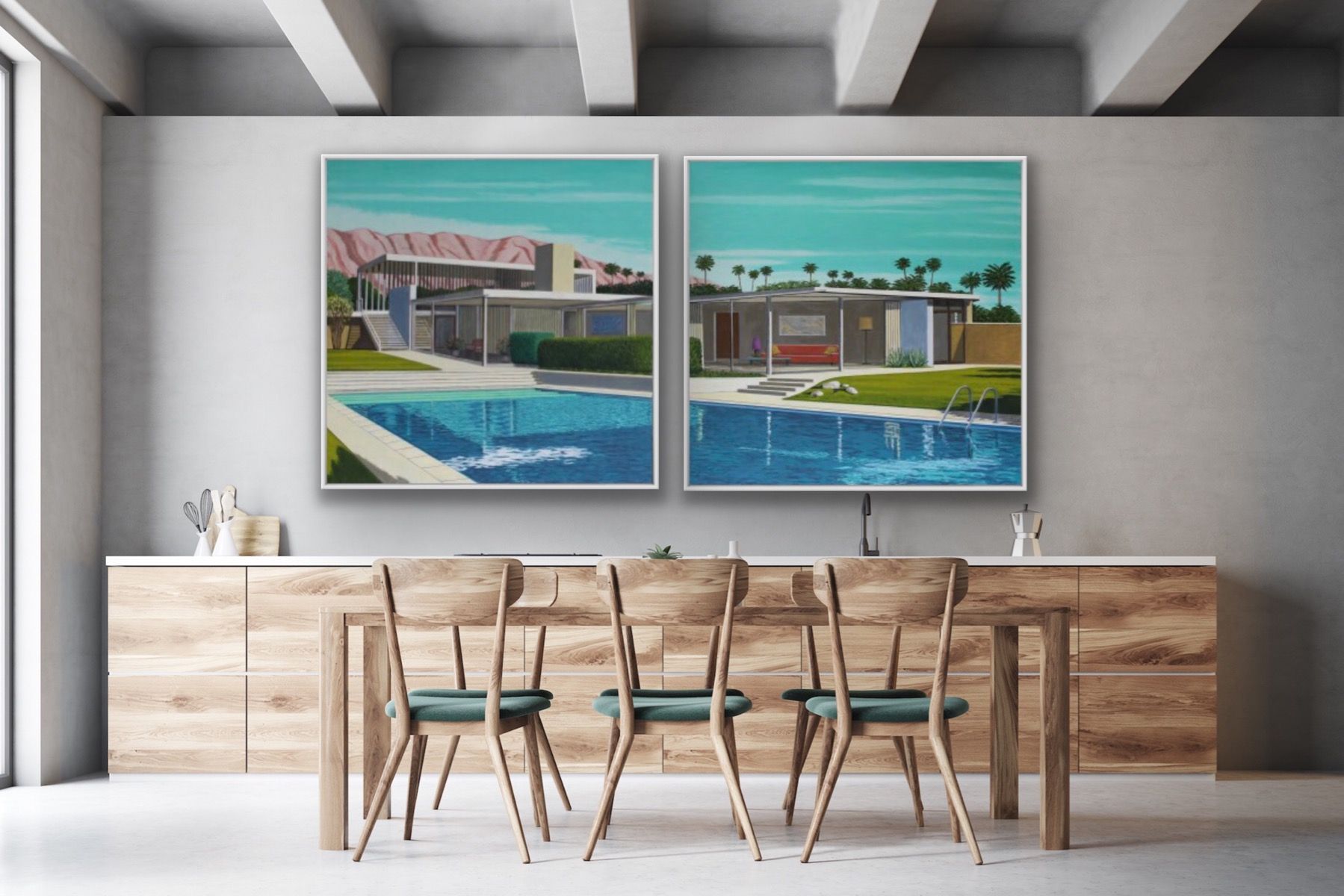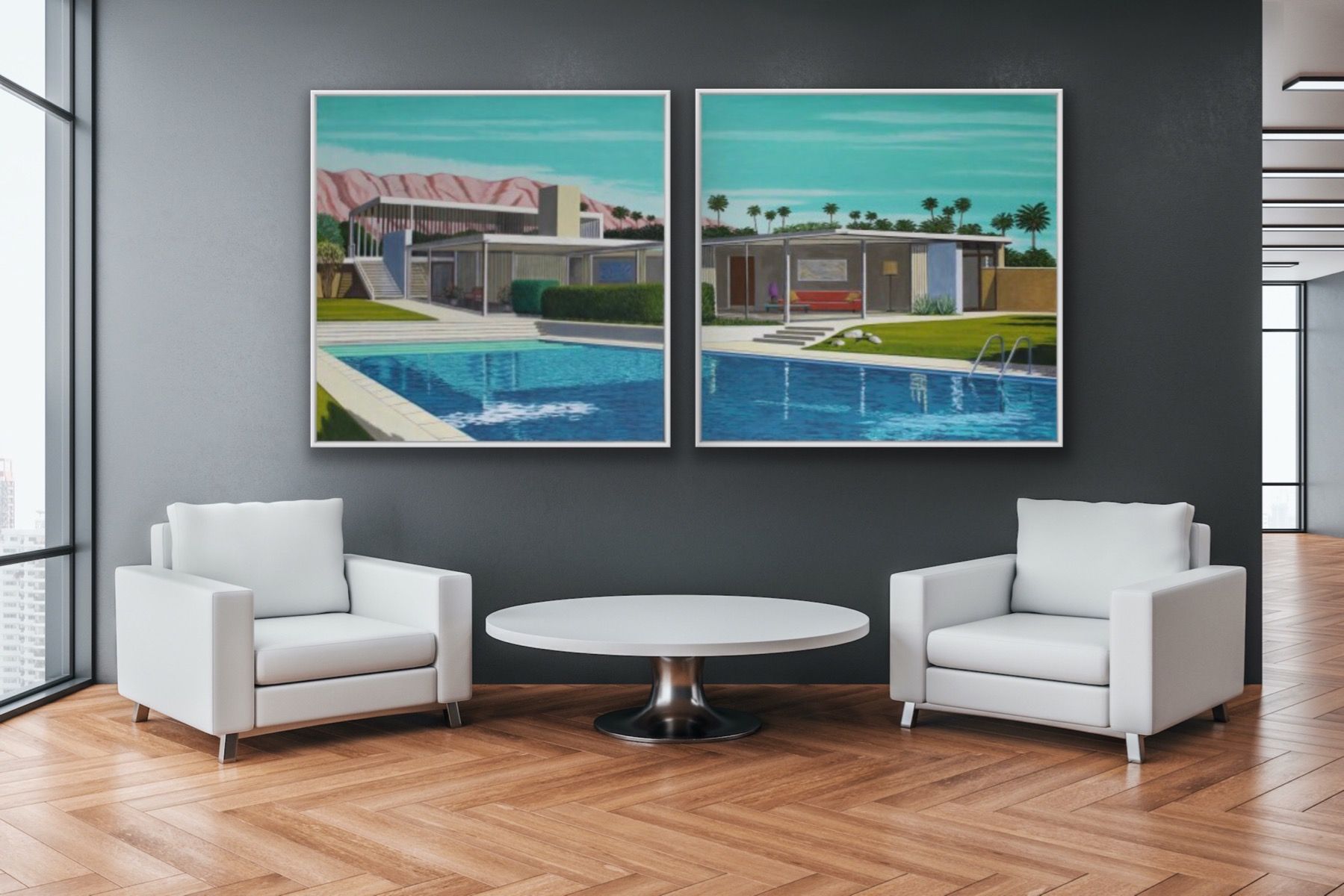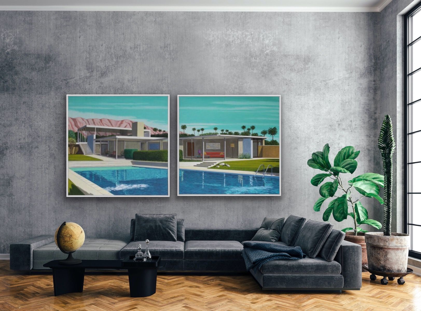 This is an oil painting of the iconic house in California designed by the famous architect Richard Neutra. I love to paint this house from many different angles and always focusing on the beautiful swimming pool and the impressive mountains behind the house. I can play with colours and add