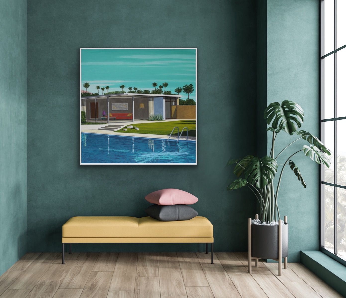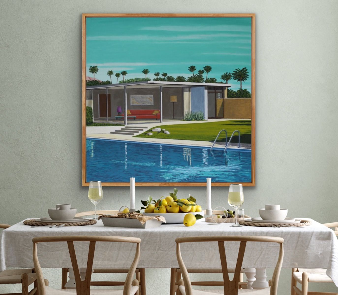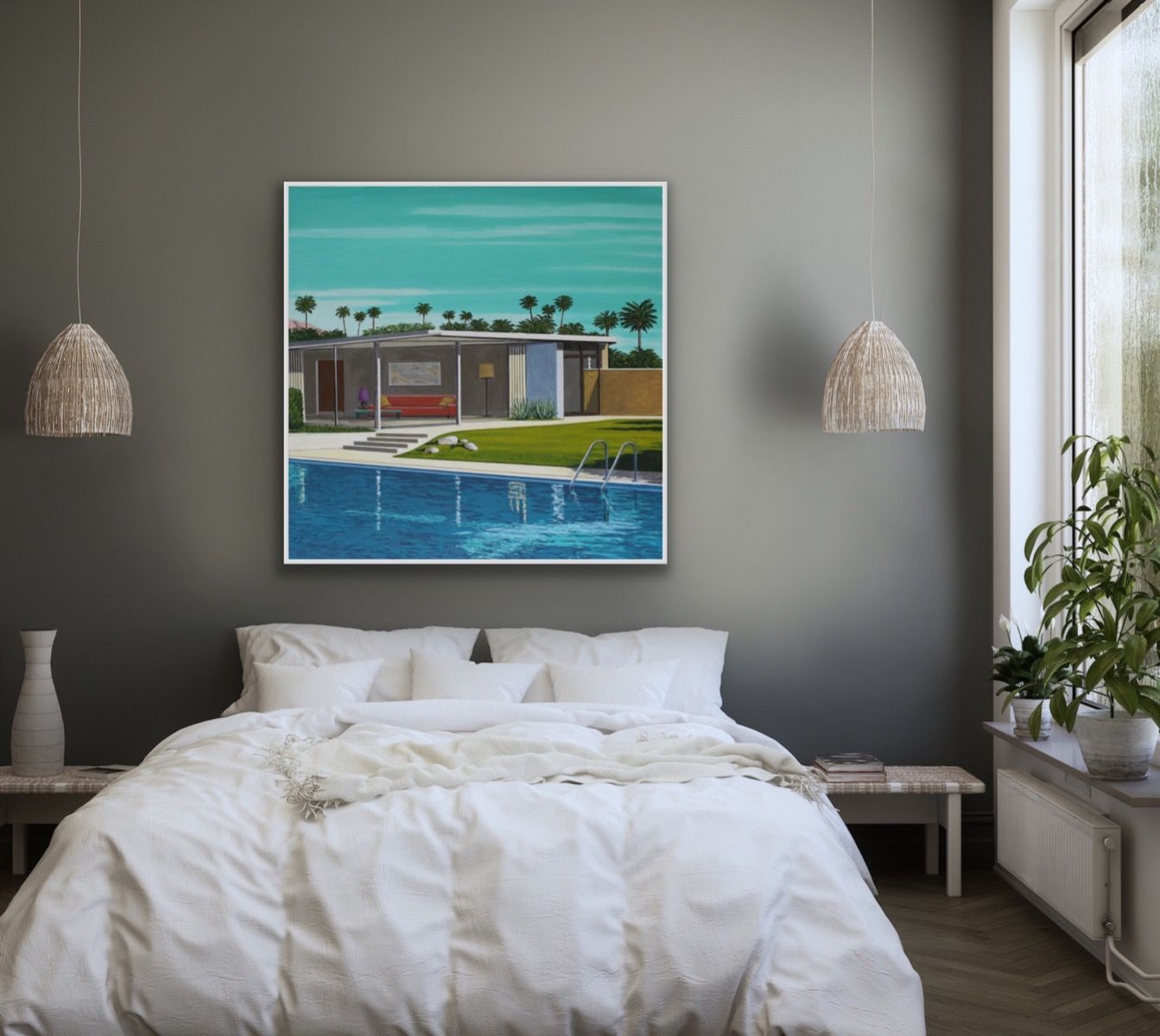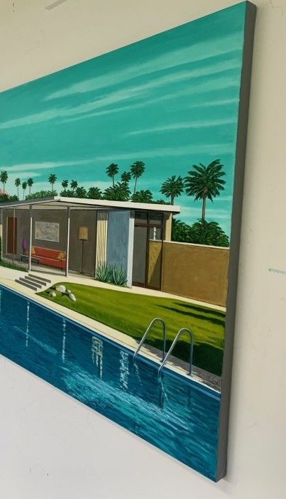 This is an oil painting of the iconic house in California designed by the famous architect Richard Neutra. I love to paint this house from many different angles and always focusing on the beautiful swimming pool and the impressive mountains behind the house. I can play with colours and add