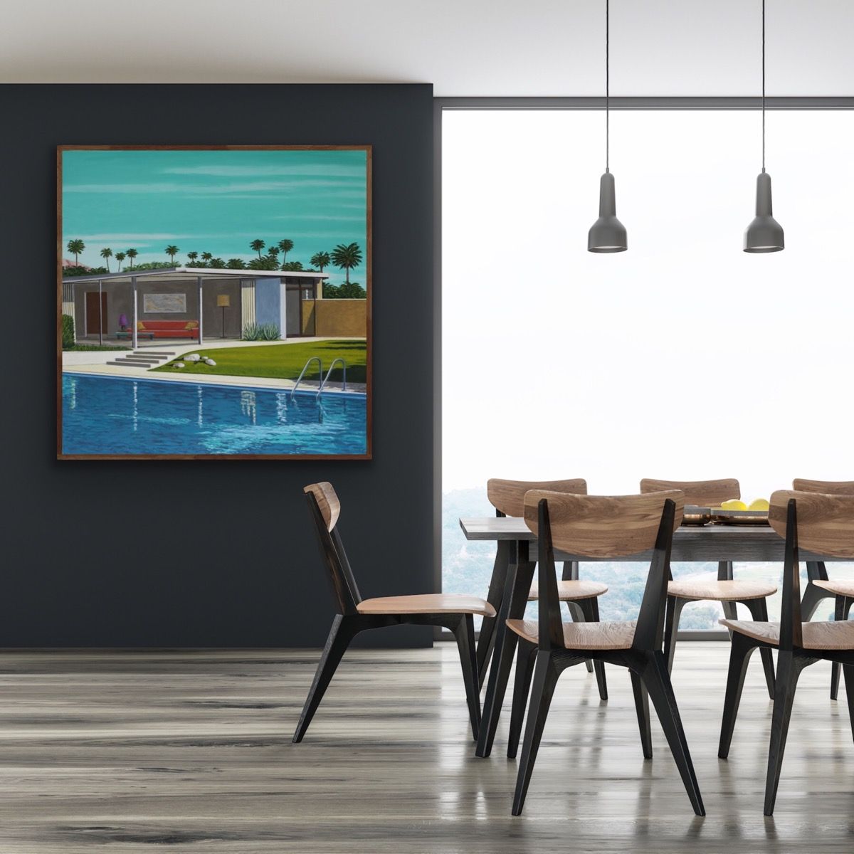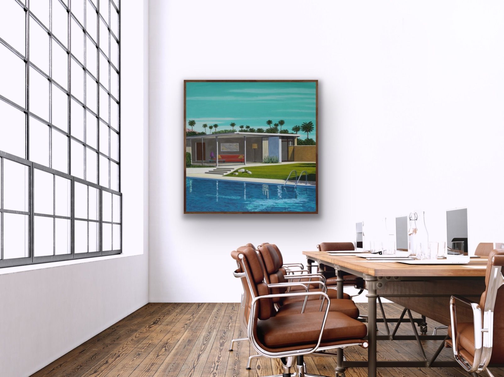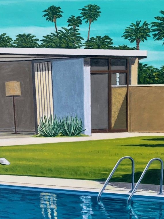 This is an oil painting of the iconic house in California designed by the famous architect Richard Neutra. I love to paint this house from many different angles and always focusing on the beautiful swimming pool and the impressive mountains behind the house. I can play with colours and add