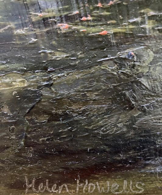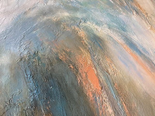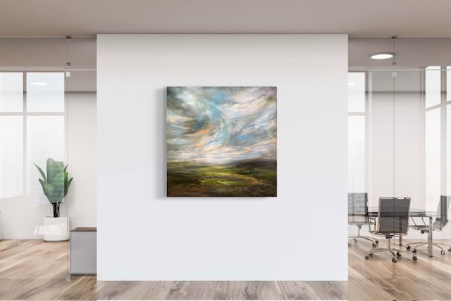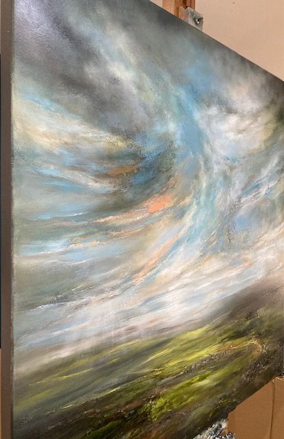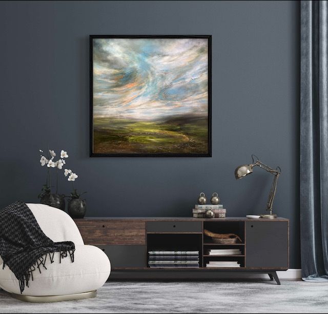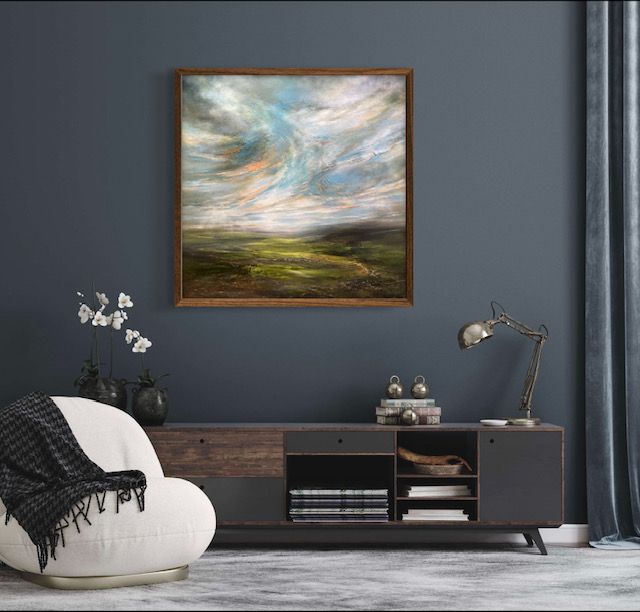 The Mountains Live Within Me is a semi-abstract landscape painting by Helen Howells. It was inspired by the hills, valleys and mountains of South Wales, which is my homeland. It is not of any specific place, but is a combination of many walks and memories, that have calmed my mind