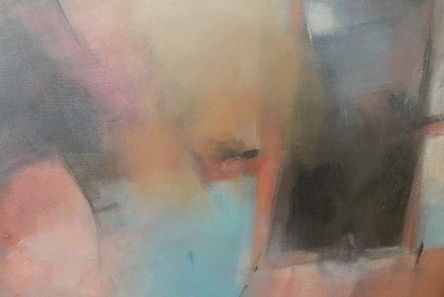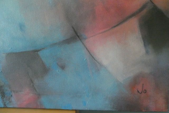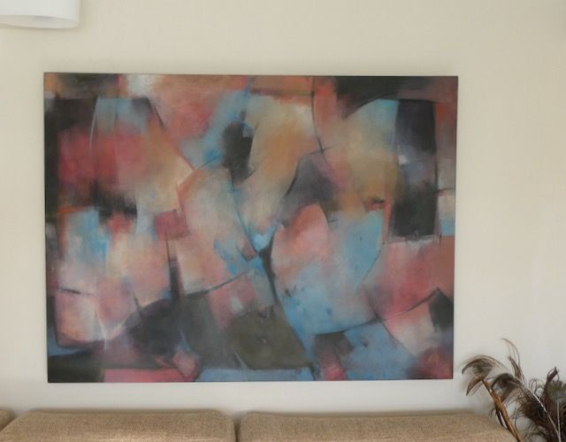 A large rhythmical in strong dramatic colours. The shapes seem to be squeezing together and are contained by outlines of black which seem to hold in a frozen moment. On my wall at home and love it. 91 x 122 cm