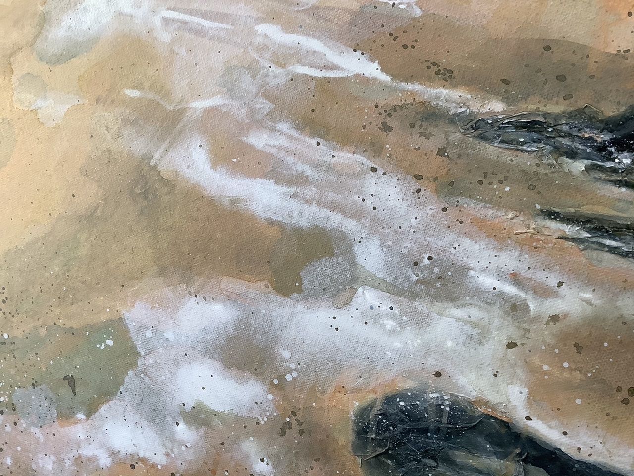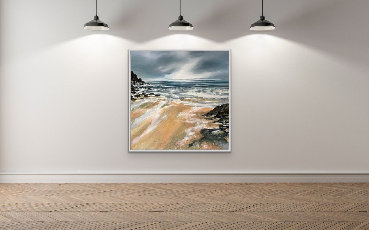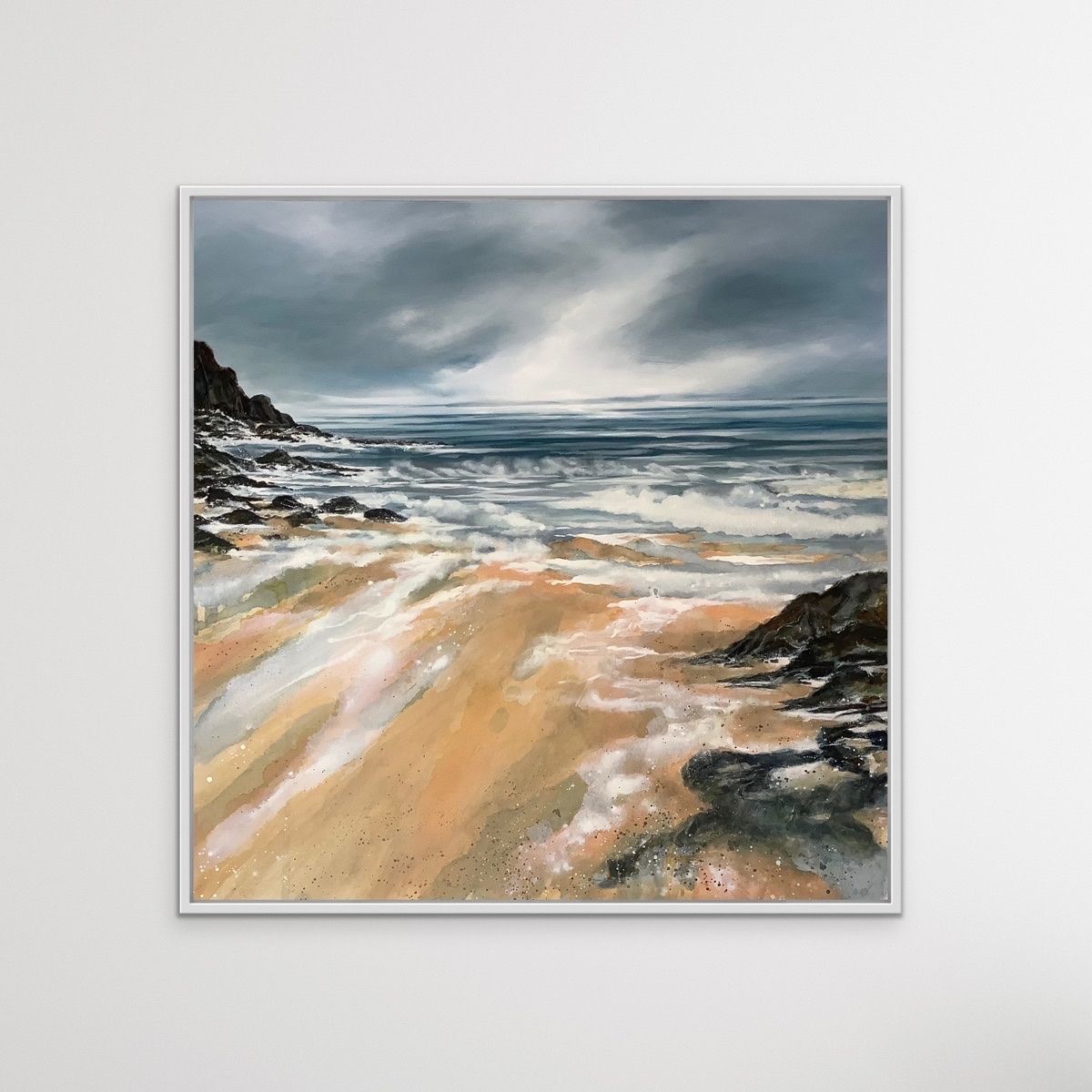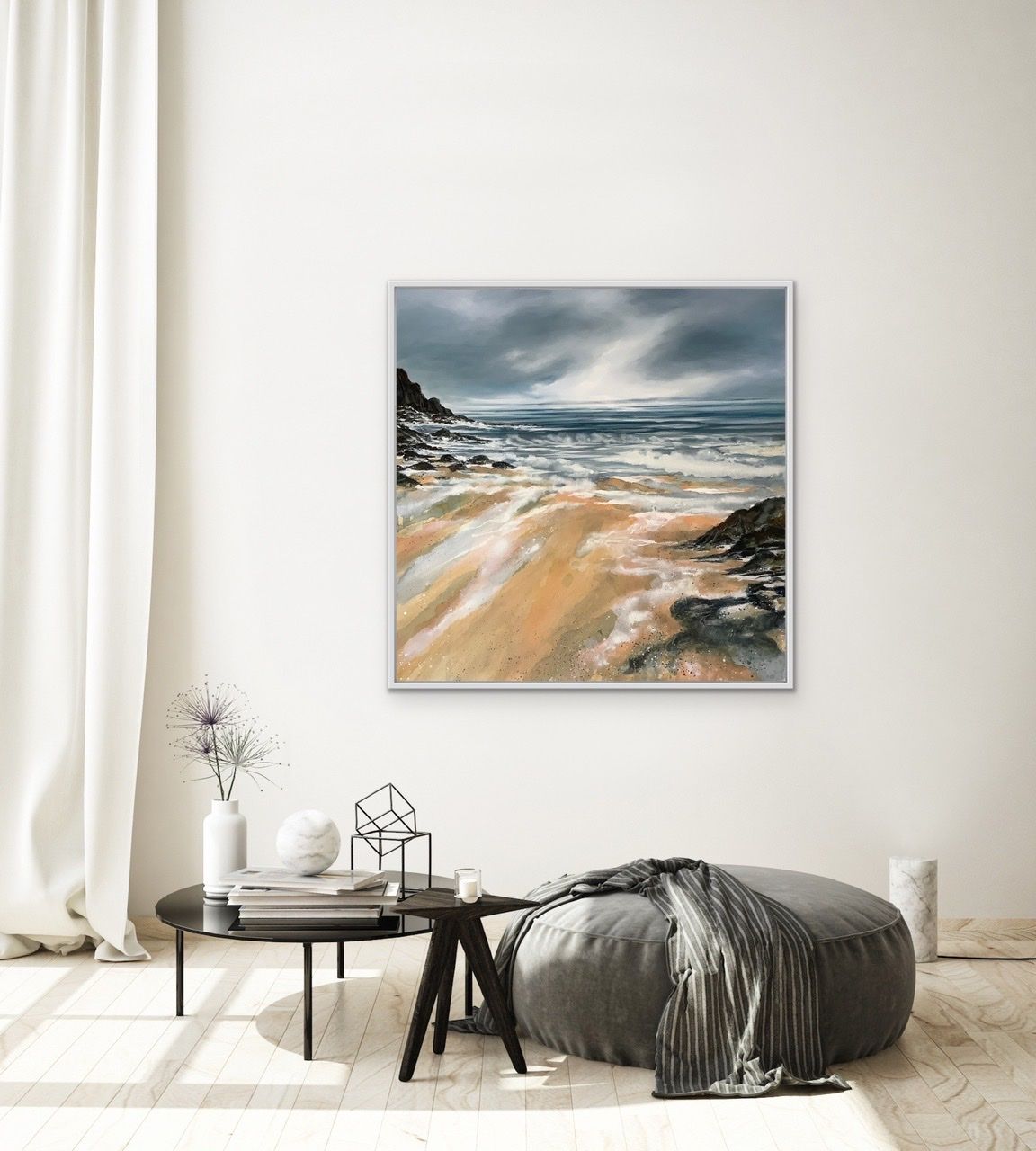 The Secret Cove is an acrylic and ink painting by artist Adele Riley. The scale and depth of this beautifully evocative painting draws the viewer into this work. The chalky, muted colour palette and and composition of this large painting creates a feeling of pure calm and space in