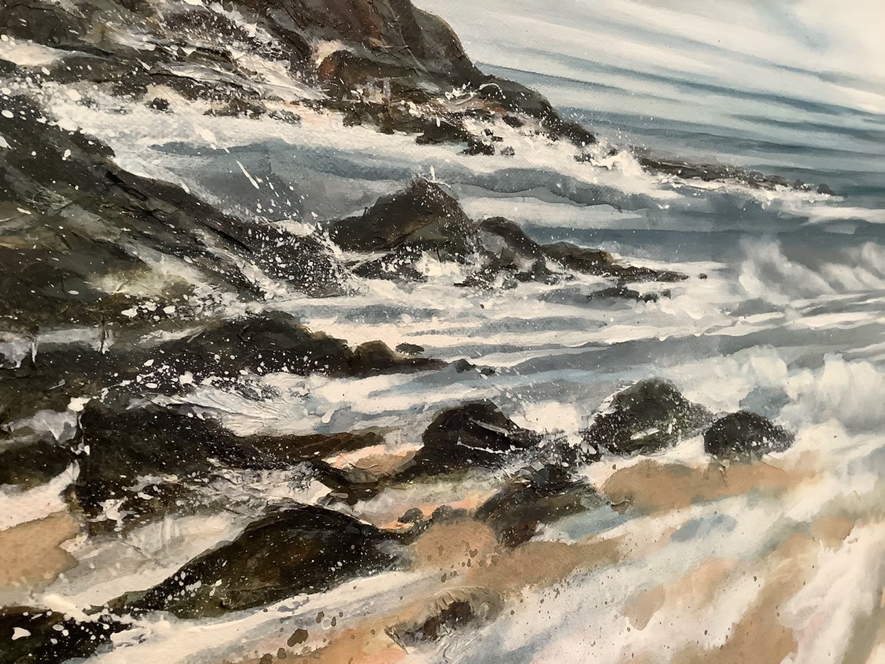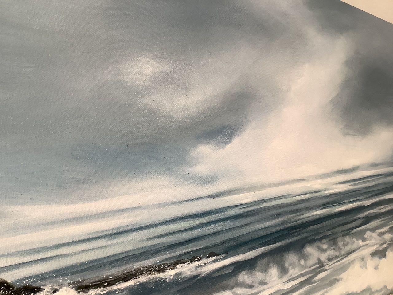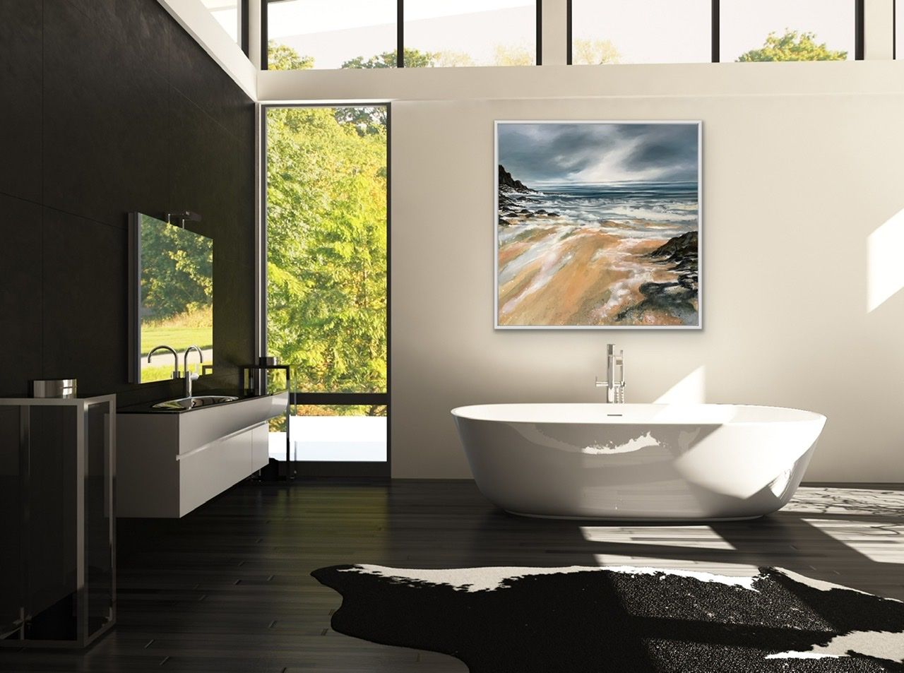 The Secret Cove is an acrylic and ink painting by artist Adele Riley. The scale and depth of this beautifully evocative painting draws the viewer into this work. The chalky, muted colour palette and and composition of this large painting creates a feeling of pure calm and space in