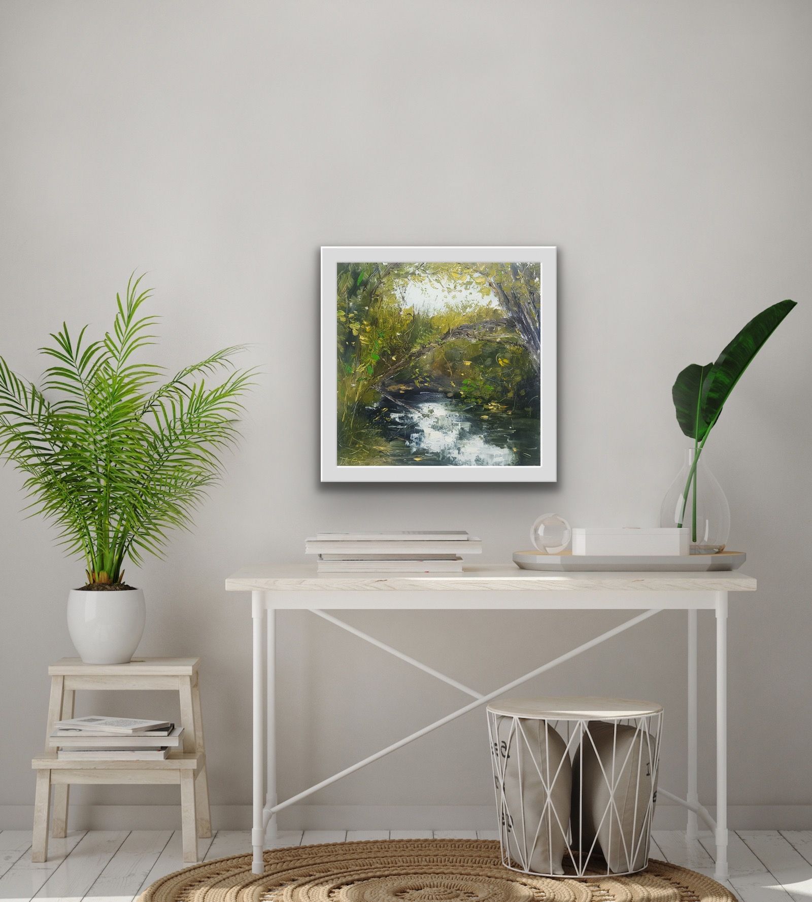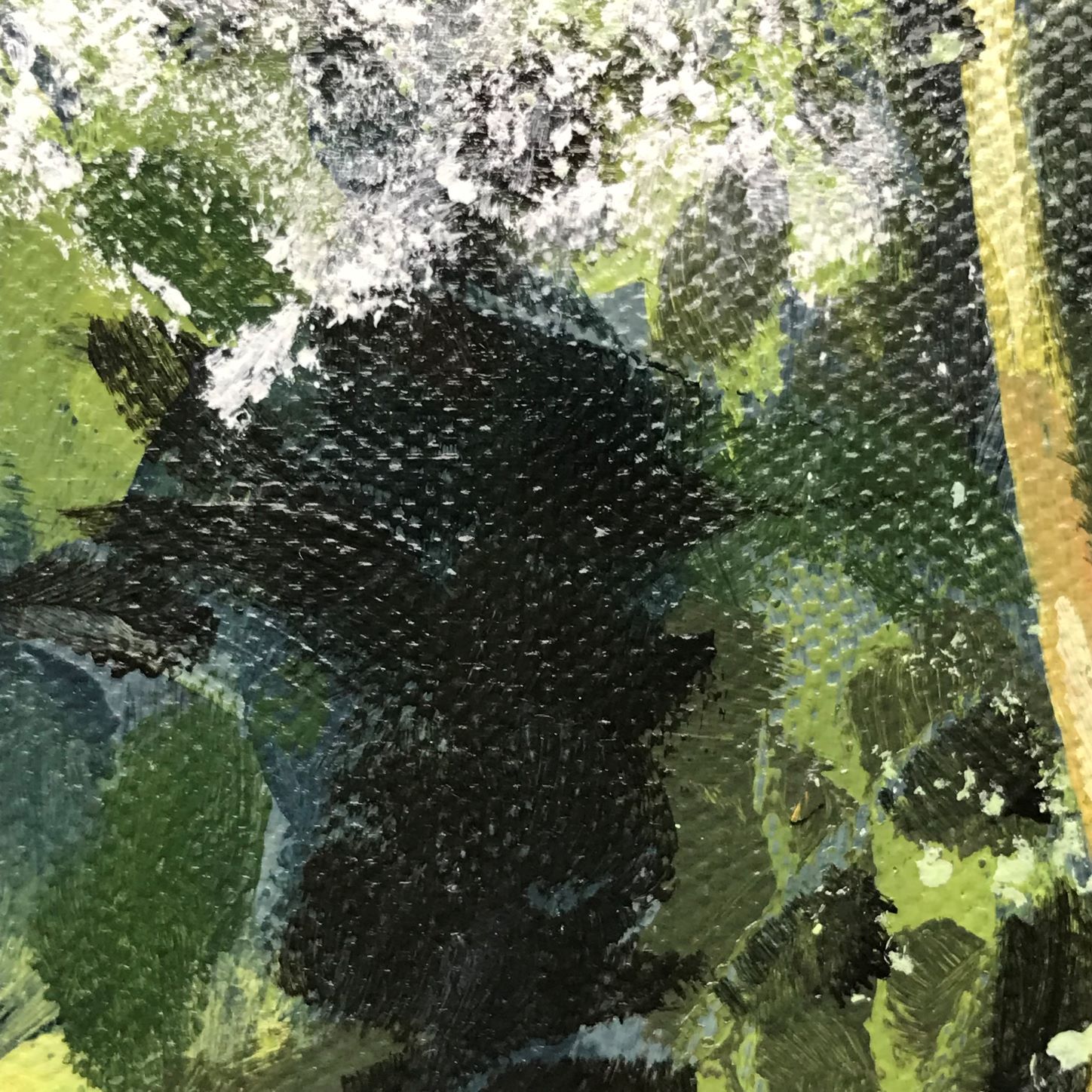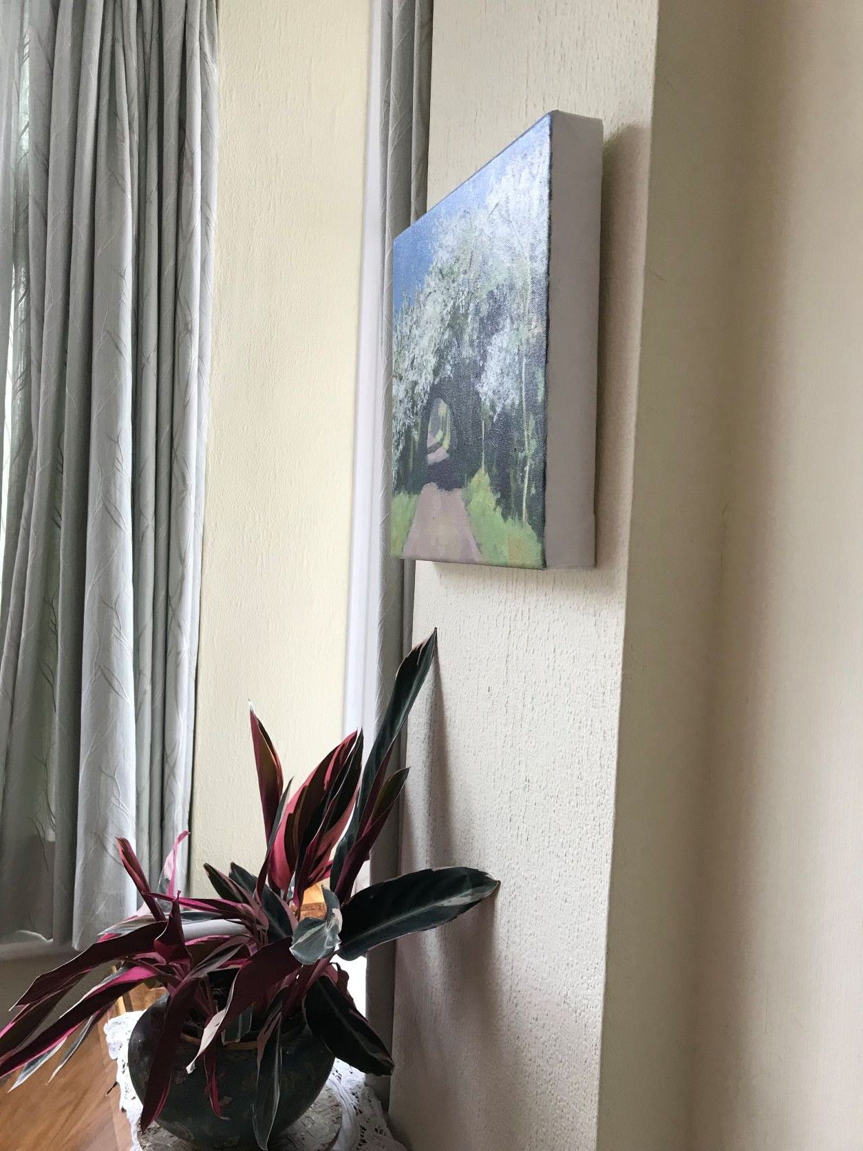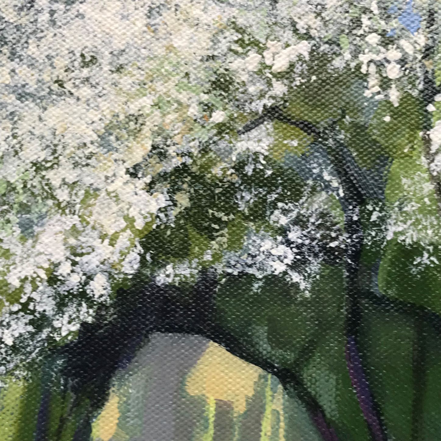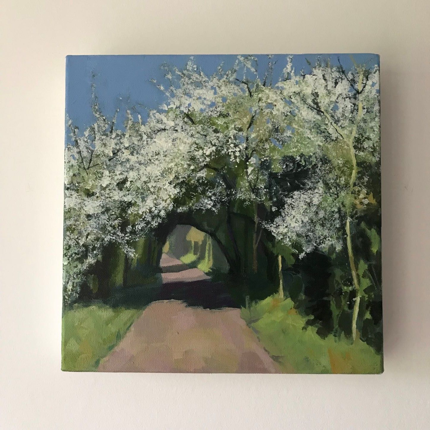 A tunnel through the blackthorn in full bloom, leads us through a dark patch to light beyond. Will our troubles be short-lived? Painted in thick splashes of white acrylic paint, the blossom reminds me of the Houseman poem: 'Loveliest of trees, the cherry now Is hung with bloom along the bough And stands