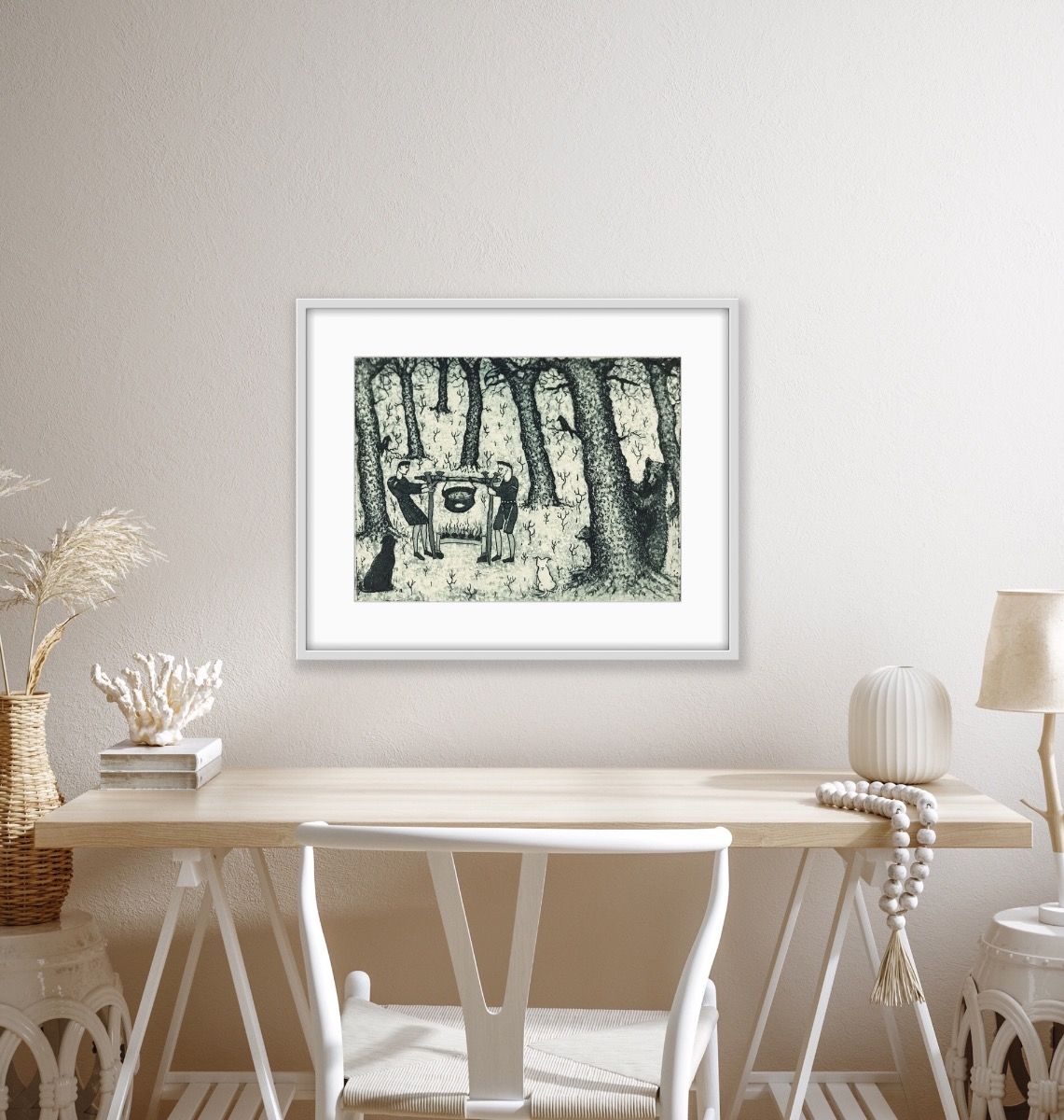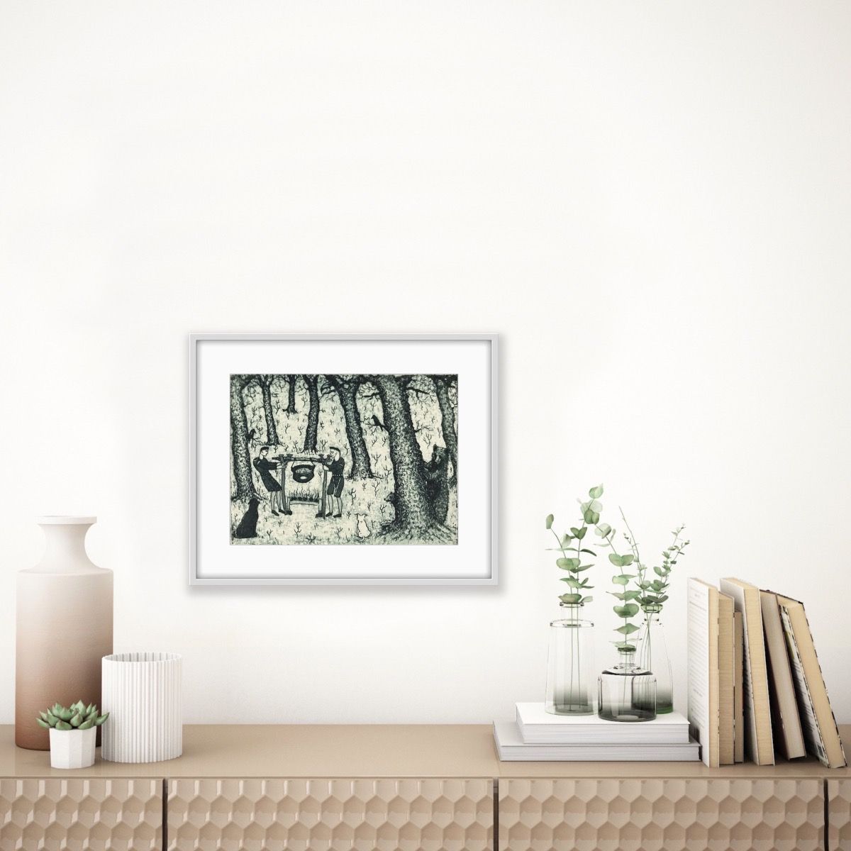 Tim Southall A Feast Etching Print on Paper Image Size: H 7.5cm x W 10cm Paper Size: H 17.5cm x W 20cm Edition of 75 Signed Sold Unframed but Mounted (Please note that in situ images are purely an indication of how a piece may look). In a woodland clearing two young