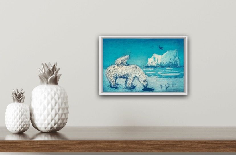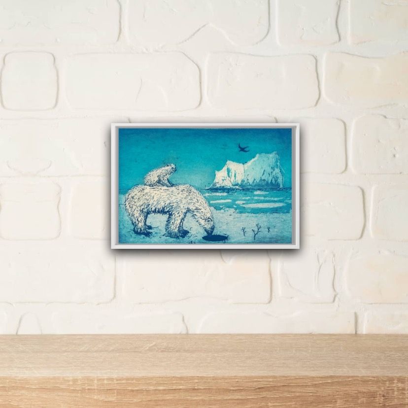 Tim Southall "A Hole in the Ice" Limited Edition Print Edition of 10 'A Hole in the Ice' sees a polar bear peer curiously into an ice hole while a cub sits safely on her back. Two copies of this print are held in the print and drawings dept of the Victoria &