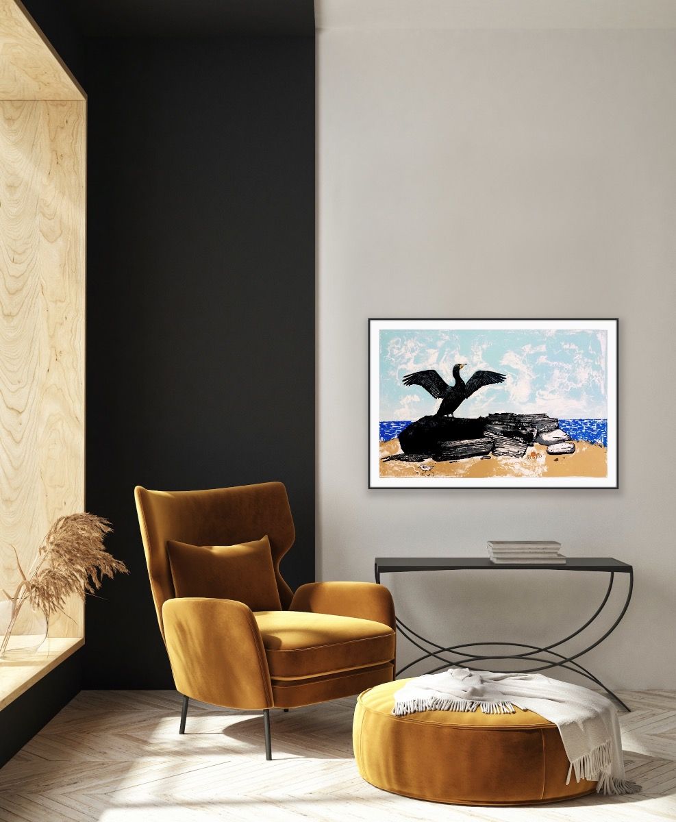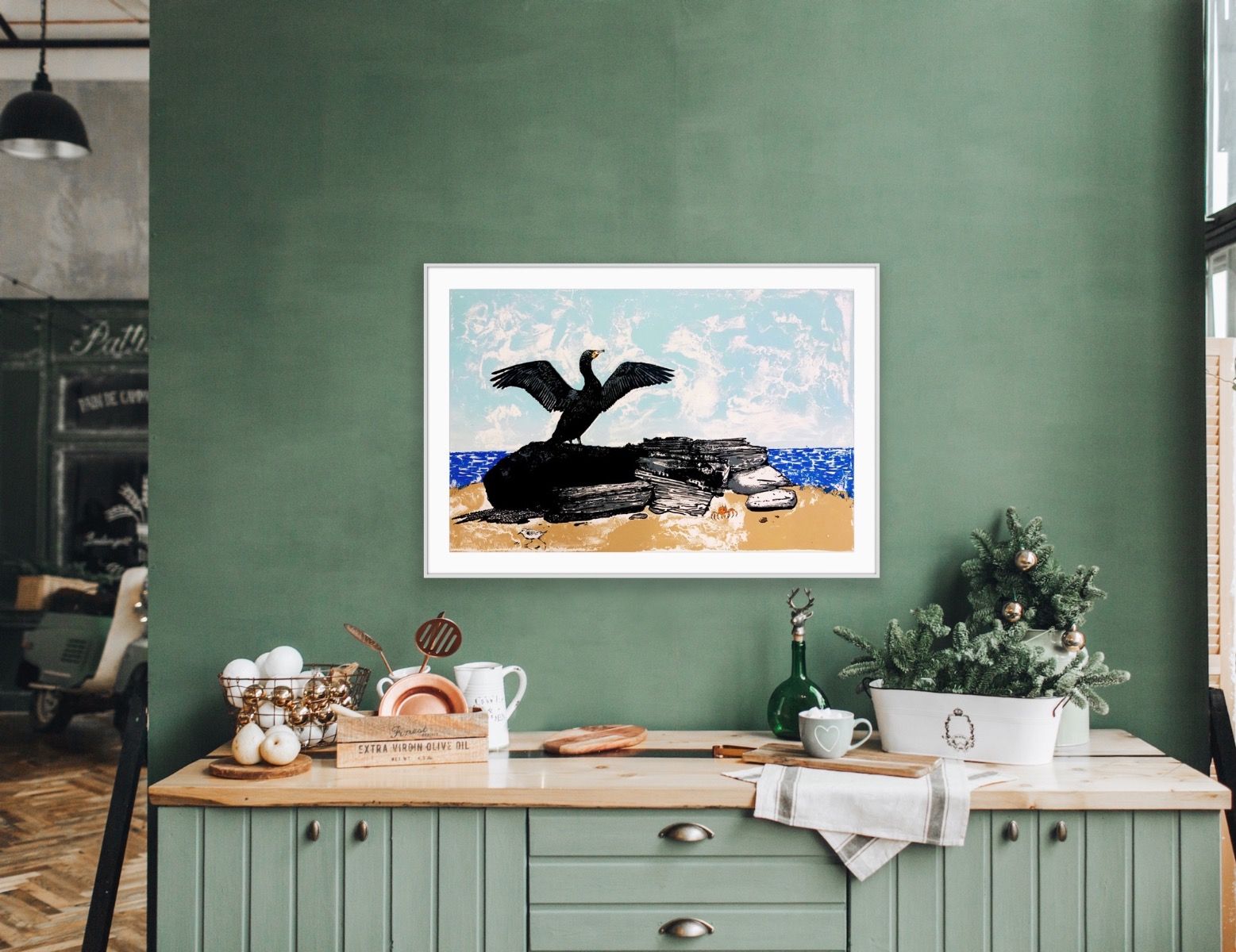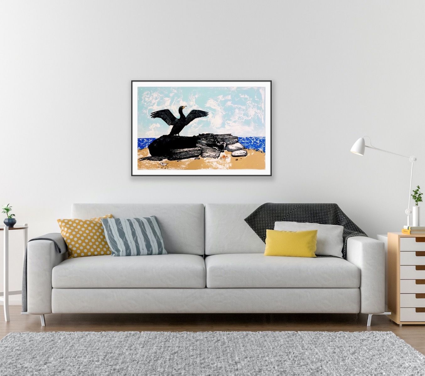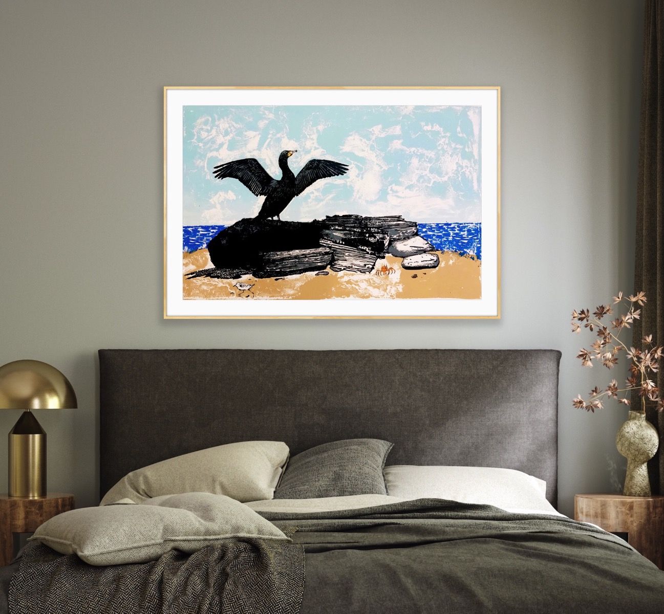 Tim Southall ‘The Cormorant’ Discover artworks by Tim Southall available to buy online and in our art gallery. ‘The Cormorant’ is a seven colour silkscreen print which captures a snapshot of a scene at the beach. The central figure of the cormorant is drying it’s wings following a deep water dive to catch