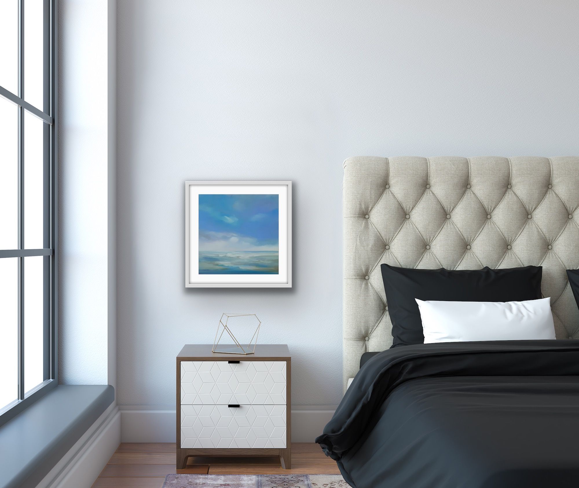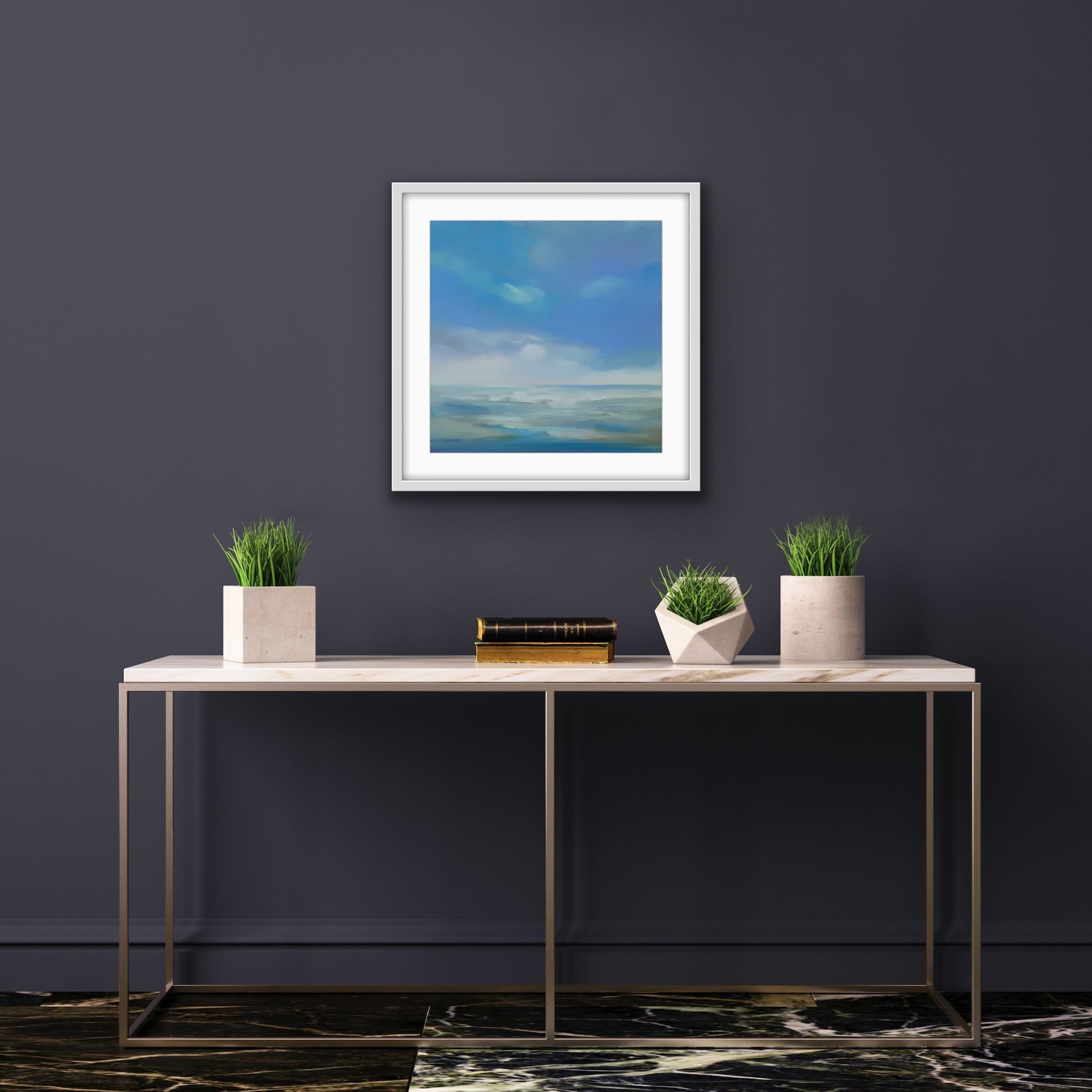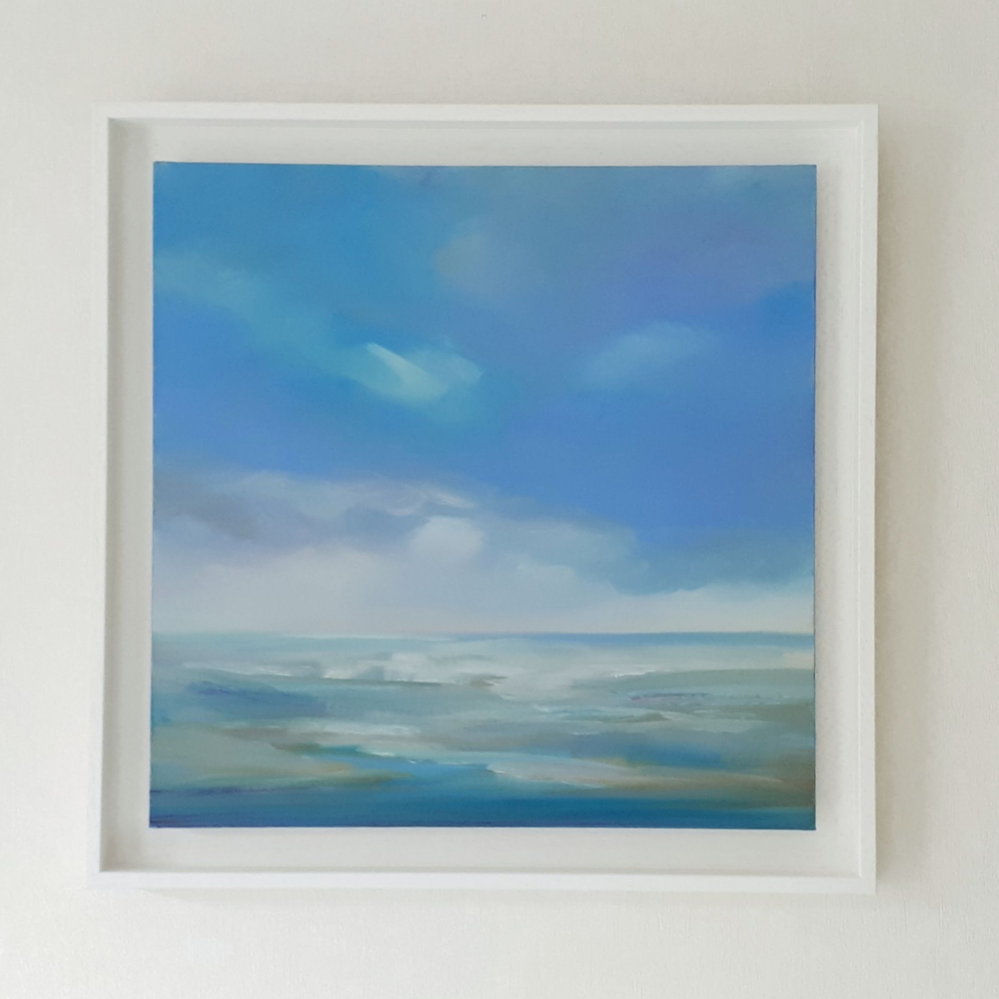 Tranquillity by Helen Robinson is an original oil painting on a 40 x 40 cm canvas board set in a white float frame measuring 47 x 47 x 3.3 cm. It is one of a series of paintings exploring the use of colour and light to create atmospheric seascapes, and