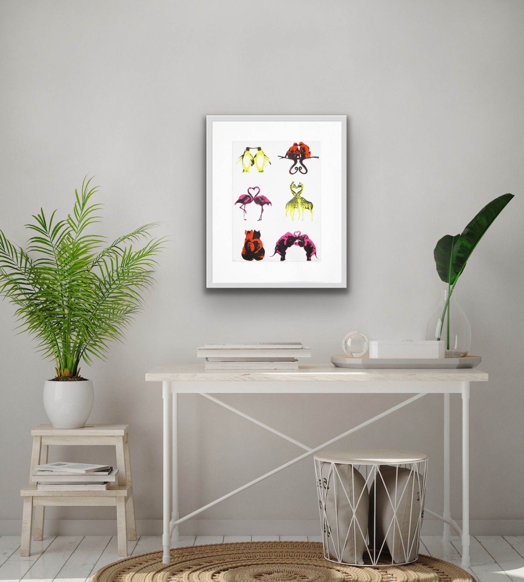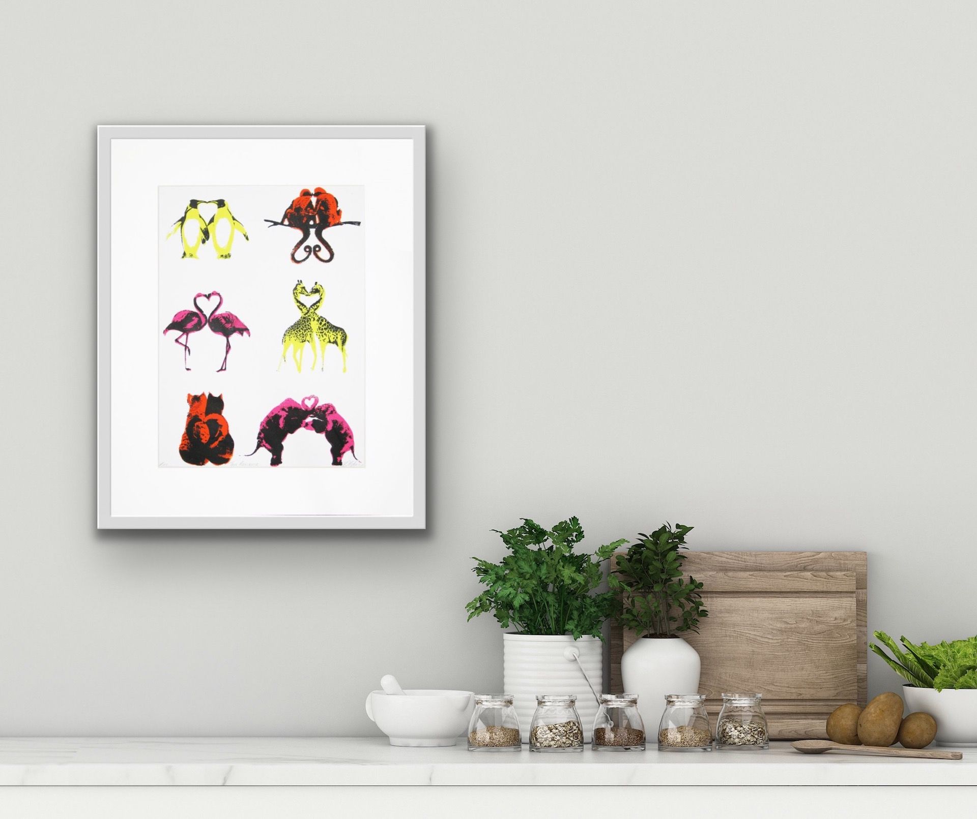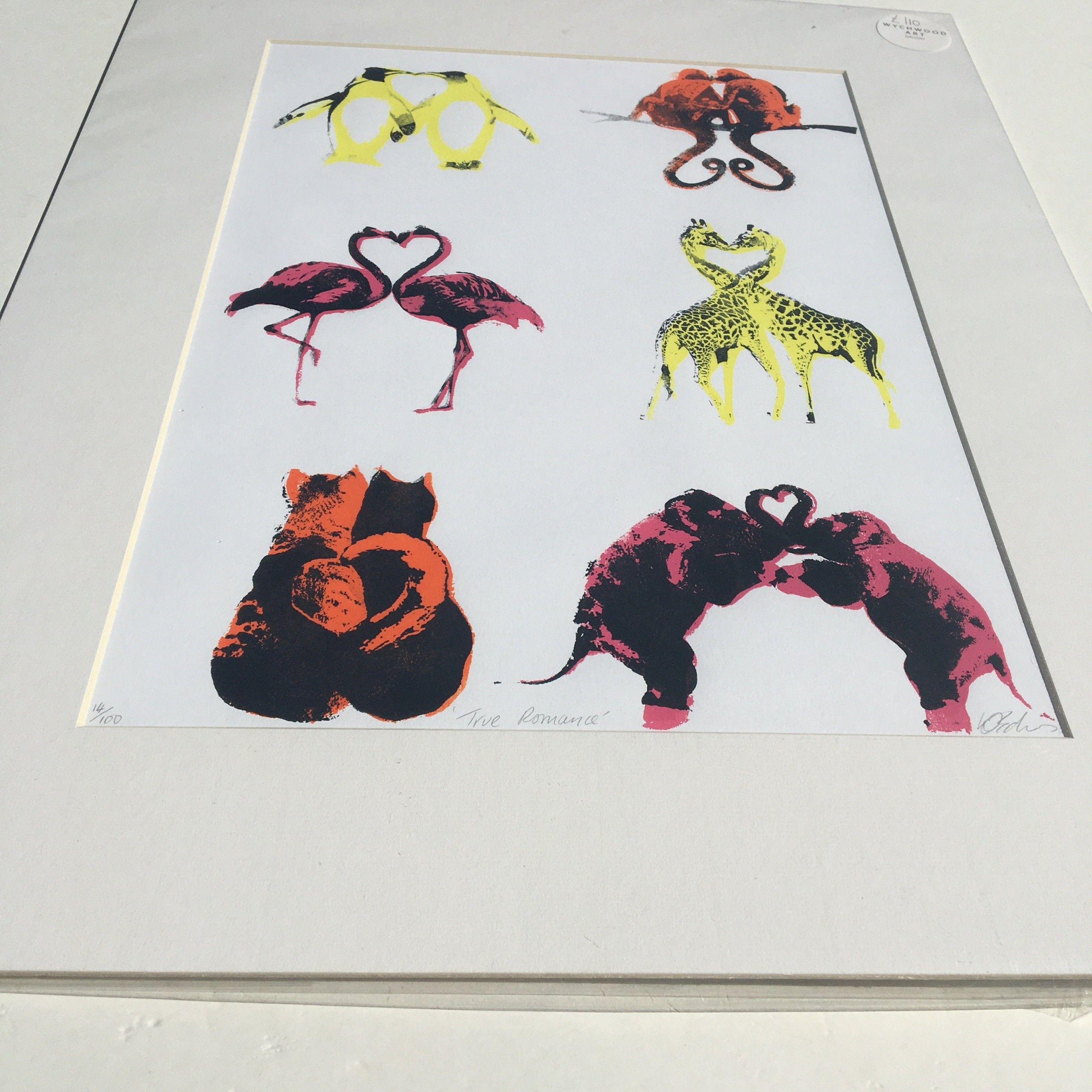 True Romance by Katie Edwards- created in 2015 for a special Valentine's Art Exhibition, this colourful and fun illustration represent True Romance in the animal world. Limited Edition screen print of 100, 4 colour screen print on Fabriano Ruvidi 200gsm paper. This work is sold mounted but not framed. Signed, numbered and