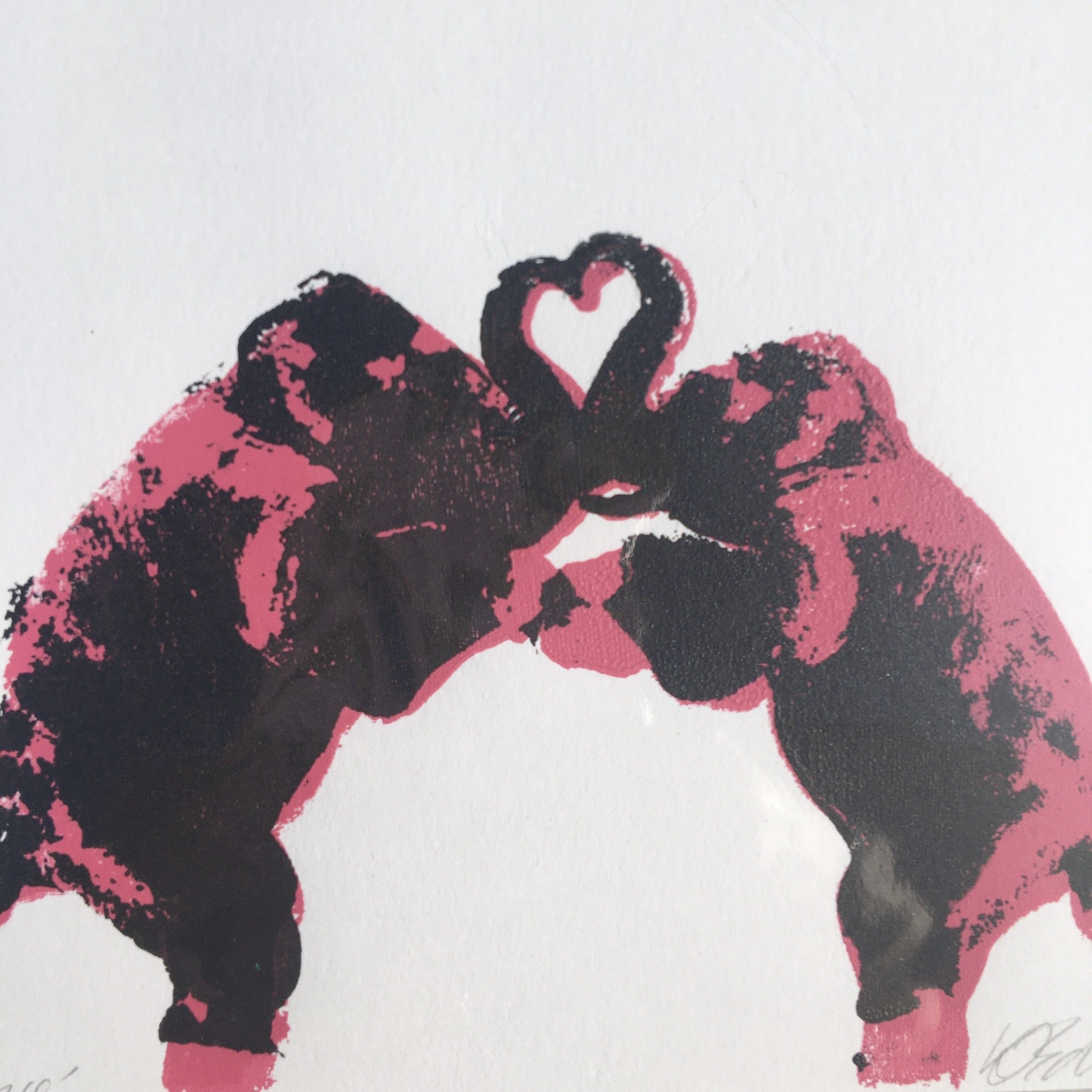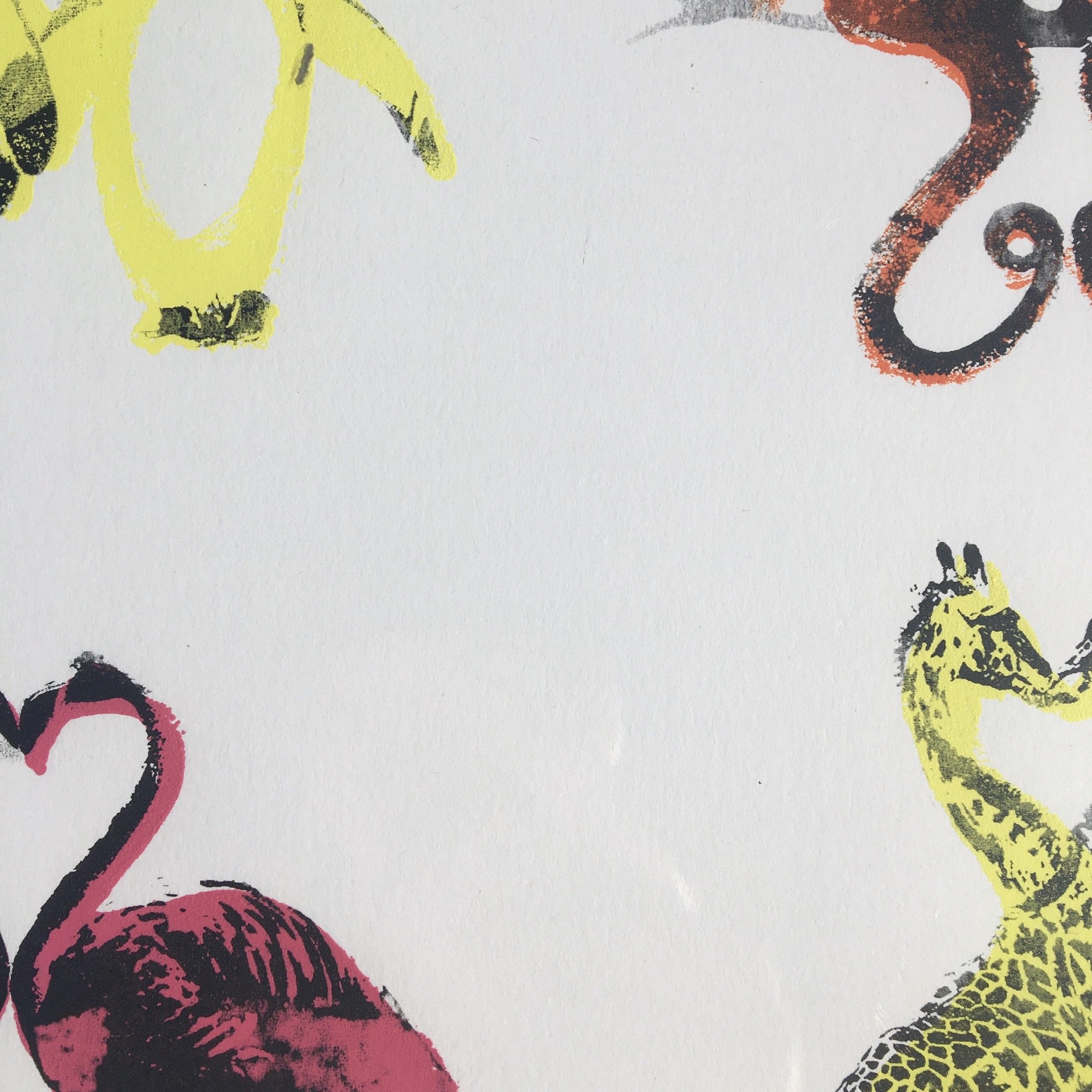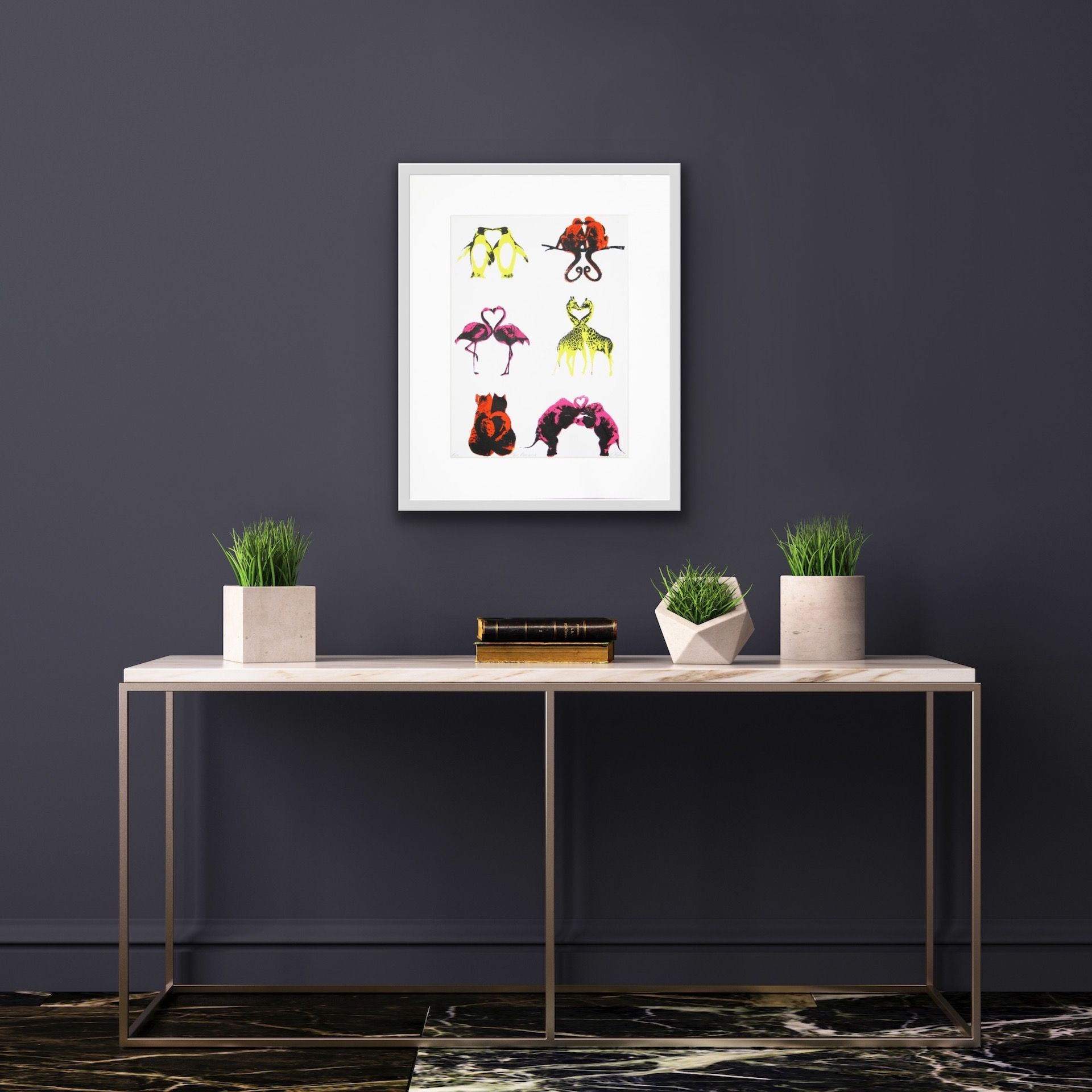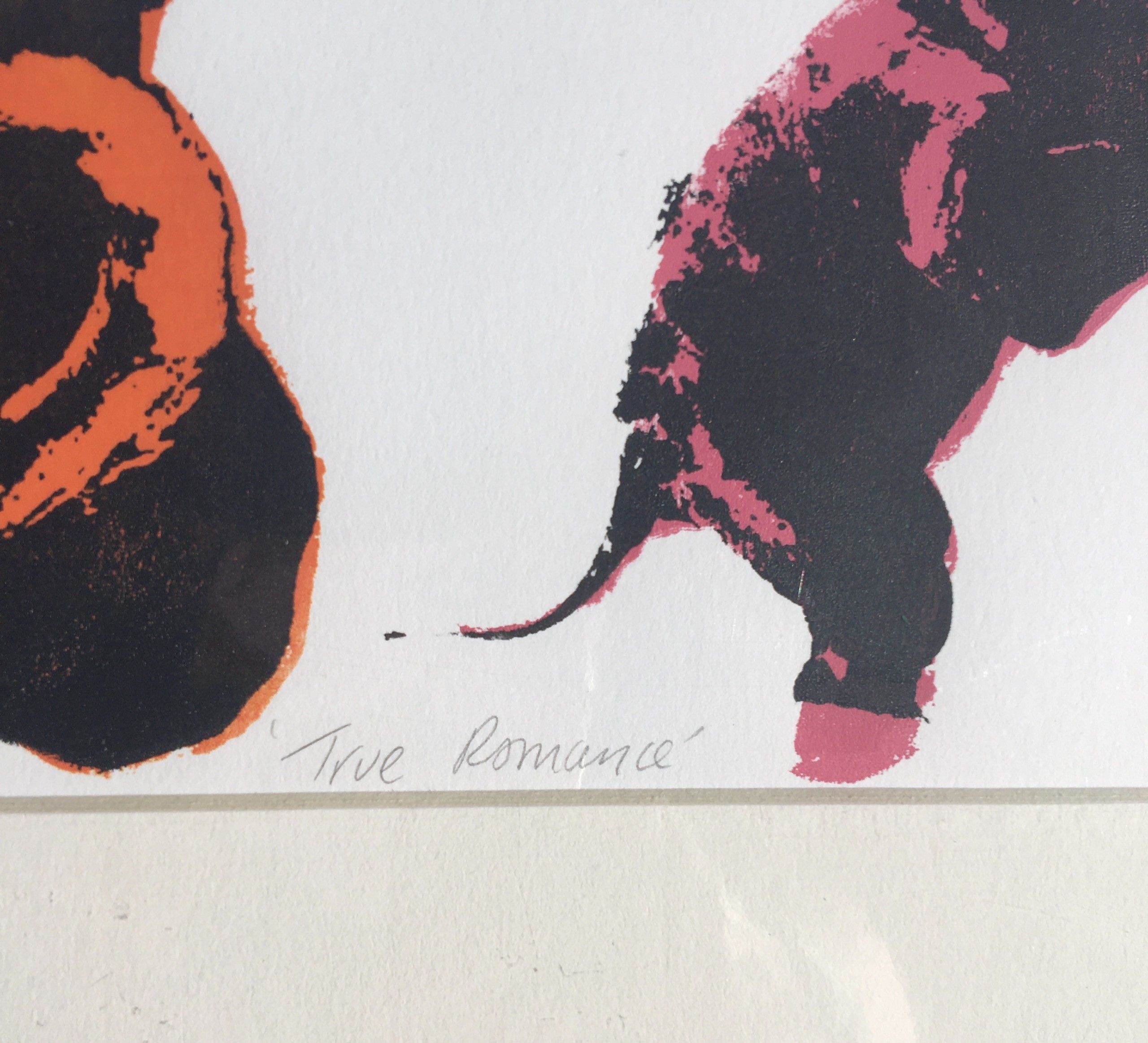 True Romance by Katie Edwards- created in 2015 for a special Valentine's Art Exhibition, this colourful and fun illustration represent True Romance in the animal world. Limited Edition screen print of 100, 4 colour screen print on Fabriano Ruvidi 200gsm paper. This work is sold mounted but not framed. Signed, numbered and