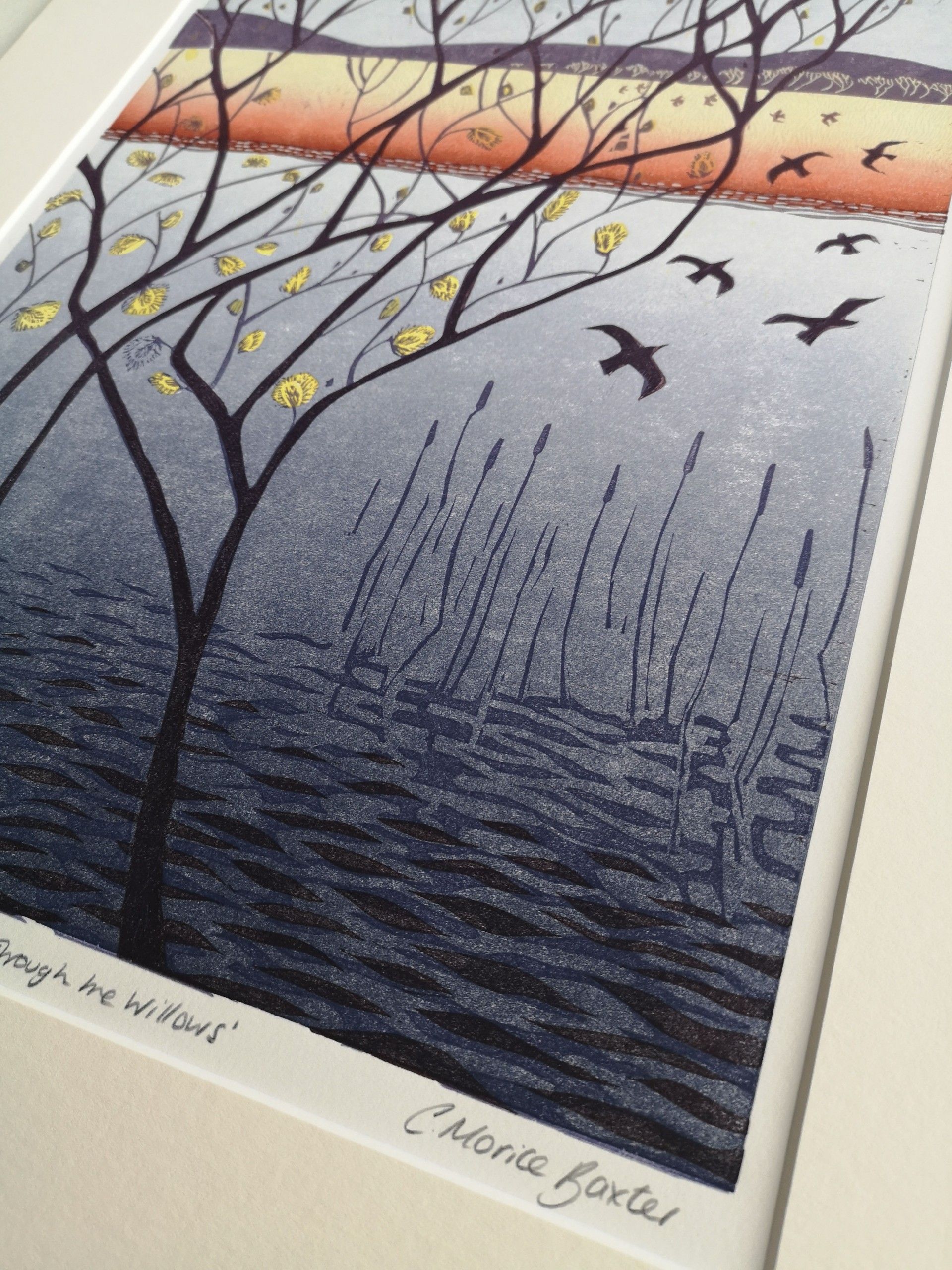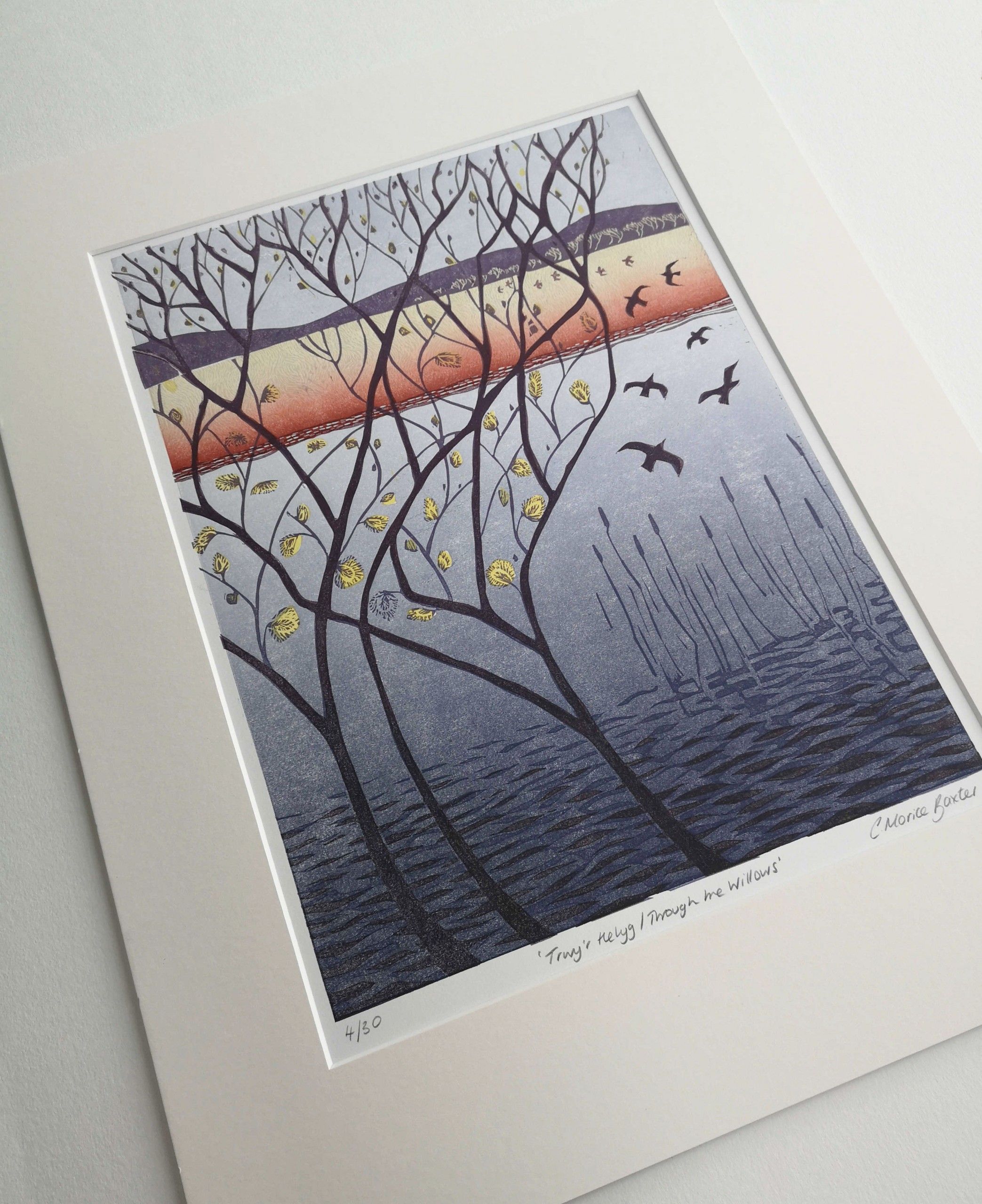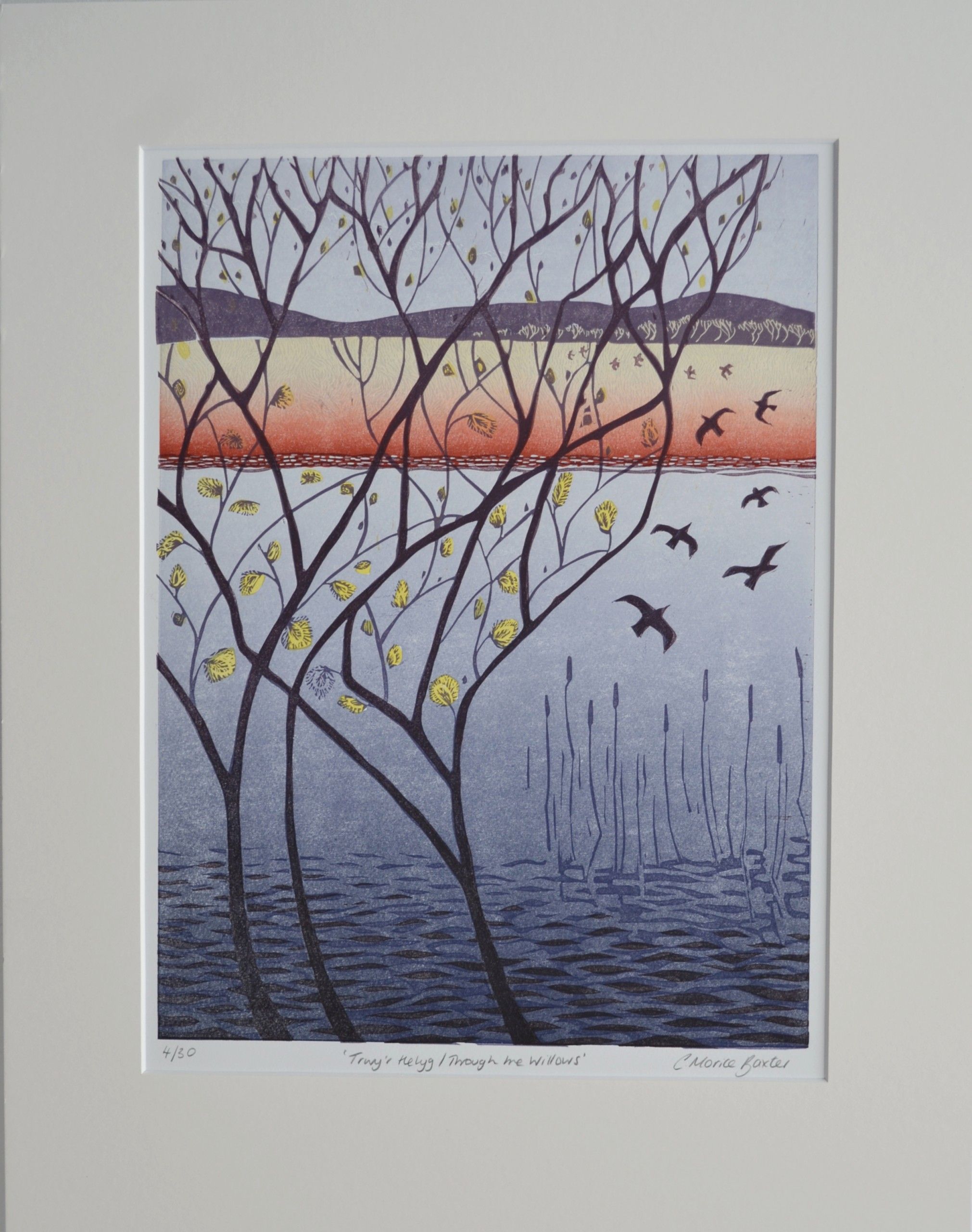 Charlotte Baxter print TRWY'R HELYG was inspired by the striking yellow catkins that grow near the water’s edge of ‘Cors Caron’ and the shapes and patterns that are created in the landscape when viewed through the branches. Print is supplied in an acid free mount.