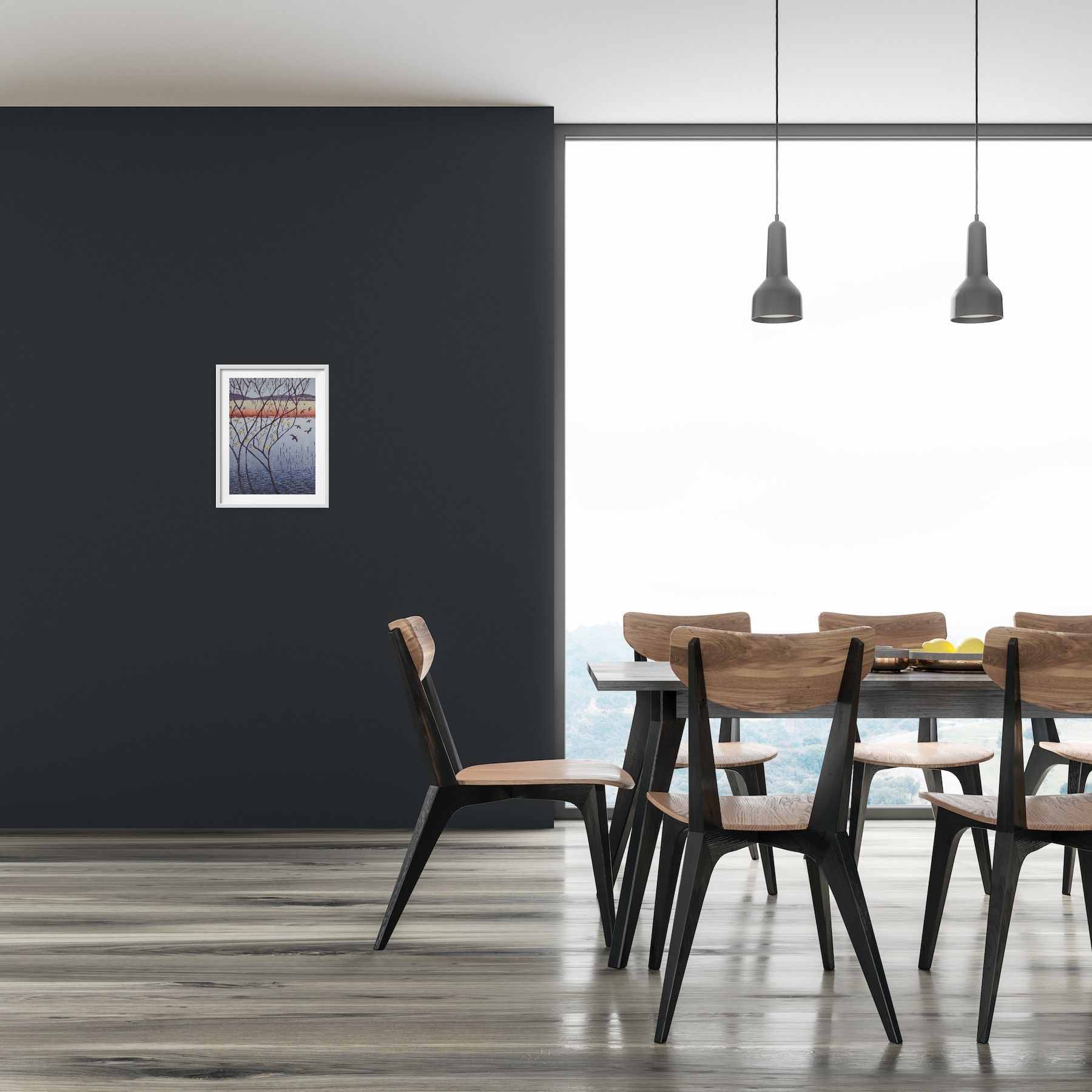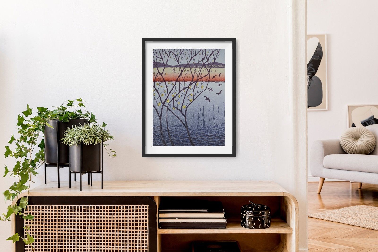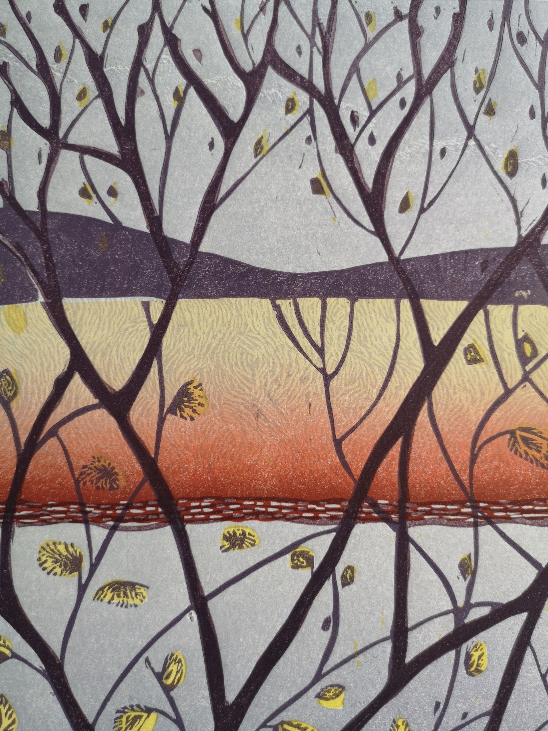 Charlotte Baxter print TRWY'R HELYG was inspired by the striking yellow catkins that grow near the water’s edge of ‘Cors Caron’ and the shapes and patterns that are created in the landscape when viewed through the branches. Print is supplied in an acid free mount.