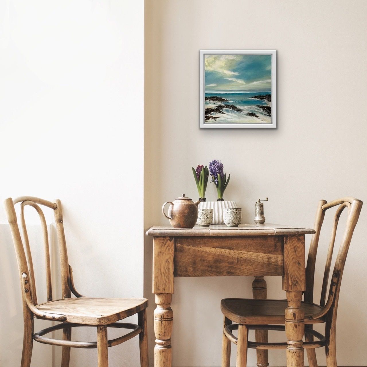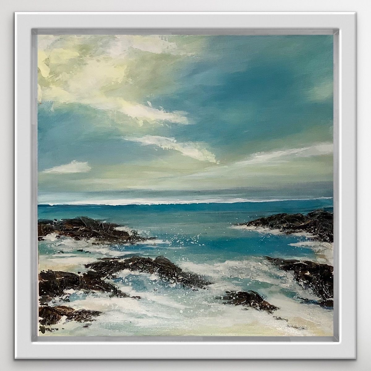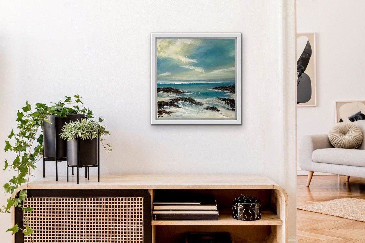 Turning Tide is a beautifully calm seascape painting by artist Adele Riley. Her love of the Cornish coastline and her obsession with catching the light, atmosphere and it’s constantly changing weather, gives Adele lots of inspiration for her seascapes. This gentle but impactful painting with its soft, subtle chalky sky,