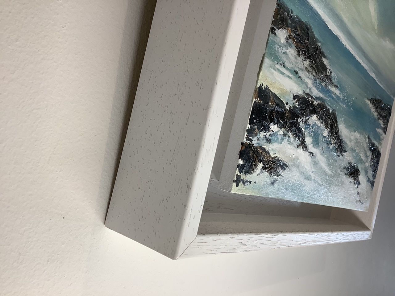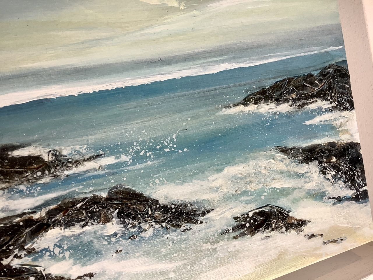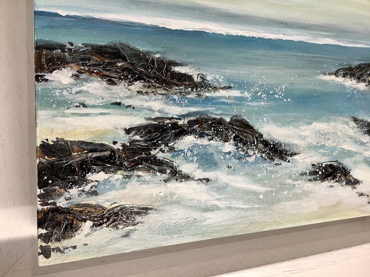 Turning Tide is a beautifully calm seascape painting by artist Adele Riley. Her love of the Cornish coastline and her obsession with catching the light, atmosphere and it’s constantly changing weather, gives Adele lots of inspiration for her seascapes. This gentle but impactful painting with its soft, subtle chalky sky,