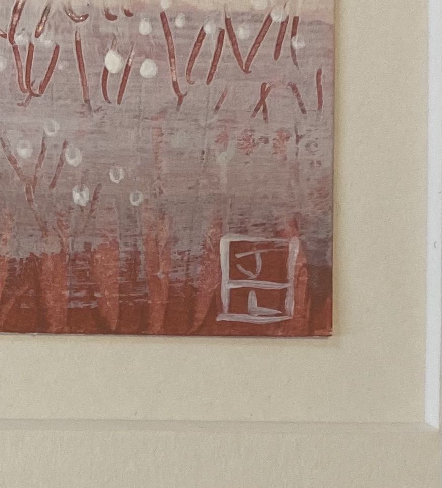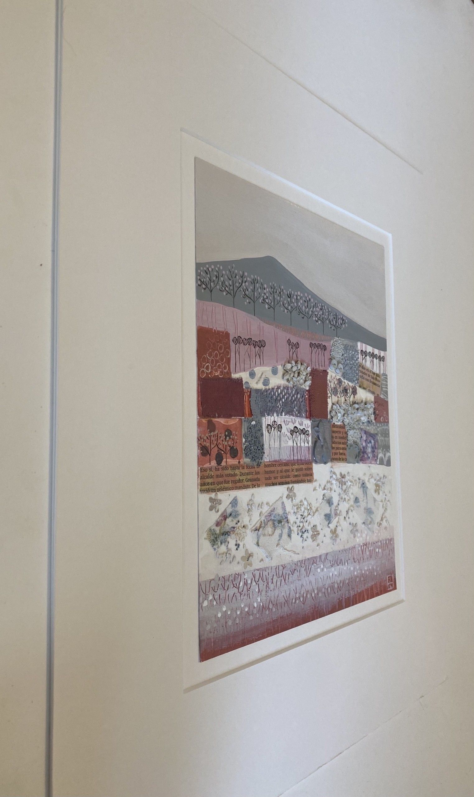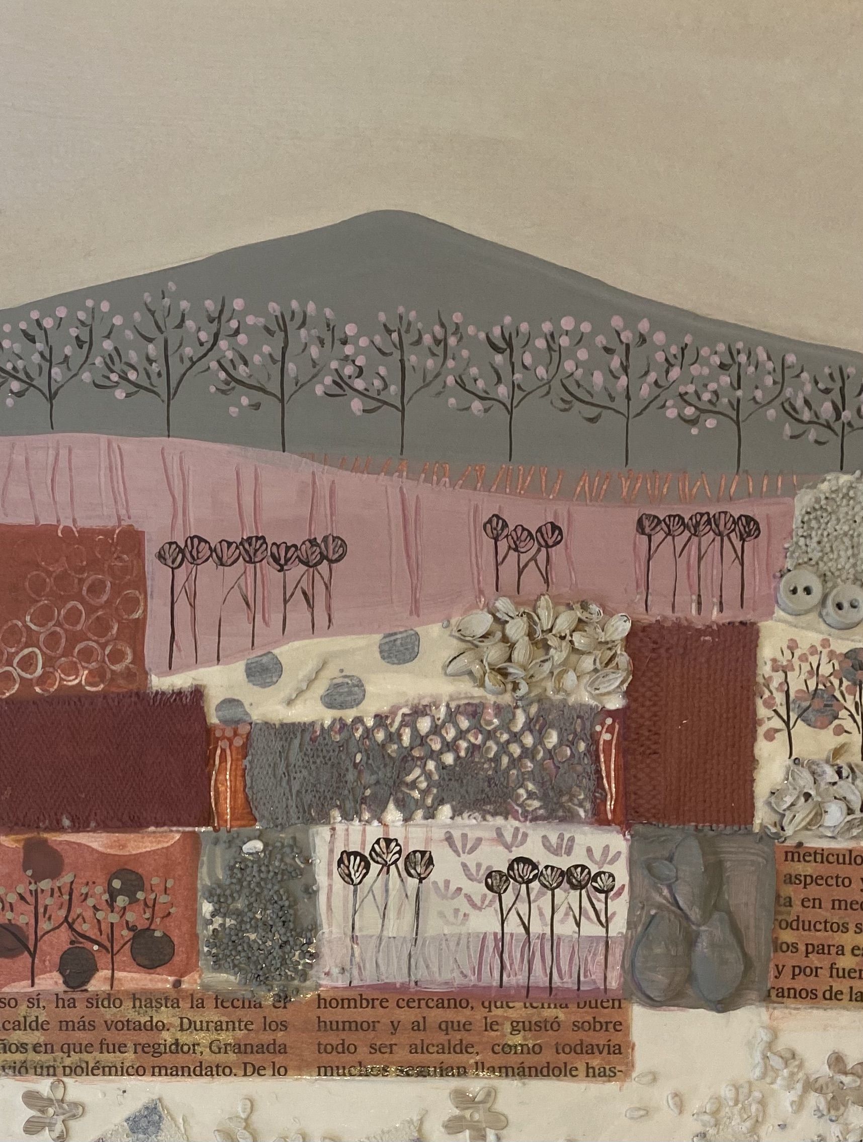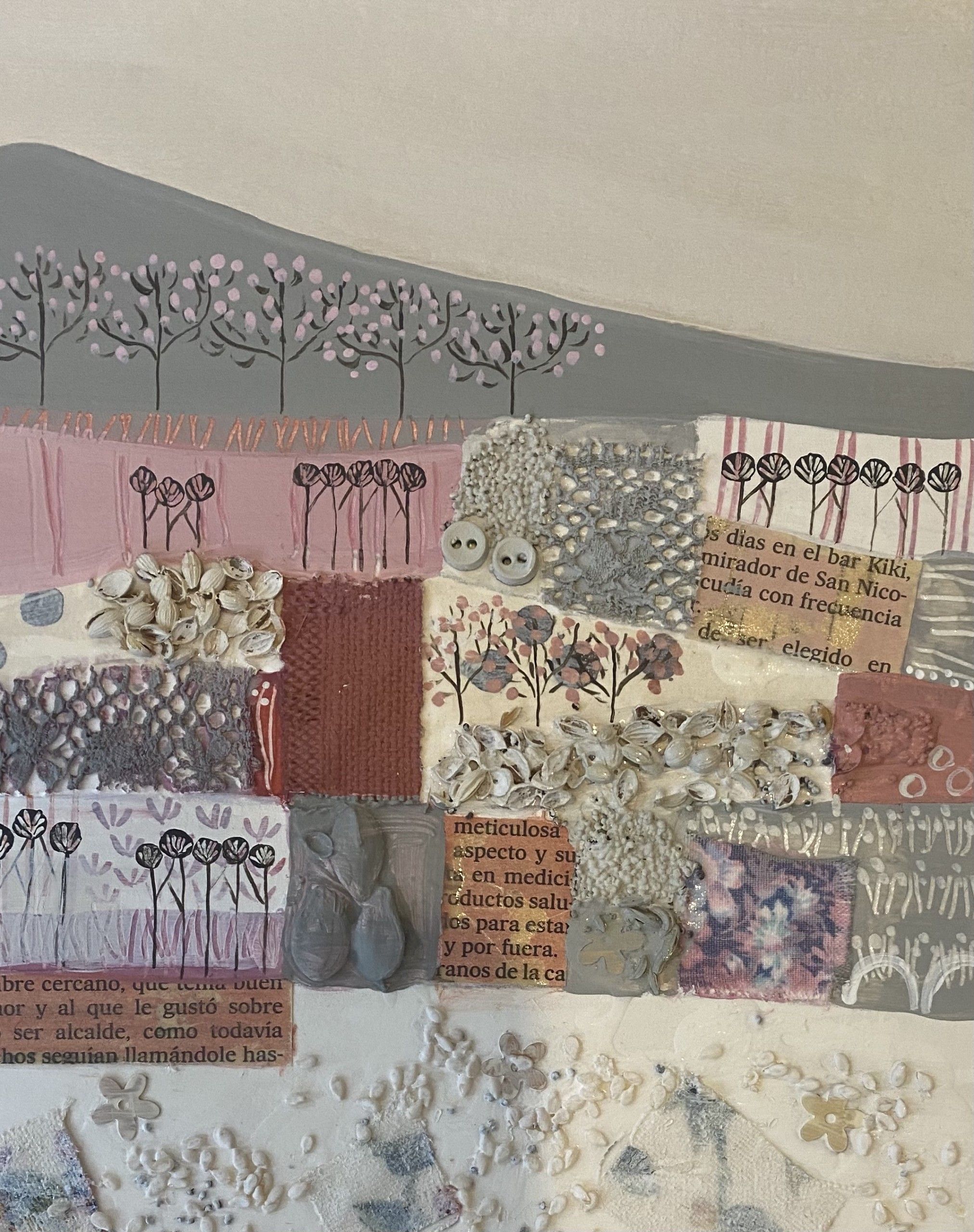 Jessica Leighton- Valentines Fields– acrylic mixed media painting of cotswold fields. Mounted on card: ~ 42 x 36 cm overall, painting size: ~ 25 x 20 cm, Unframed Created with a collage of seeds, newspaper clips, fabrics and layers of paint which are scratched away to create an organic texture. This work
