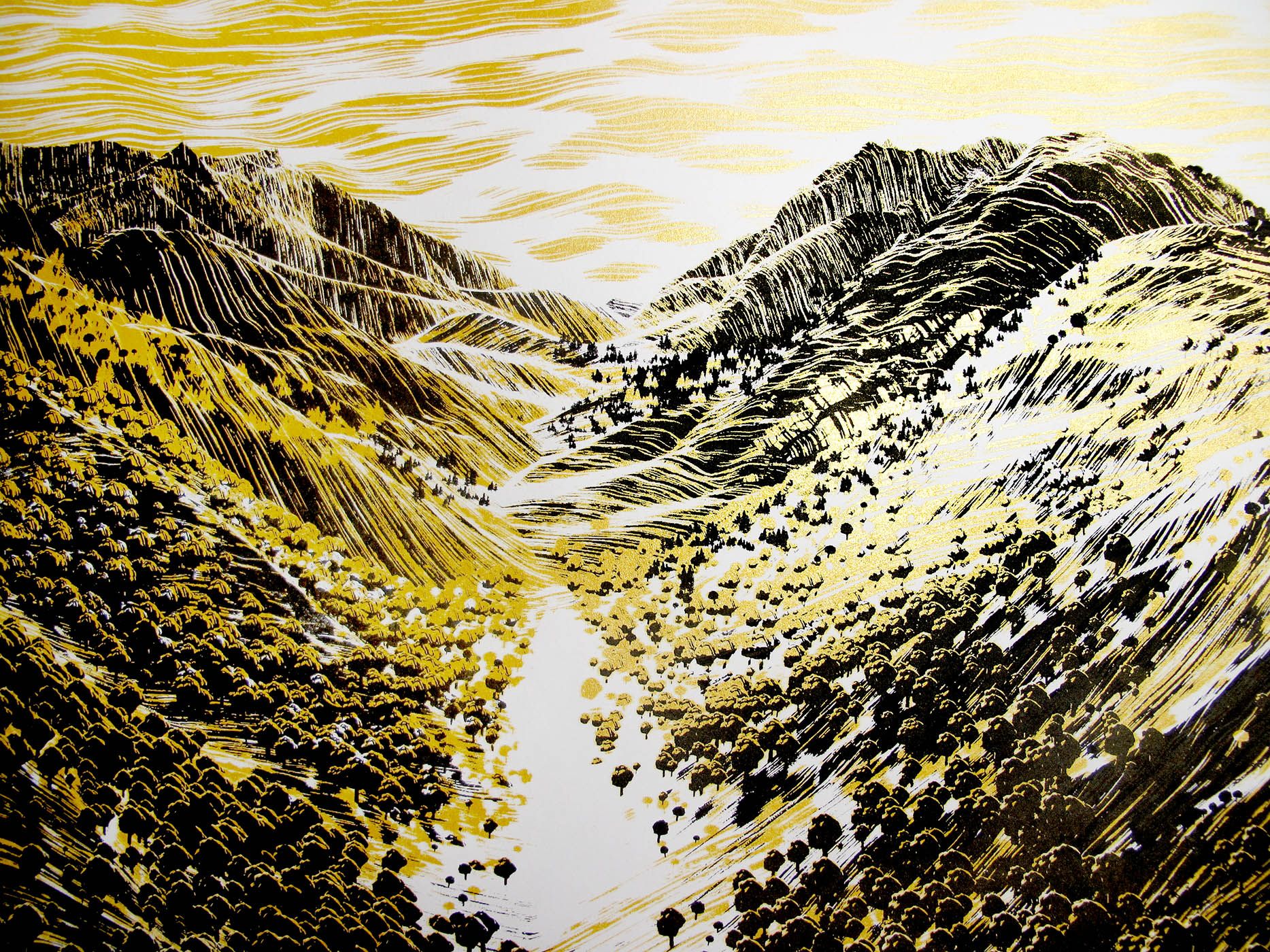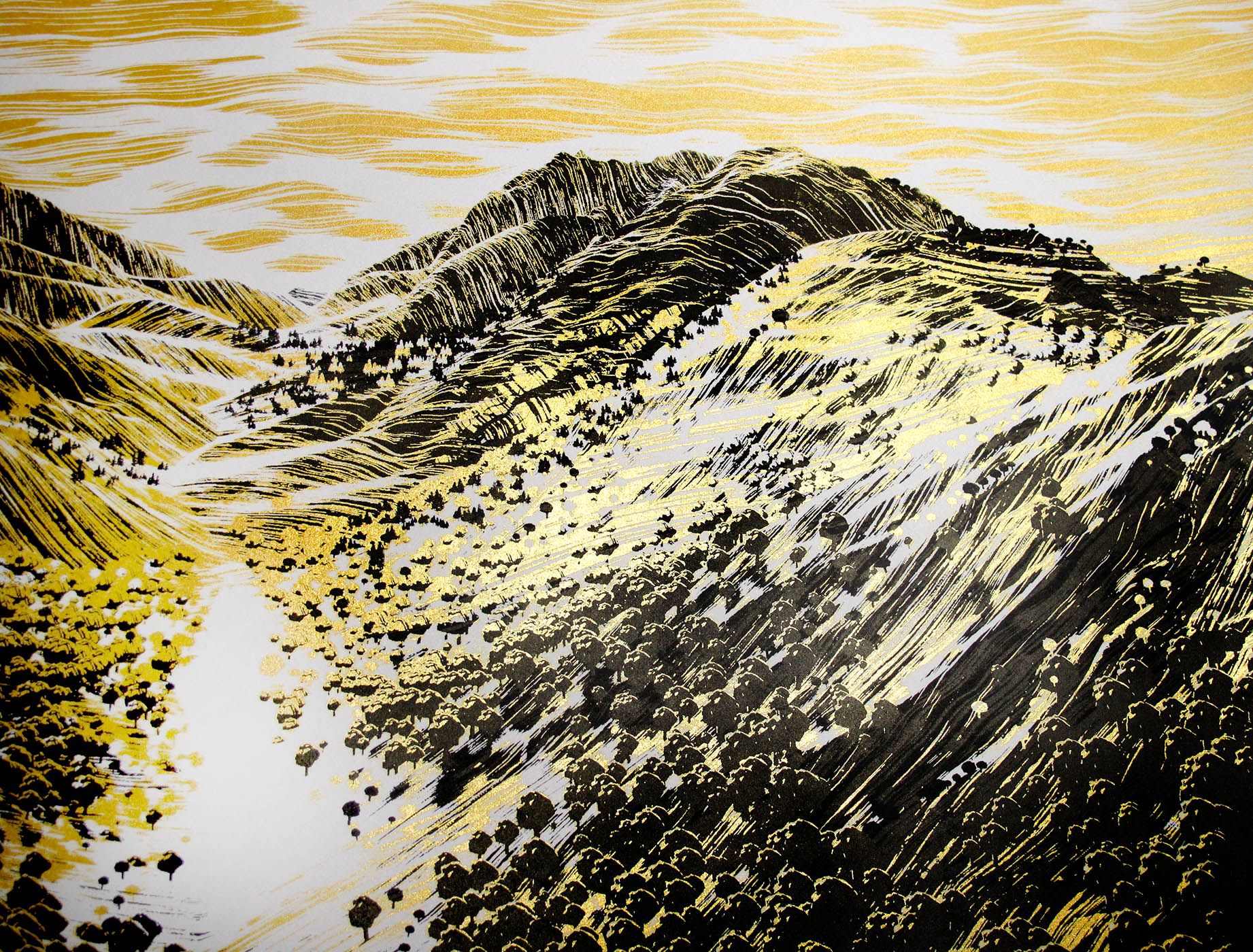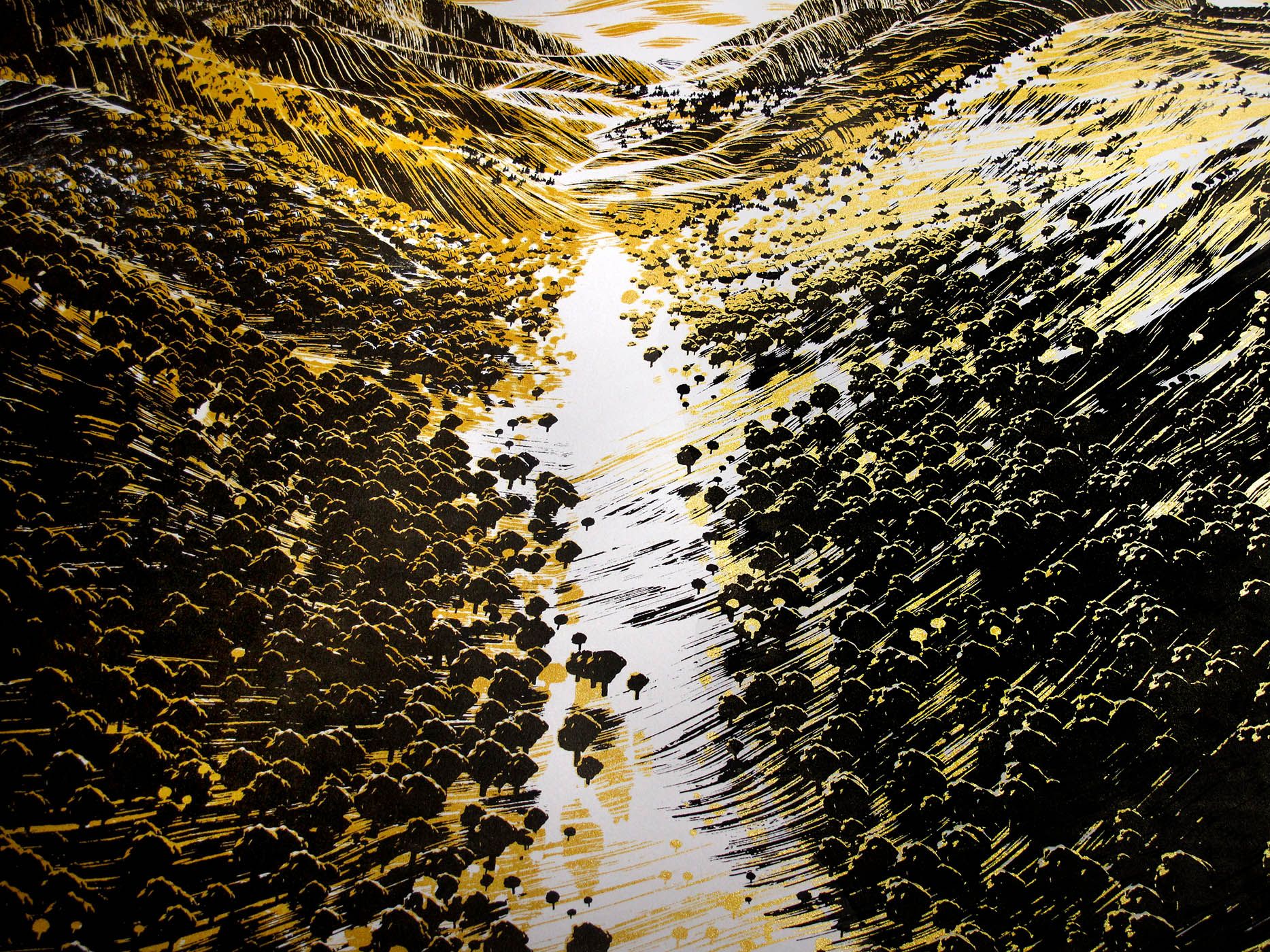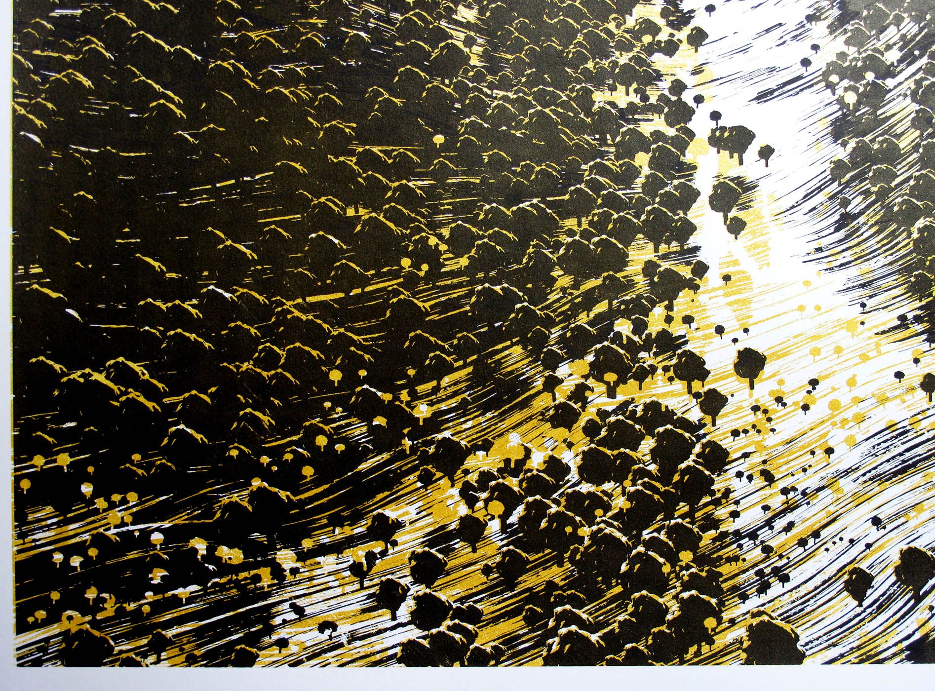 This is a metallic and Black Two colour screen print. The lines create an overlapping positive and negative landscape interweaving and overlapping metallic and black inked mark making. The Metallic under-layer enhances the interplay between the landscape and dynamic shafts of light interweaving in and out of the trees and