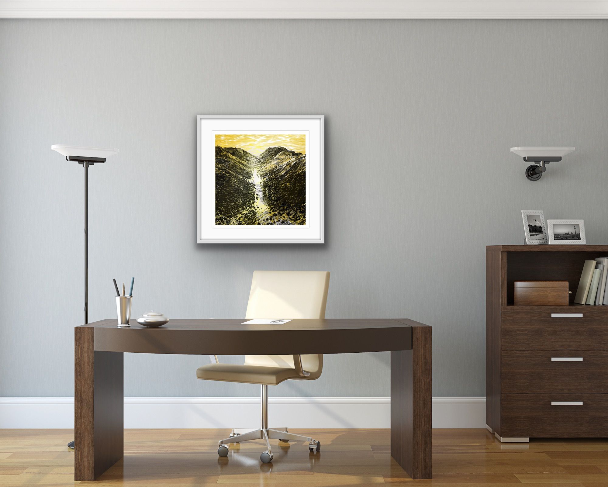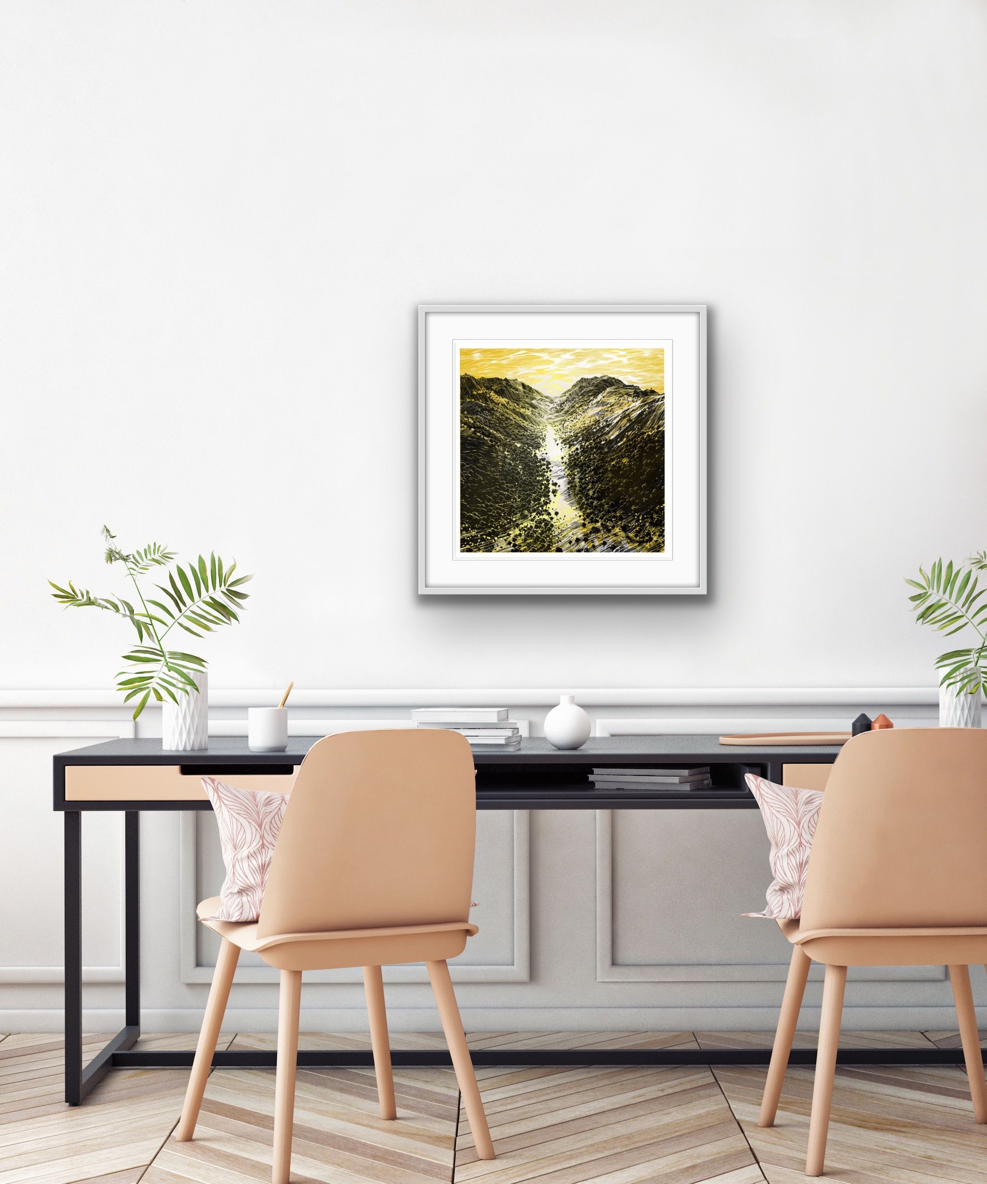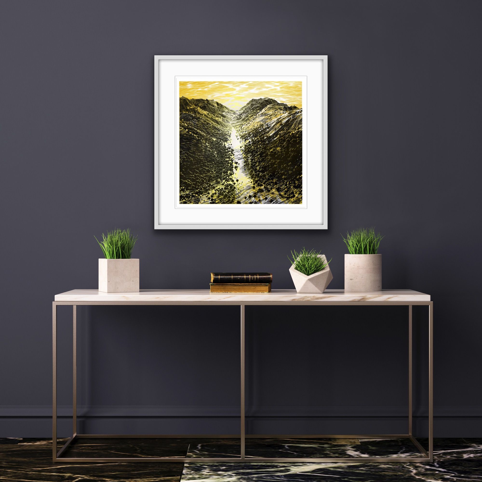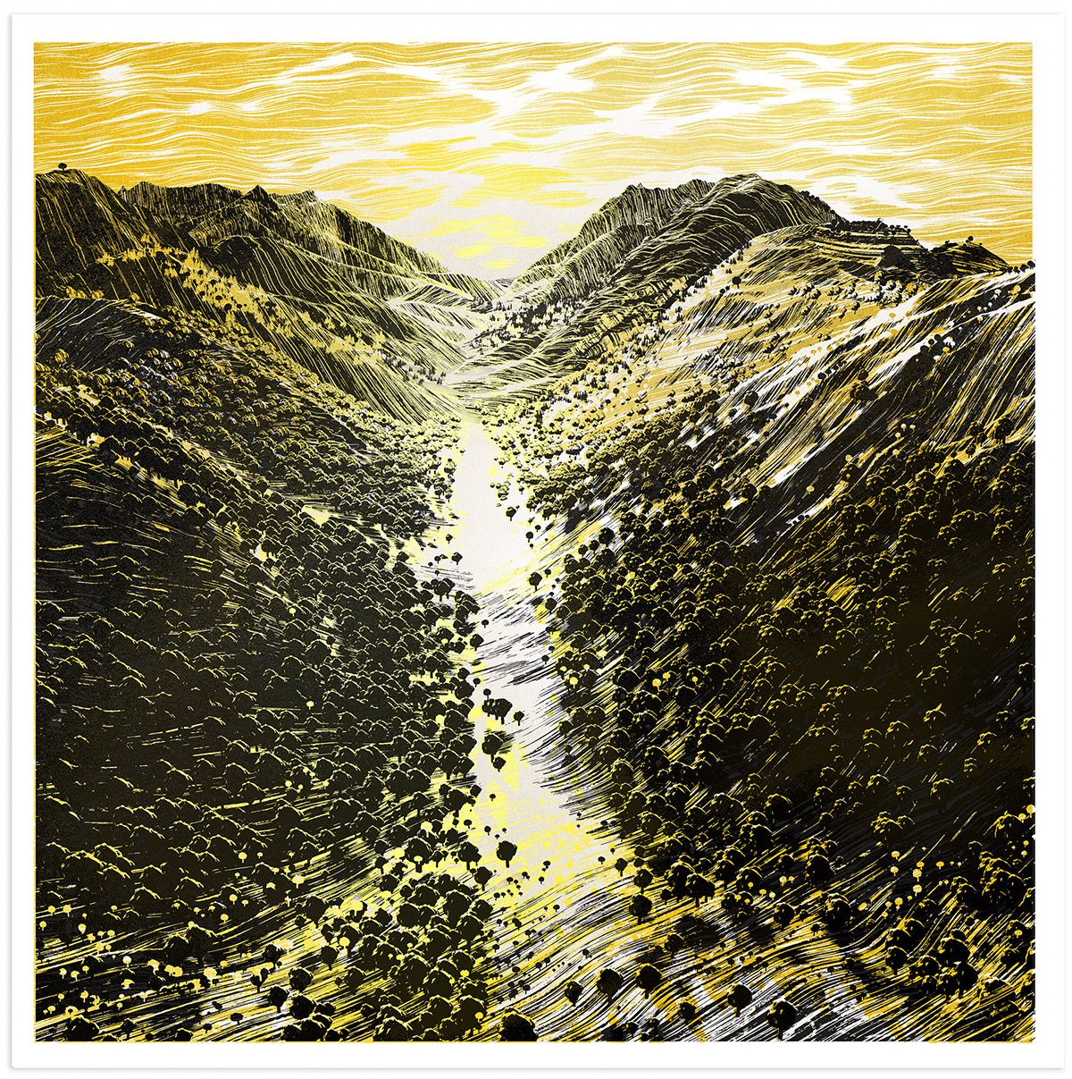 This is a metallic and Black Two colour screen print. The lines create an overlapping positive and negative landscape interweaving and overlapping metallic and black inked mark making. The Metallic under-layer enhances the interplay between the landscape and dynamic shafts of light interweaving in and out of the trees and