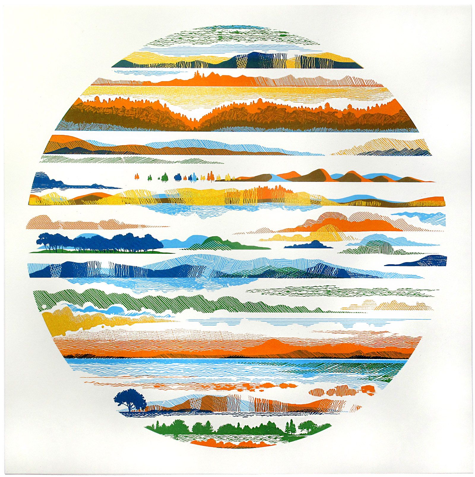 Vantage point by Chris Keegan. This Five colour handmade screen print depicts a multi-layered dynamic set of landscapes all floating above and below each other. Created is an image of rolling hills overlapping and interweaving in layers of colour creating an alternative take on the classic landscape. Limited edition of 50.