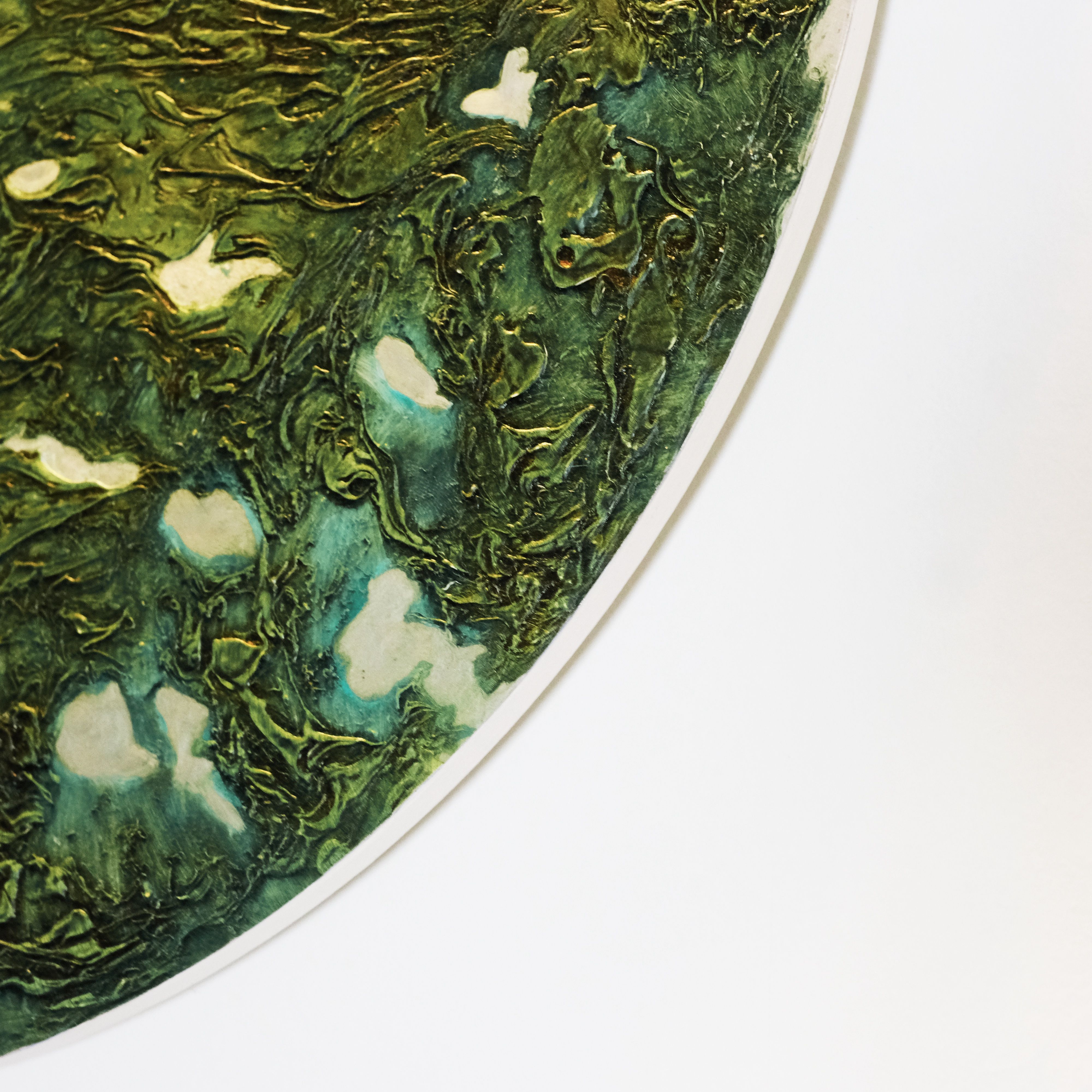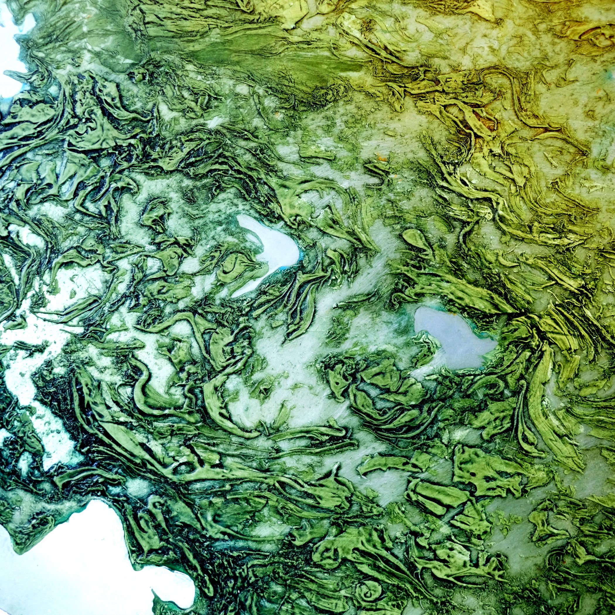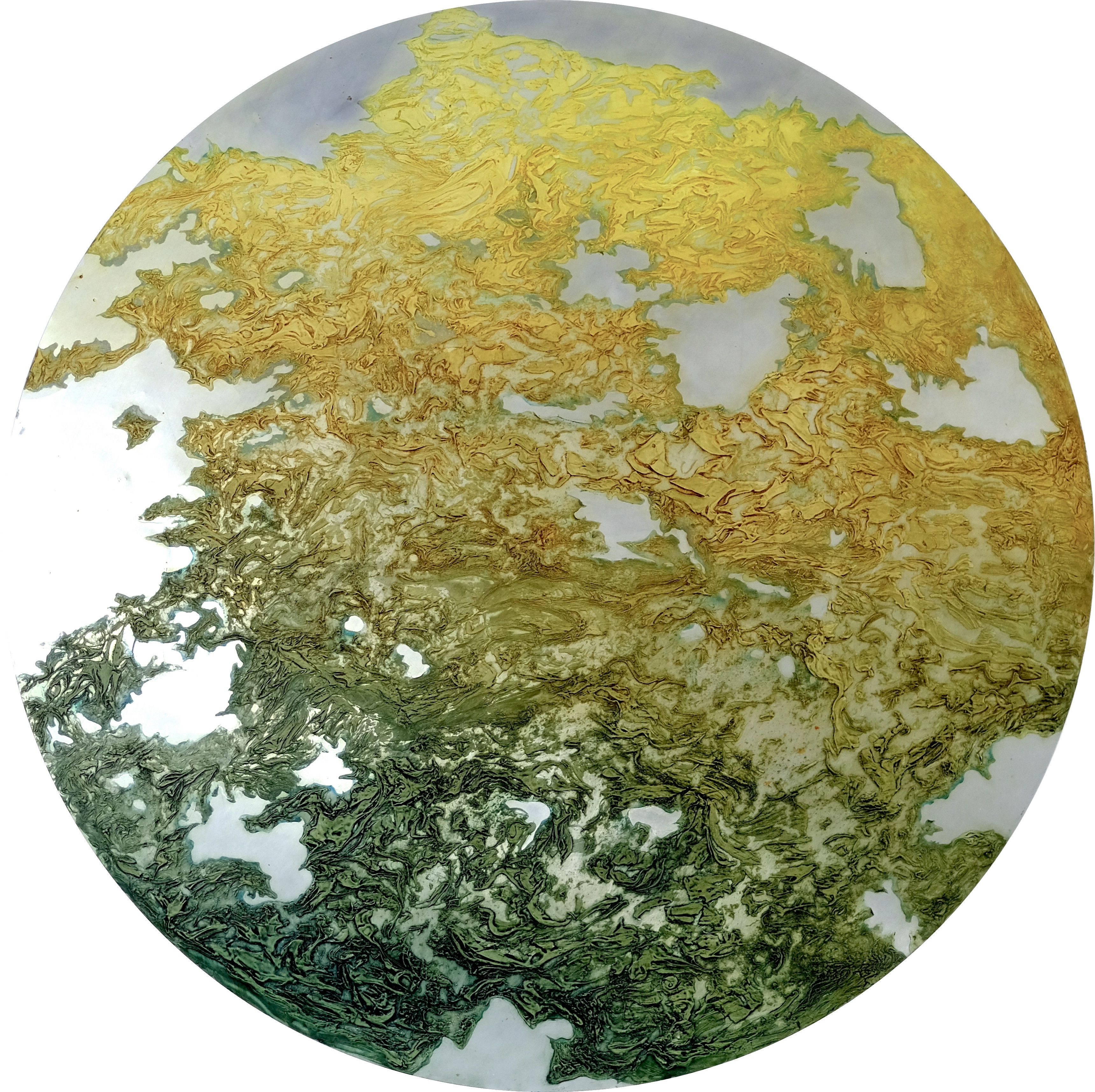 Inspired by the landscape, my new series of paintings present both a micro (snail's view) and macro (bird's eye aerial view) of nature revealing the textures and colours found in grass, ponds and undulating hills. Painted on aluminium, the surface reflects a light that seems to be emitted from within
