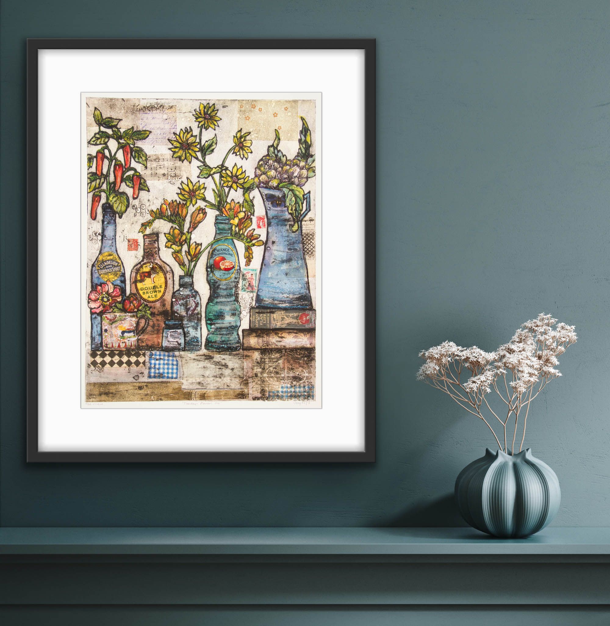 A long romance is a limited edition hand coloured unique collograph print by RBA artist Vicky Oldfield. The artist is renowned for her distinctive pictures; the subjects are the story of her fascination with life, whether a still life on a rainy day or a collection of found objects from