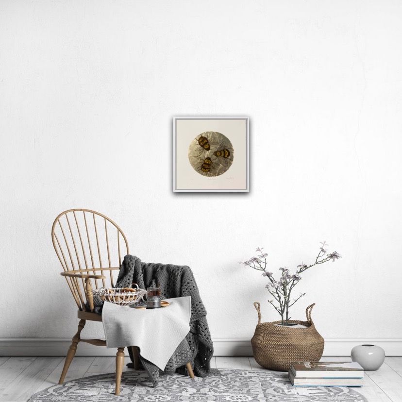 Vicky Oldfield Golden Bee Limited Edition Silkscreen Print with gold leaf Edition of 10 Image Size: H 35cm x W 35cm Sold Unframed Please note that in situ images are purely an indication of how a piece may look Golden Bees is a Limited edition screen print by Vicky Oldfield. The bright colours and beautiful detailing of