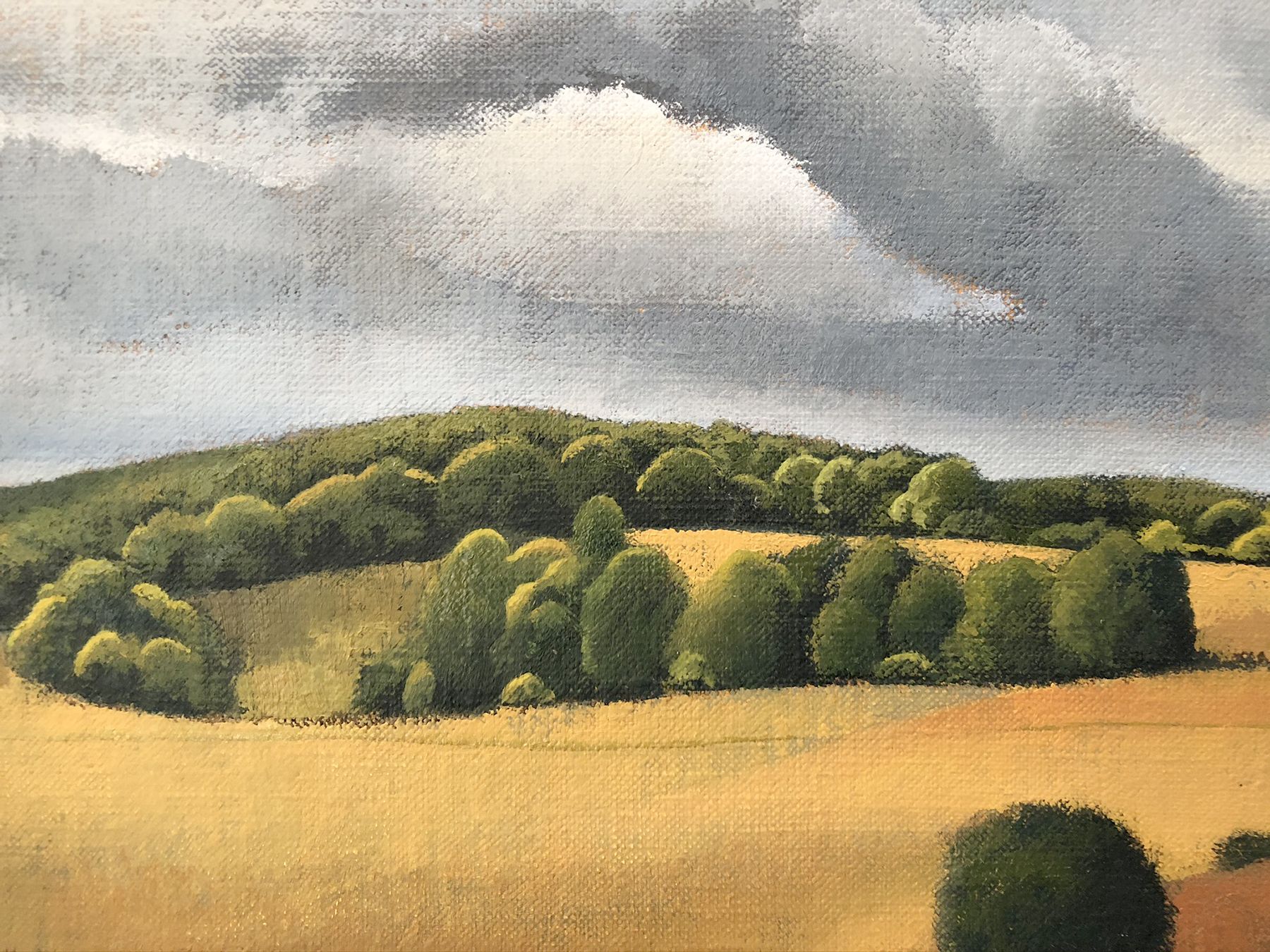View towards Ashridge woods from Pitstone Hill in the Chilterns by Tim Woodcock-Jones Oil on canvas, signed at the bottom right. Painting comes unframed