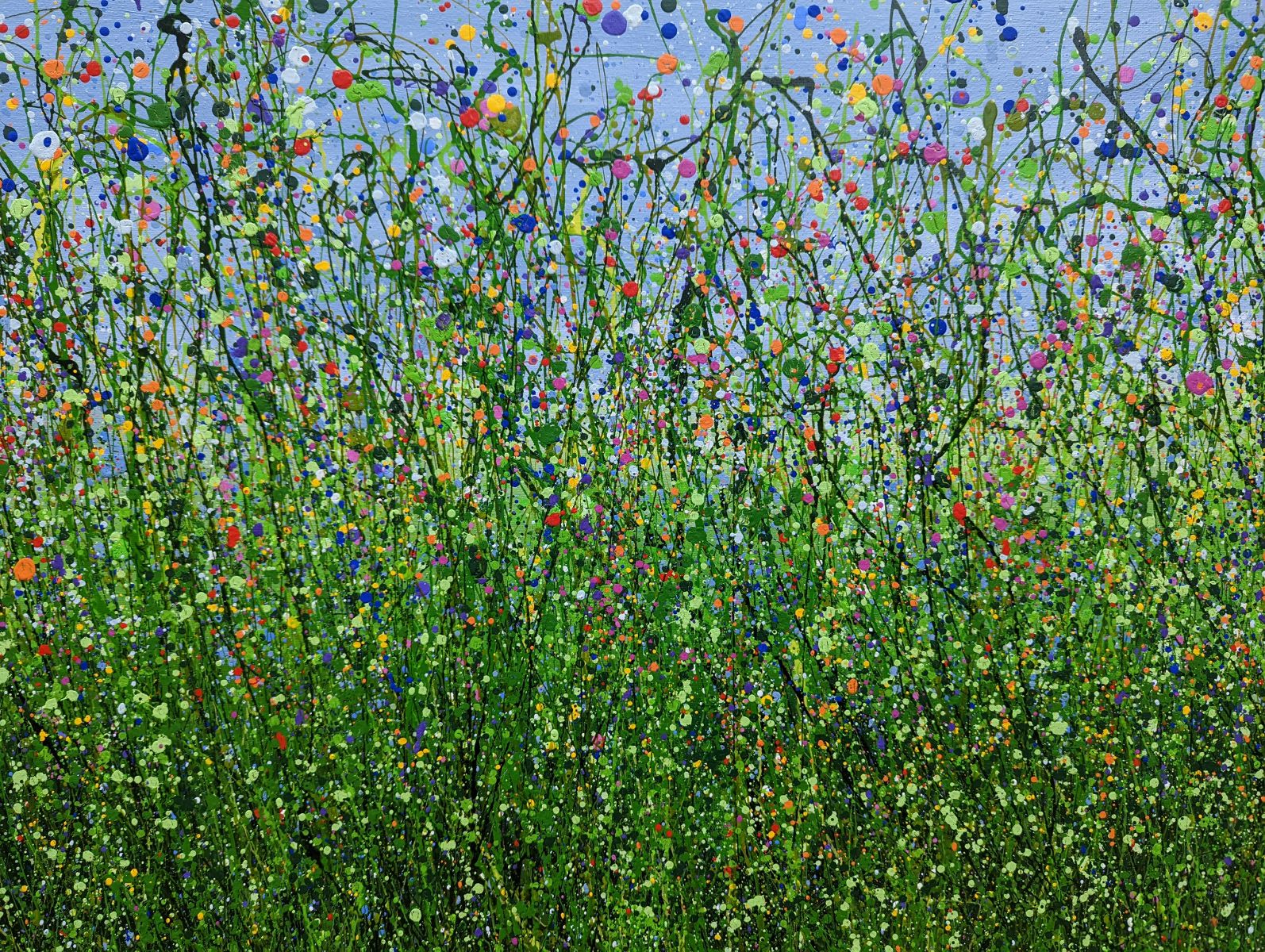 Walking Back to Happiness #3 - the painting is continued round the edges. An Original semi-abstract painting by Lucy Moore. Using her signature string grass technique Lucy has created a semi-abstract twist to her classic meadow paintings. Colourful pastels flowers beneath a sunlit skyline. This piece would brighten any home