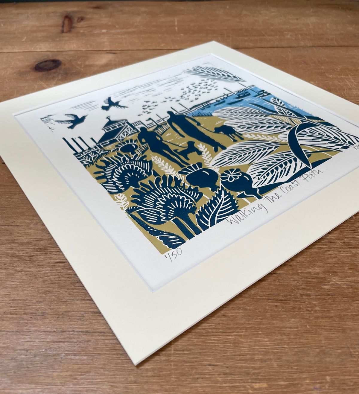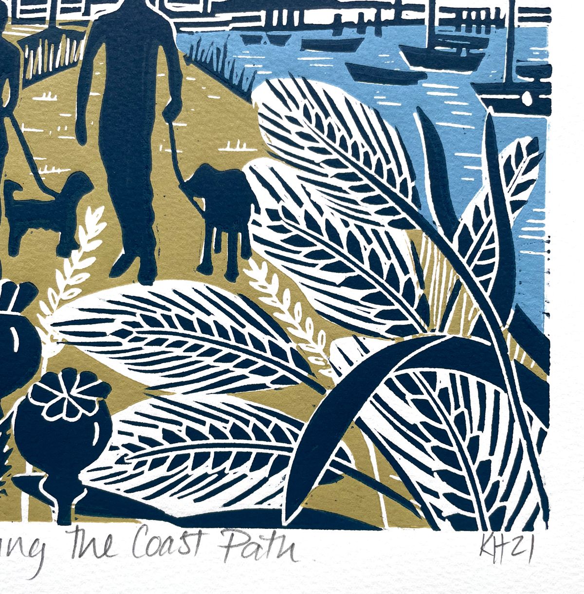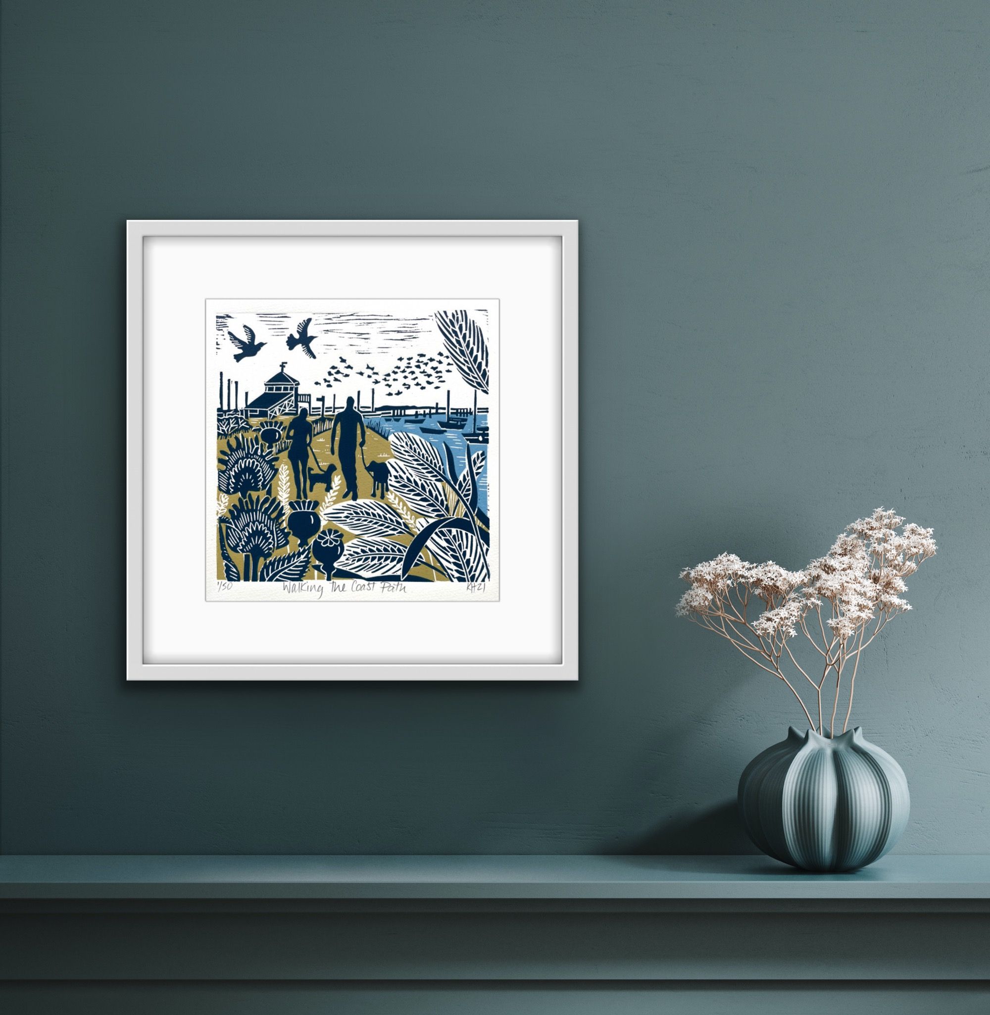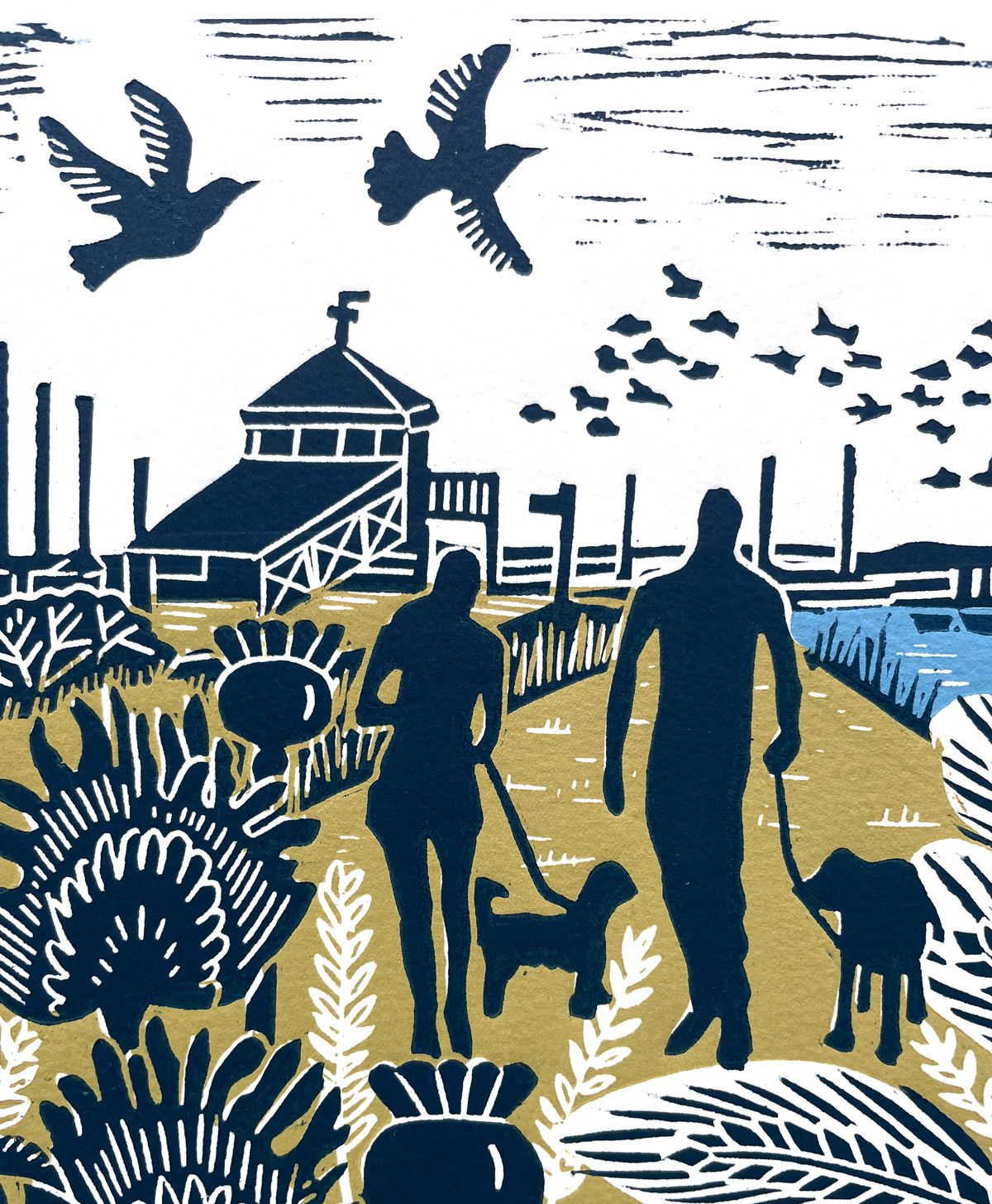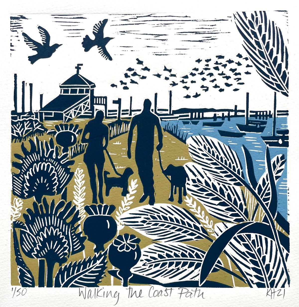 THIS WORK IS NOW COMPLETELY OUT OF STOCK, PLEASE SEE THE ARTIST'S OTHER AVAILABLE WORKS This hand made linocut print features a couple walking their dogs along the coastal path at Morston in Norfolk. There is a murmuration of starlings flying over the quay and the look out tower in the