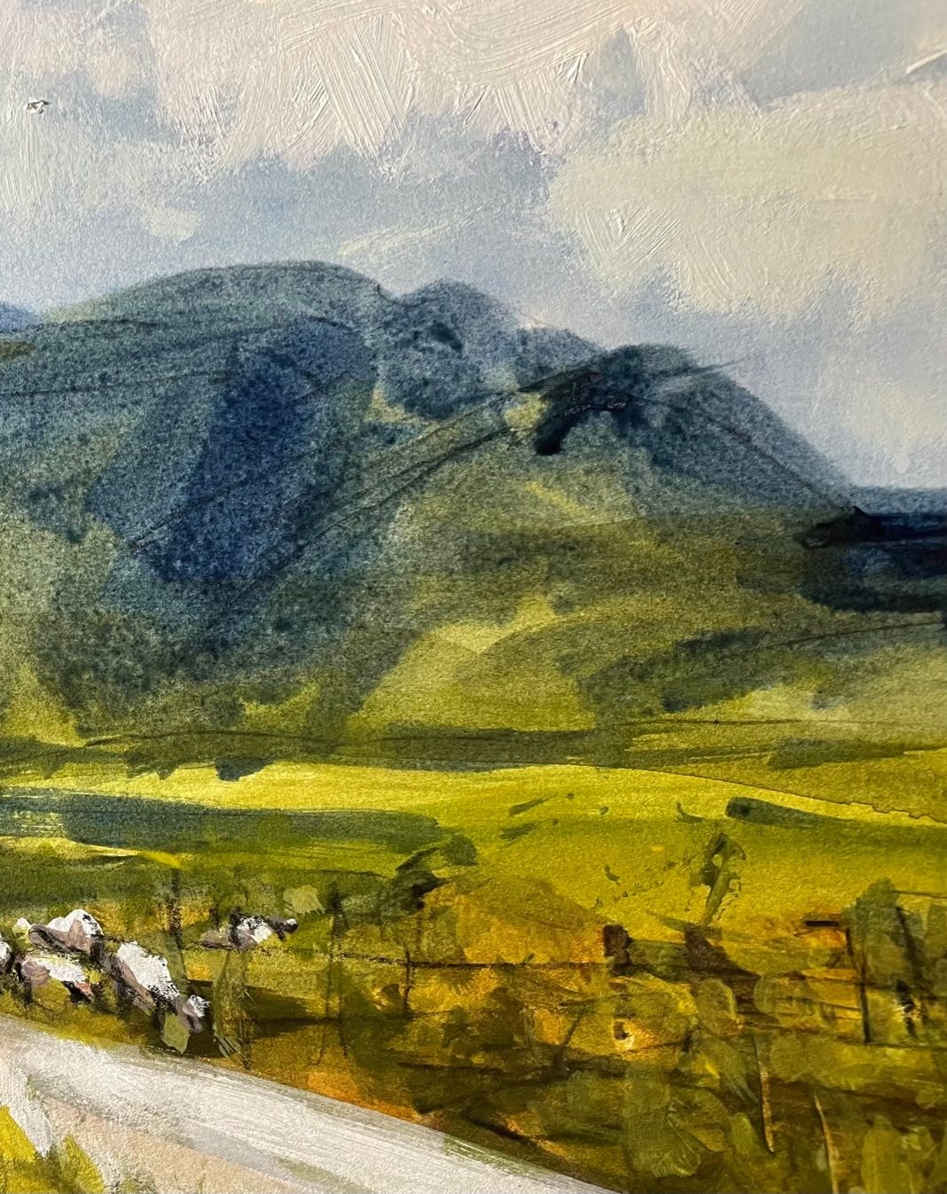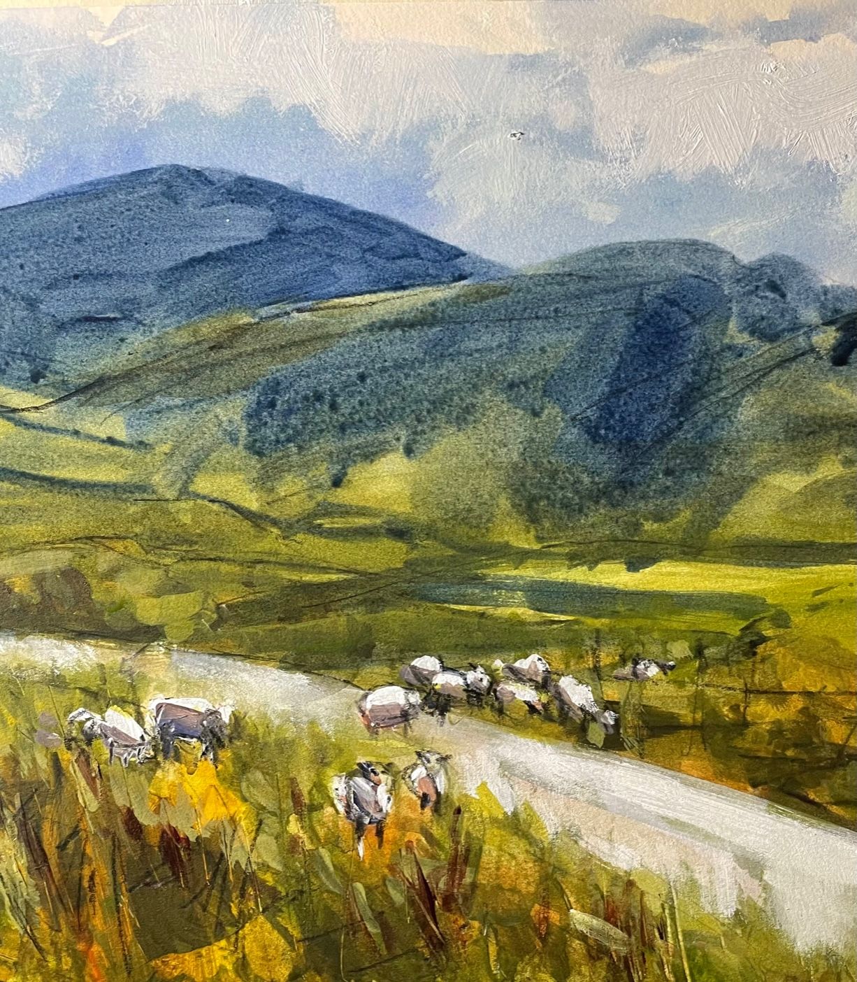 Acrylic and pencil on 300 gsm Fabriano paper. 30x40cm unframed. A Highland view of Ben Mohr, Scotland, with sheep.