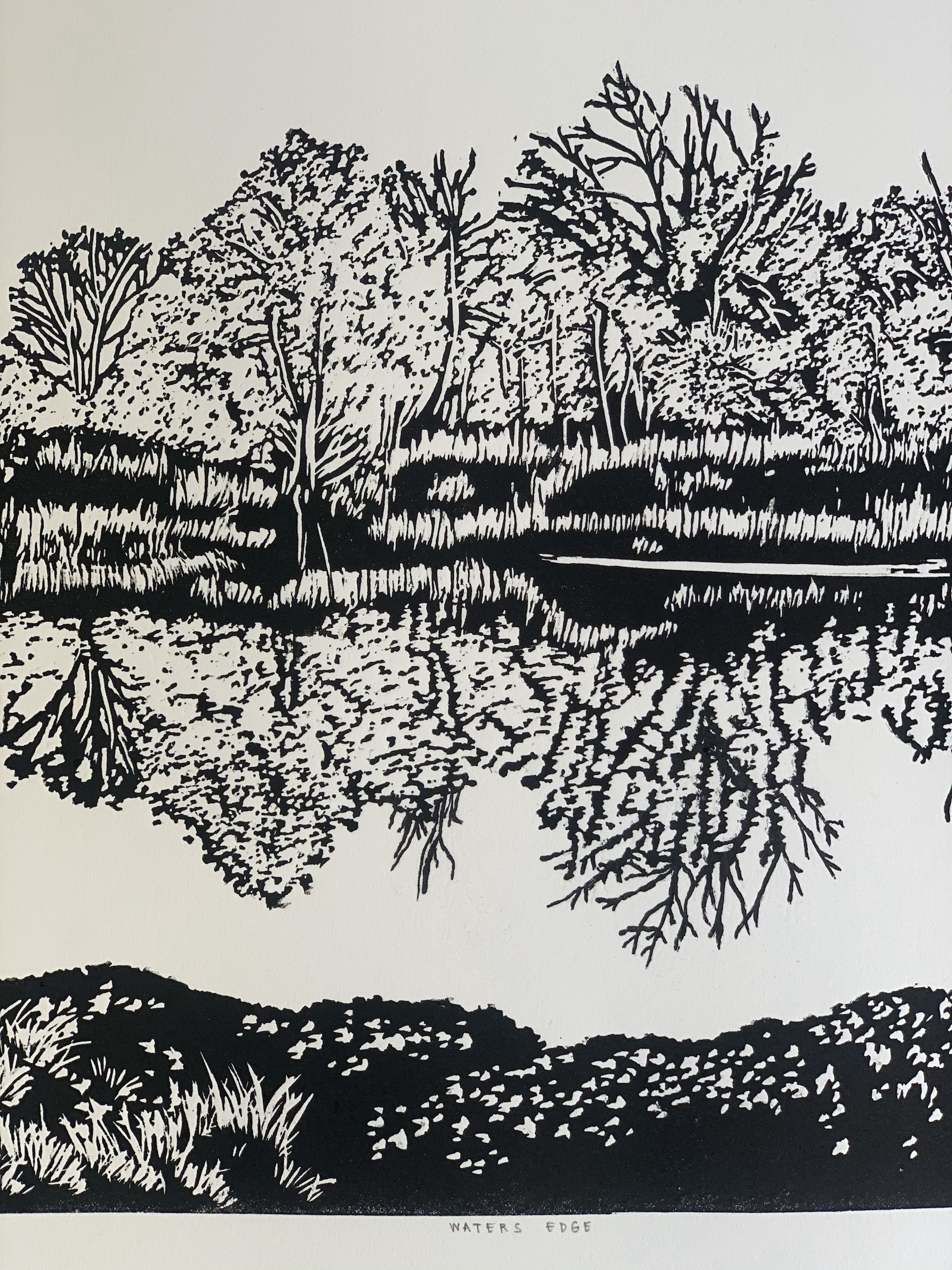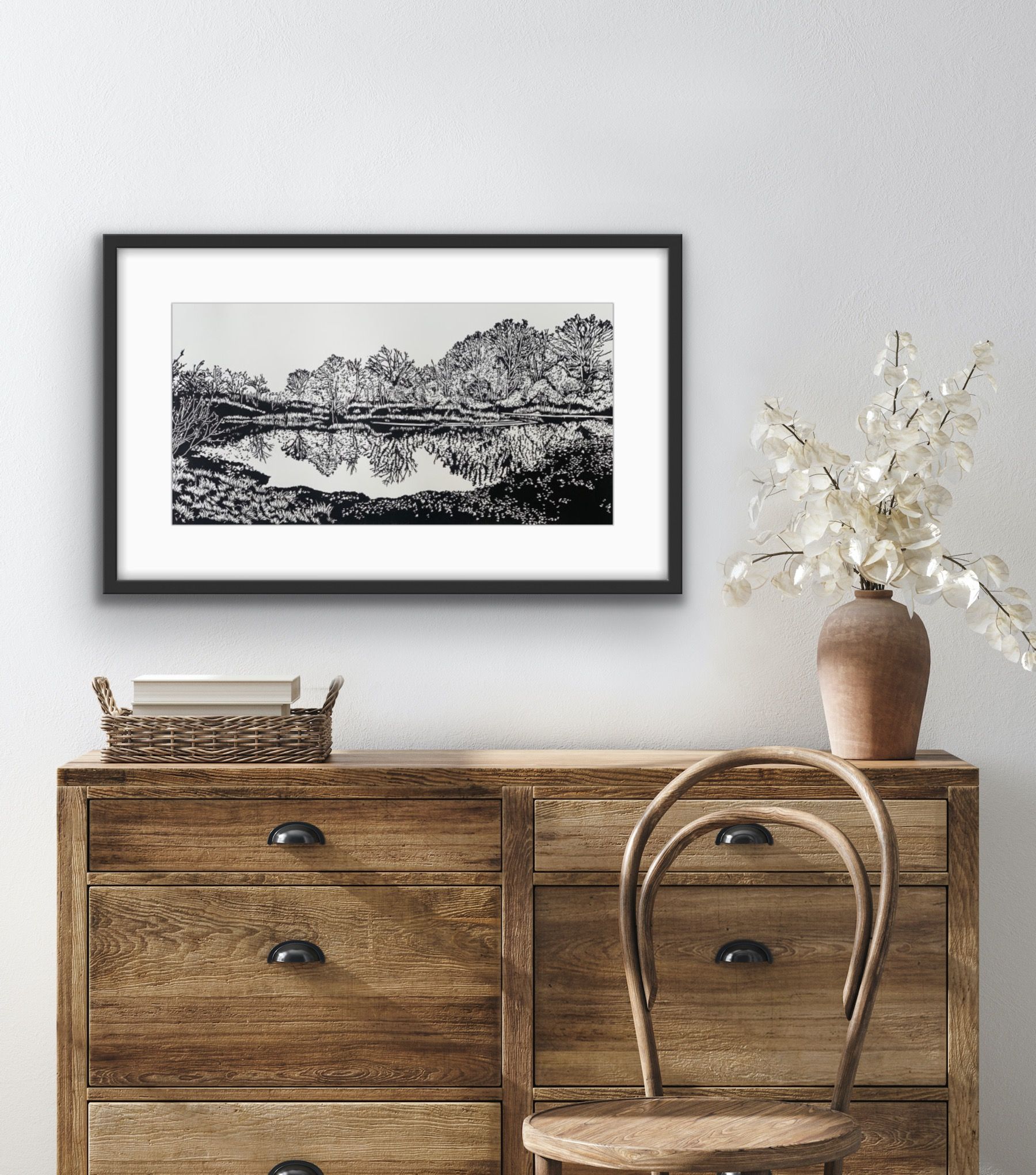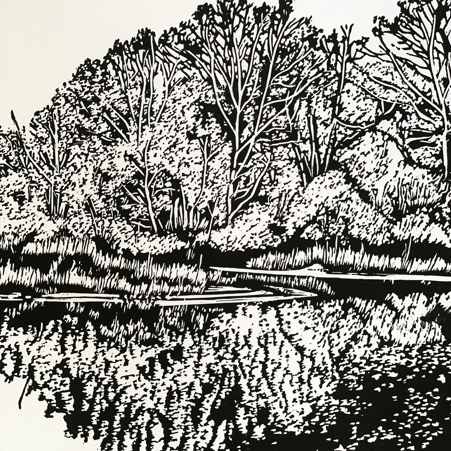 This is a black and white linocut version of the 10 colour reduction linocut ‘Autumn blaze’ The image depicts a pond in the Surrey hills during the height of Autumn. The print was pulled just prior to the final layer of cutting and inking. This image reflects a moment in